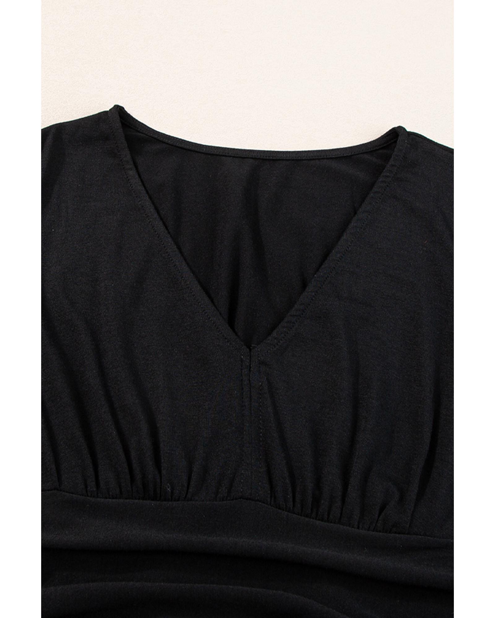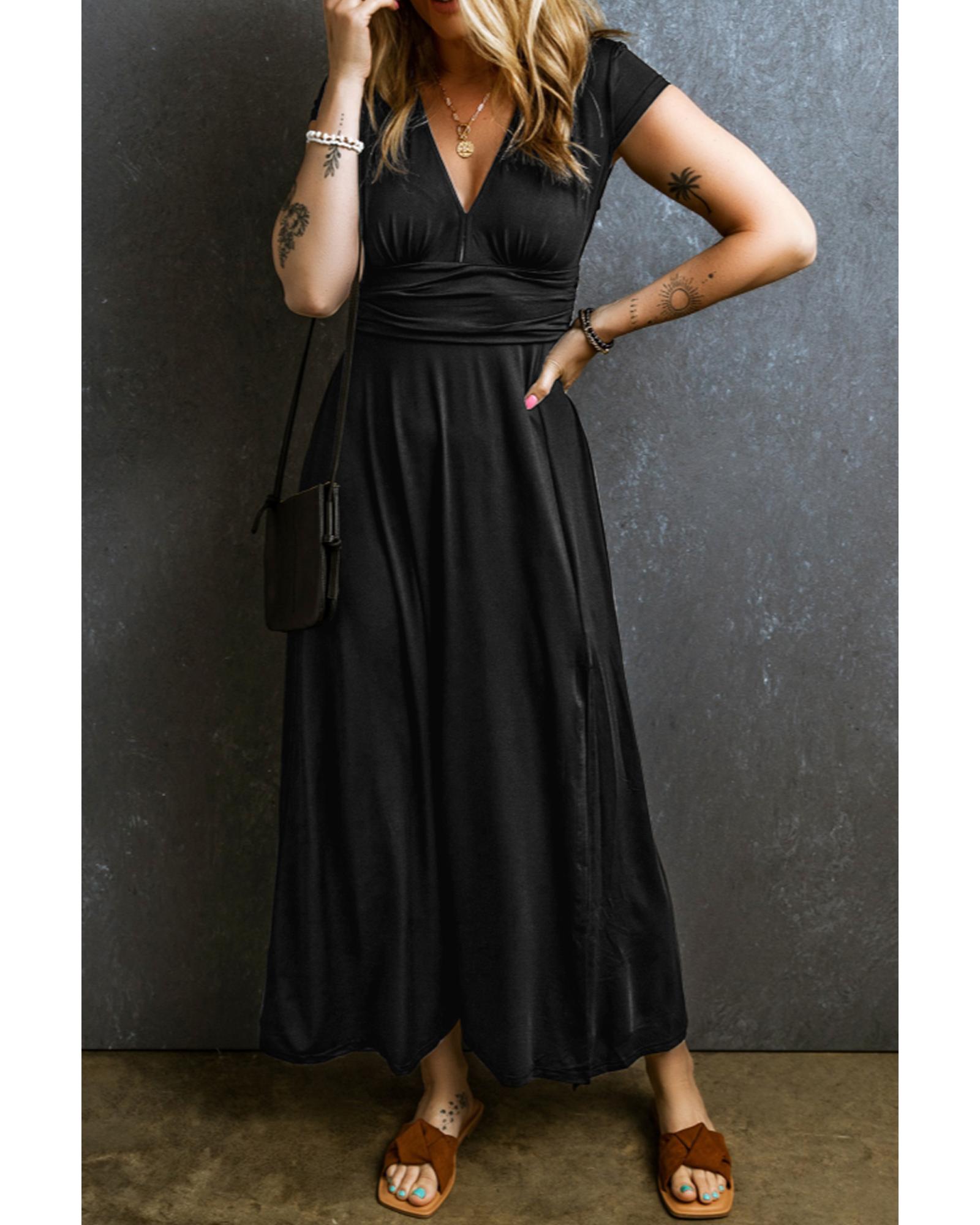 Black Short Sleeve Shirred High Waist V Neck Maxi Dress – S