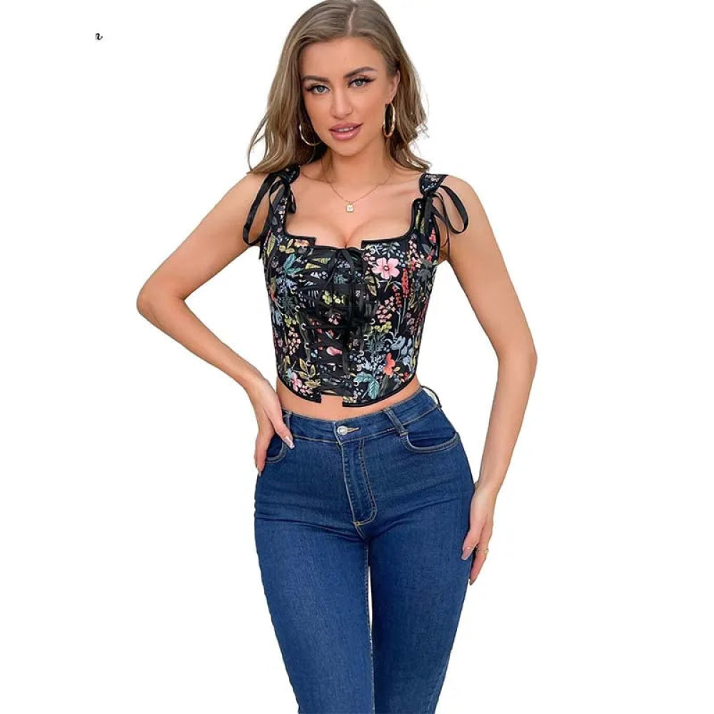 This slimming vest tank top for women features a stylish backless and sleeveless design, making it suitable for summer wear. It combines comfort with support, featuring a floral print and decorative front lacing. The vest is designed to provide a snug fit and enhance your silhouette for various occasions such as parties, dates, or everyday activities.