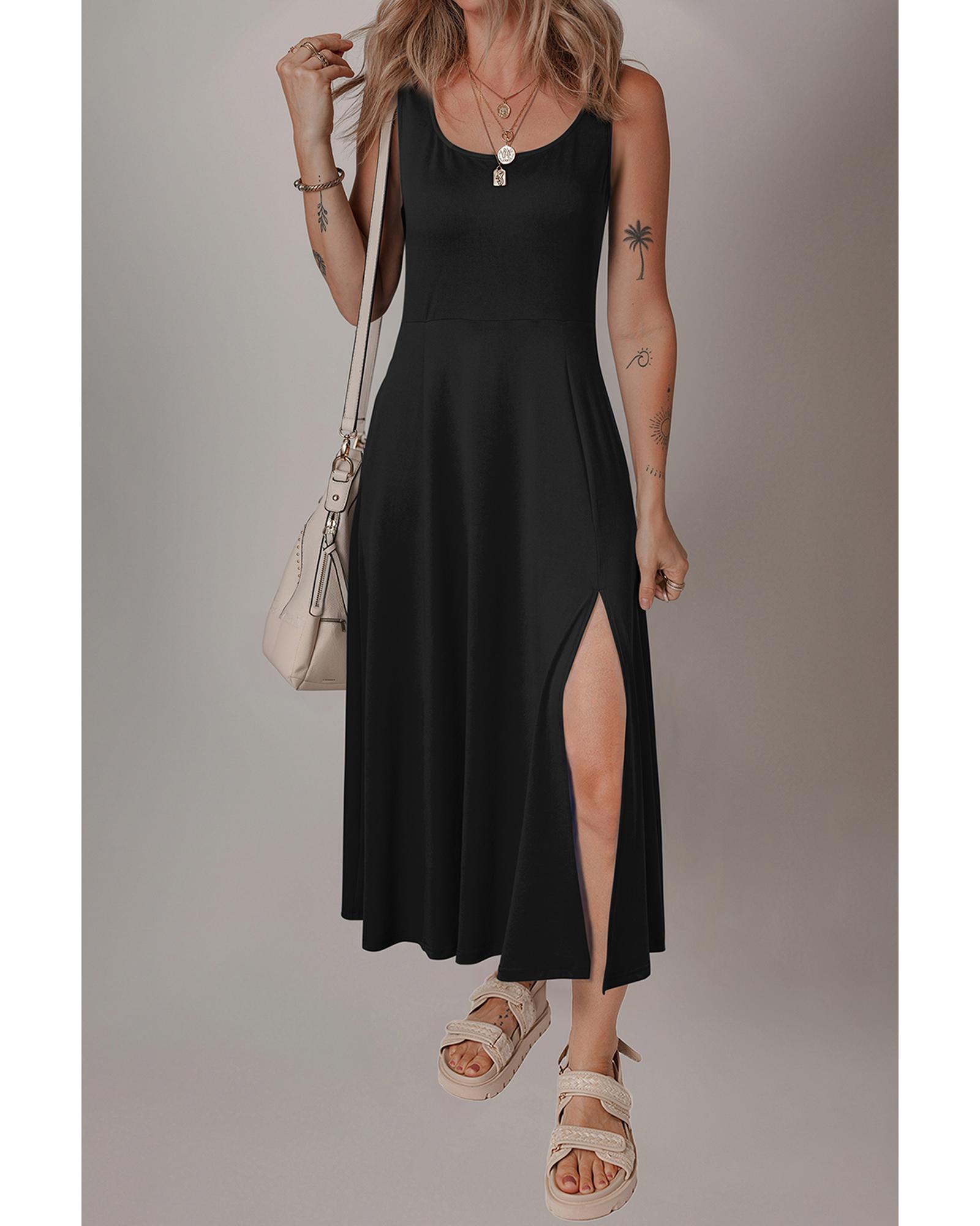 This black sleeveless midi dress features a classic scoop neck and a high waist design, creating a feminine and polished silhouette. The flared split adds an elegant touch, making it suitable for various occasions and versatile styling options.