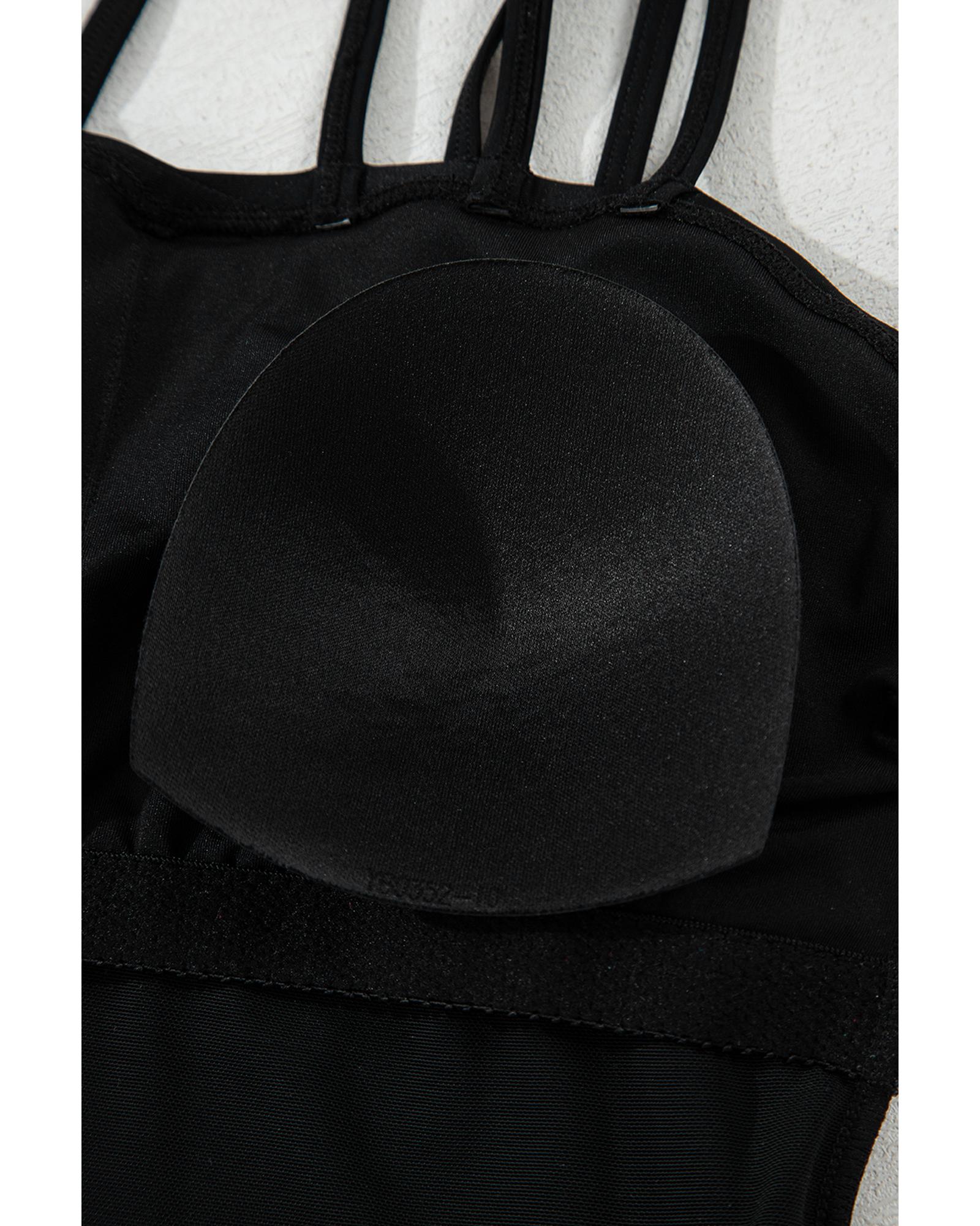 This black sleeveless one-piece swimsuit features a trendy fitted design with a strappy halter neck and a sweetheart neckline. It offers excellent coverage and is made from high-stretch fabric for comfort and flexibility. The swimsuit includes removable cup pads for customizable support, making it a stylish choice for swimwear.