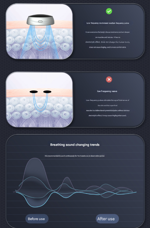 • Pulse Intervention: Emits gentle, low-frequency pulses to stimulate throat muscles without causing discomfort.