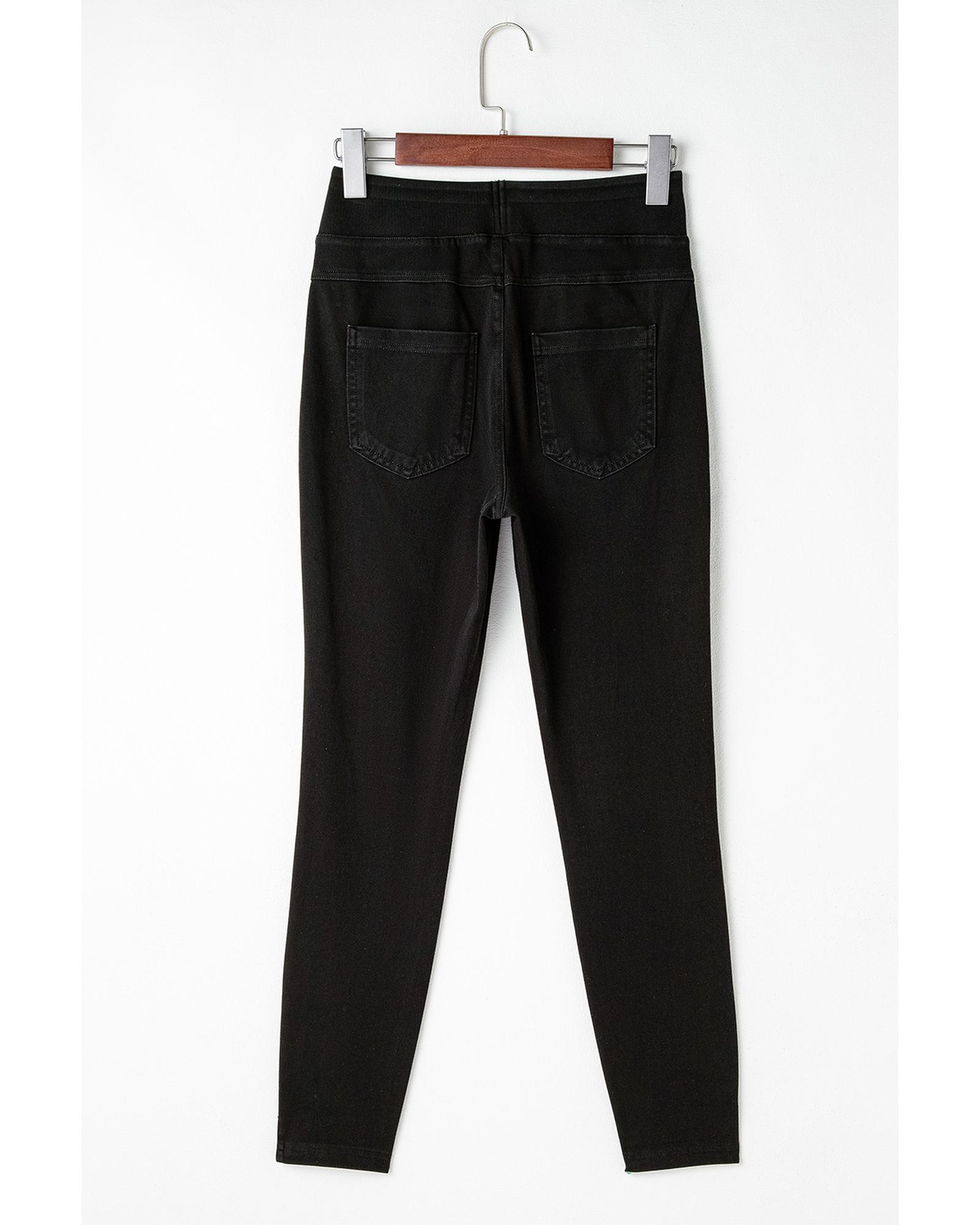 This pair of black jeggings features a high waist design that offers a flattering fit and a sleek silhouette. Made from a stretchy fabric blend, they provide maximum comfort and flexibility for everyday wear. The slim fit style is complemented by convenient back pockets, combining fashion with functionality.