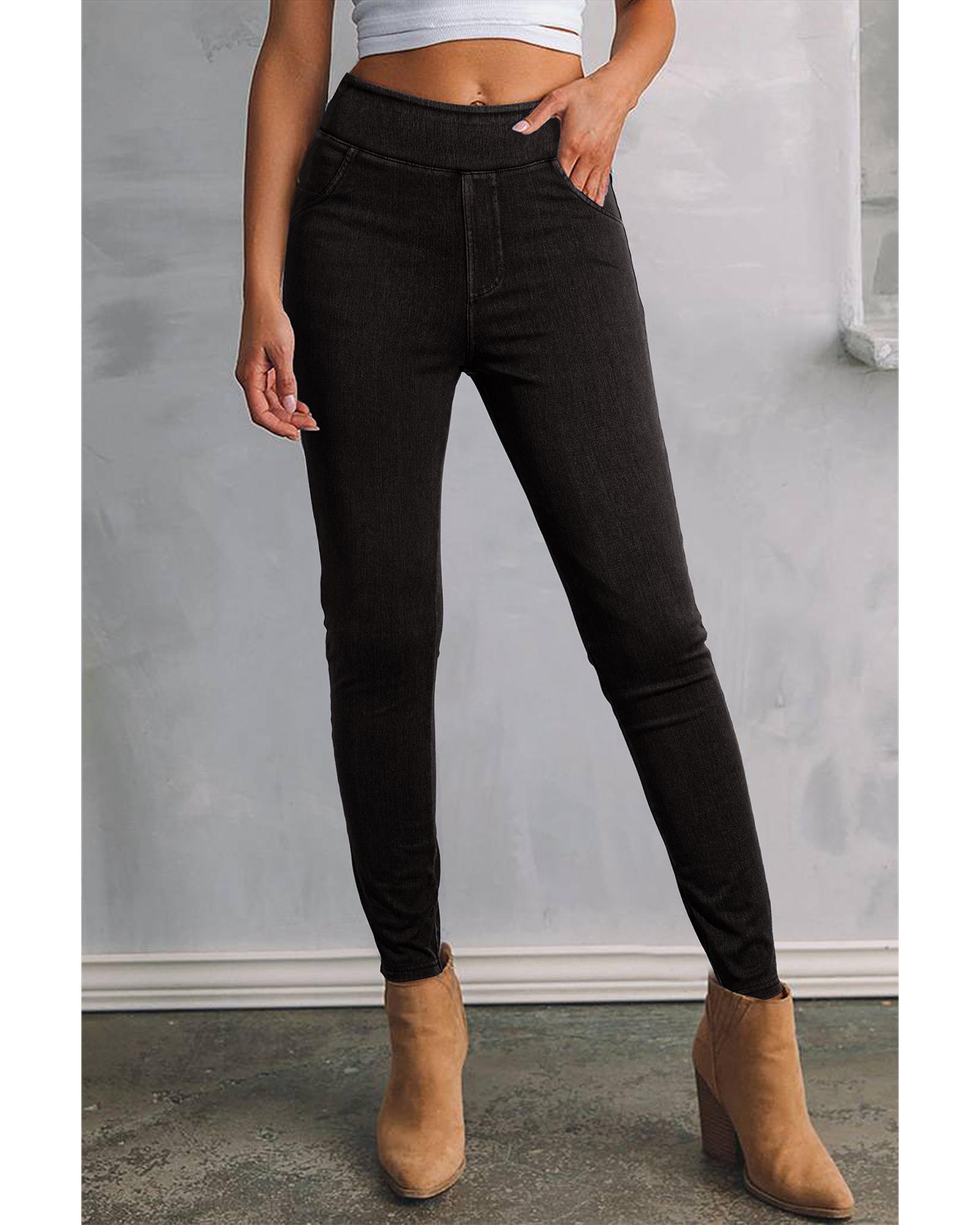 These black high waist jeggings are designed to provide a slim and flattering silhouette with a comfortable fit. Made from stretchy fabric, they offer ease of movement and a sleek appearance suitable for various casual and stylish outfits.