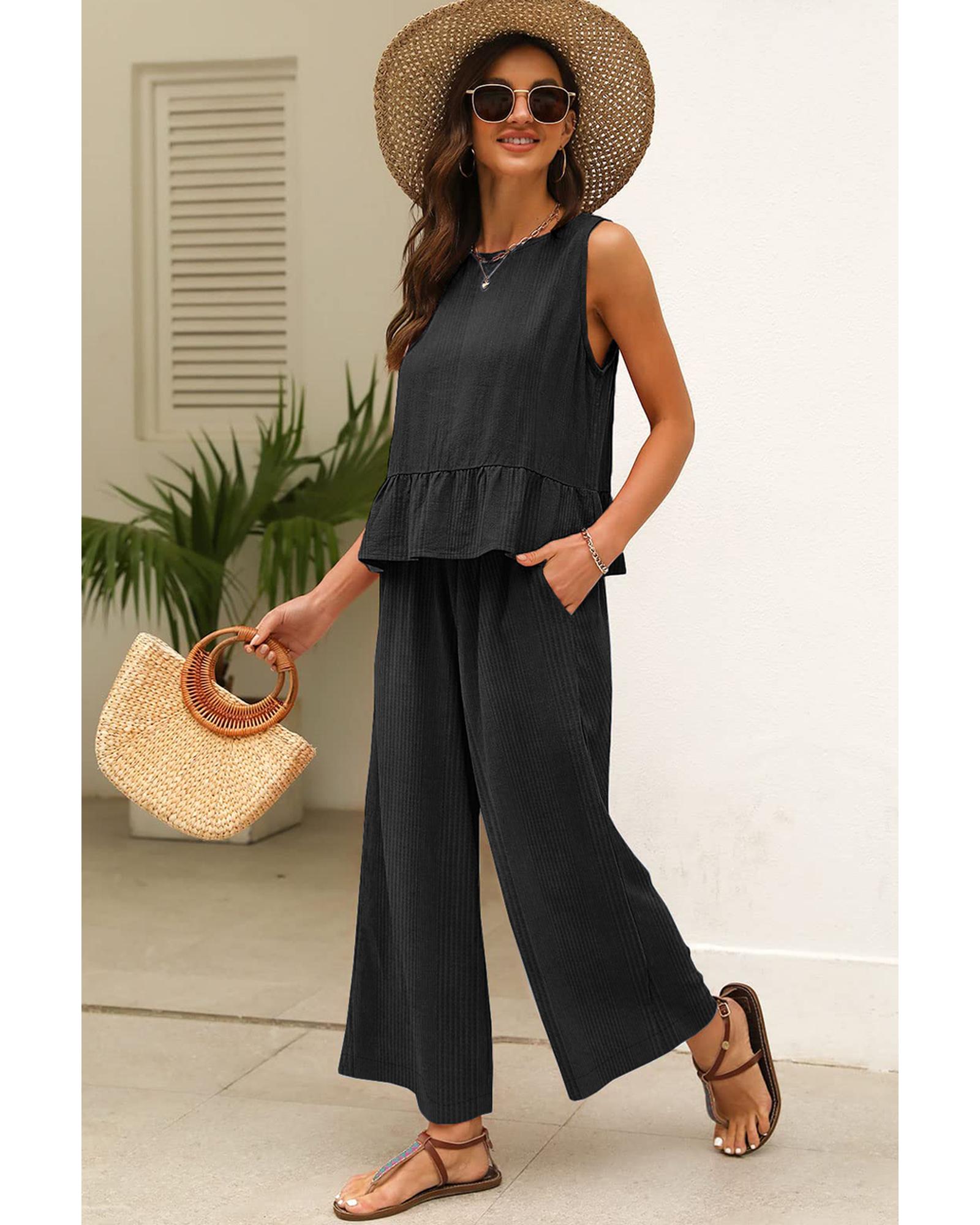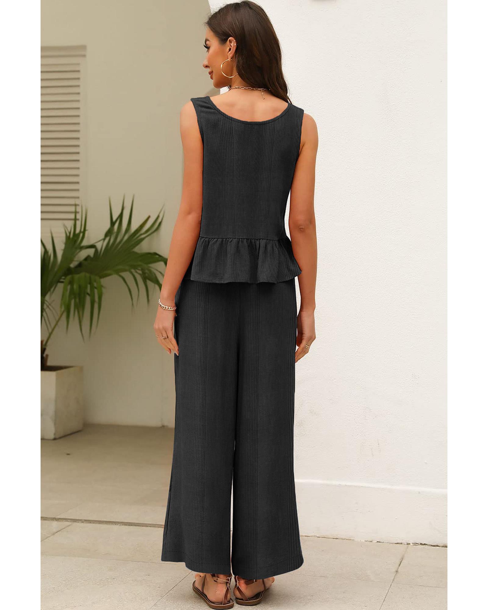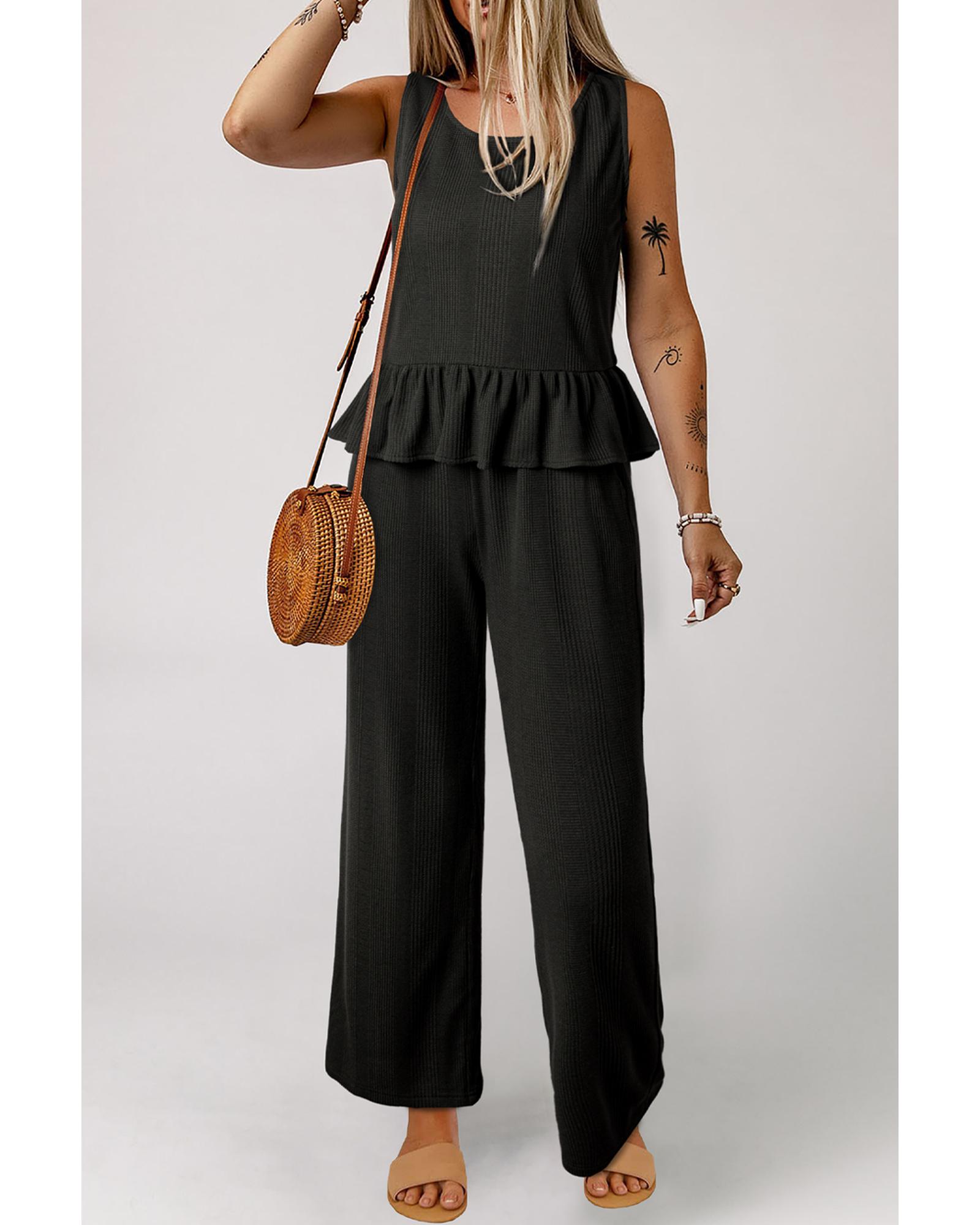 Black Solid Color Ribbed Ruffle Tank Top and Pants Set – XL