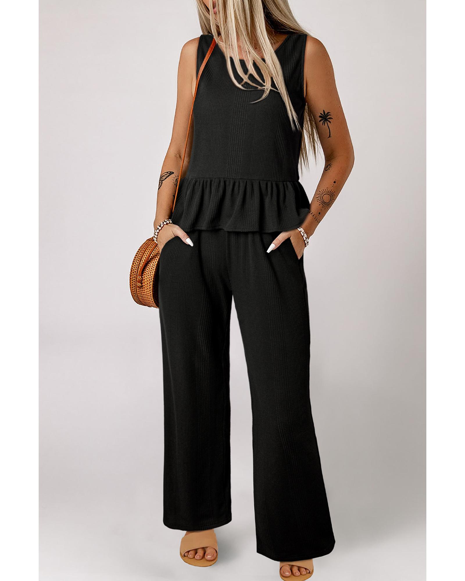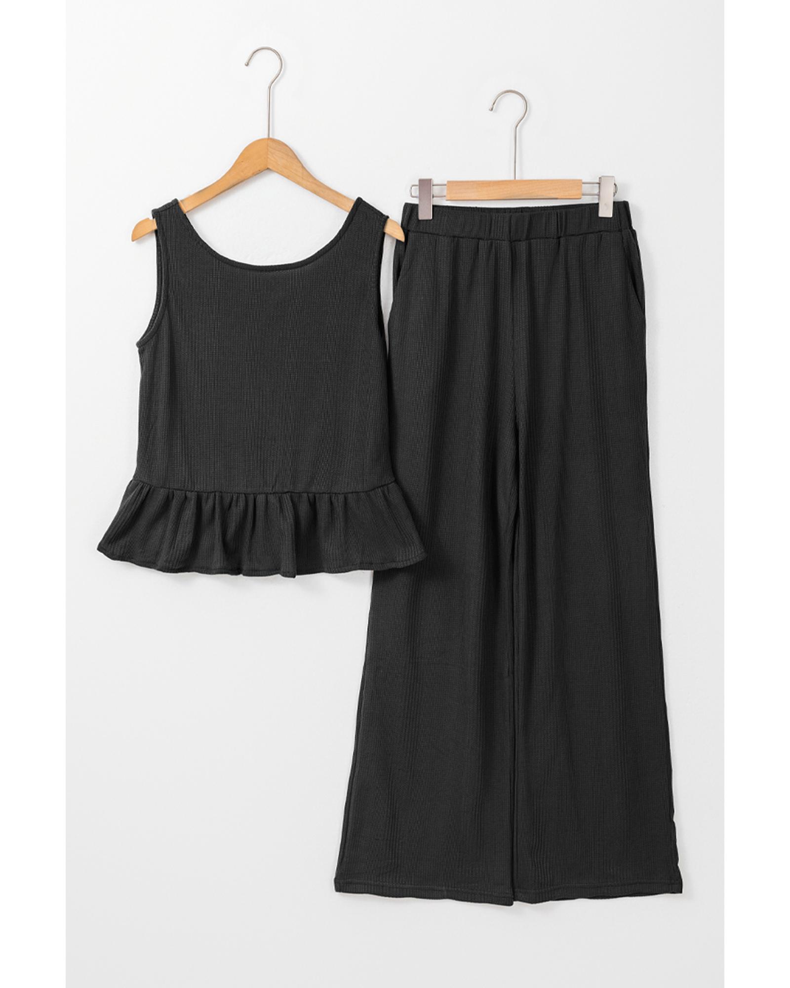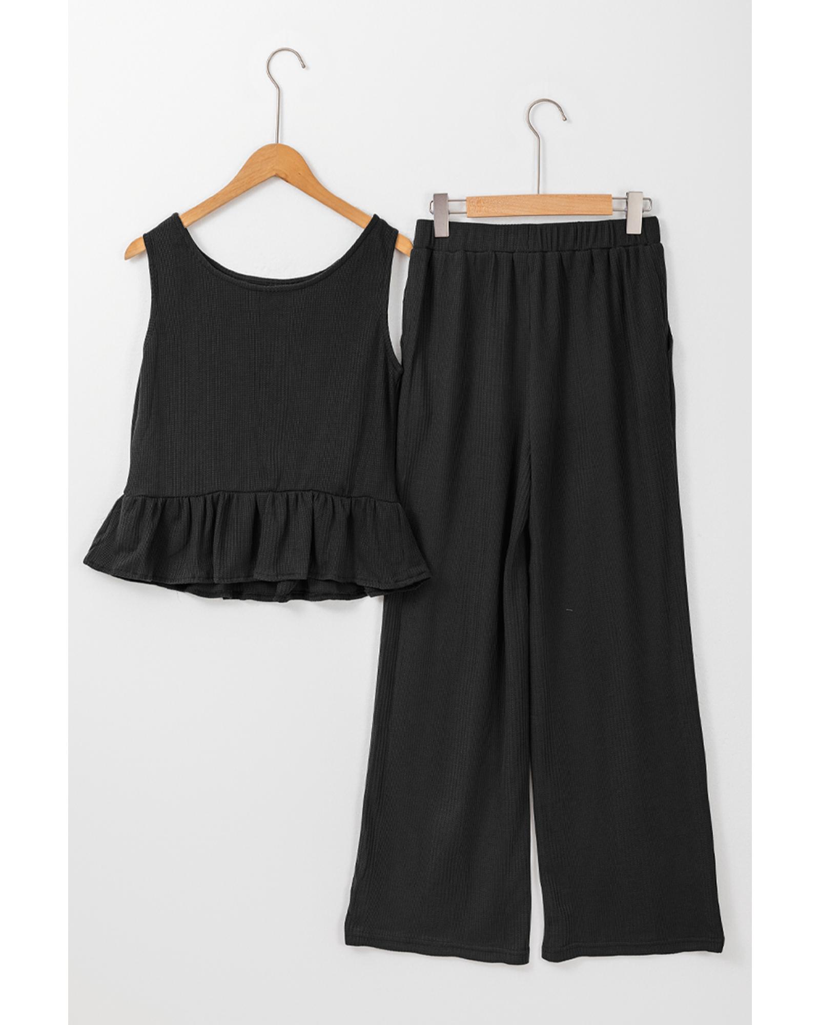 This black solid color ribbed ruffle tank top and pants set offers a versatile and stylish option suitable for various occasions. The ribbed texture adds visual interest, while the ruffled hem on the tank top provides a playful and romantic touch. The sleeveless design makes it easy to layer and adapt to different weather conditions.