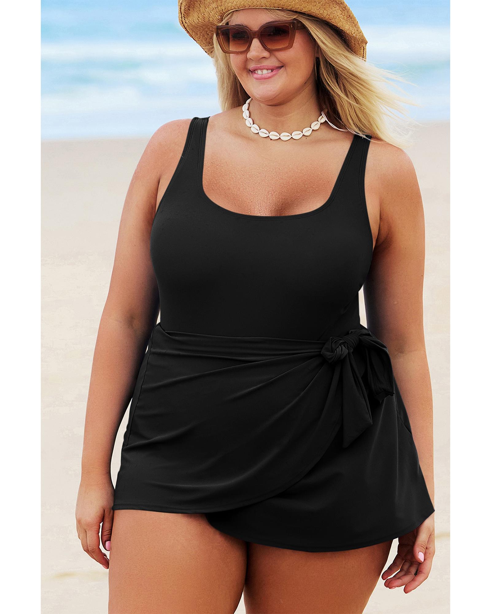 Black Solid Color Square Neck Knotted Plus Size One Piece Swimsuit – 4X