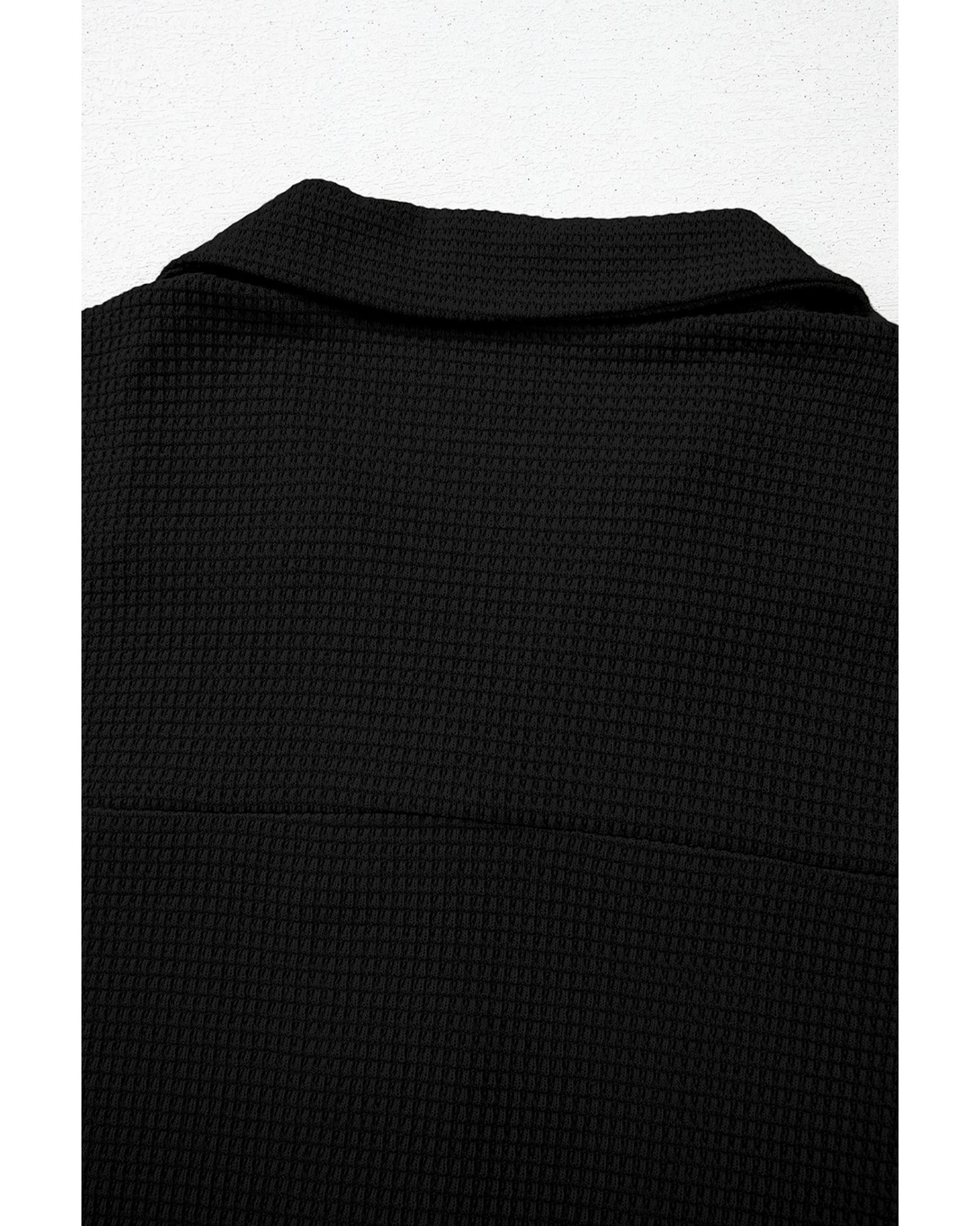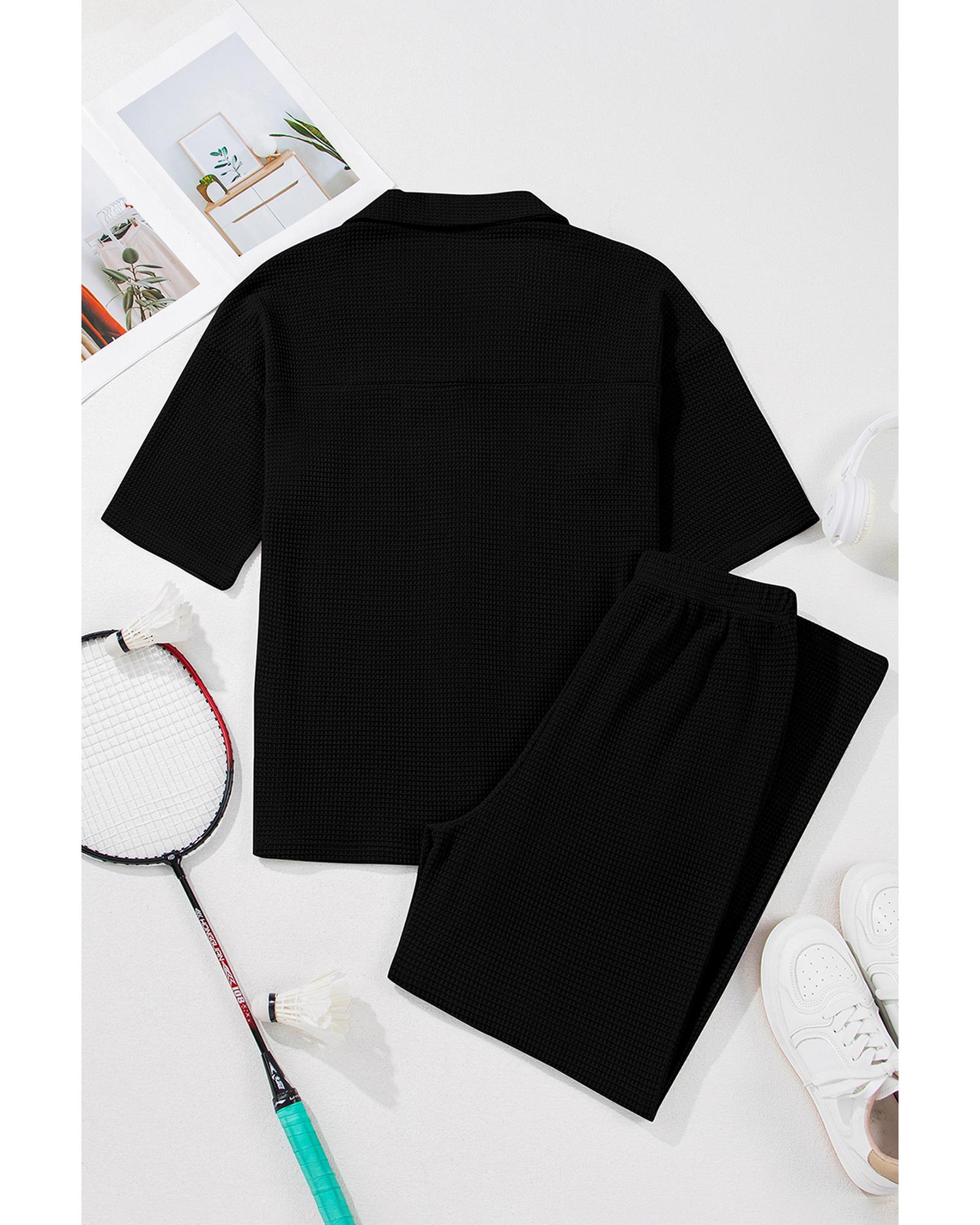 Black Solid Color Textured Buttoned Shirt and Casual Pants Set – M