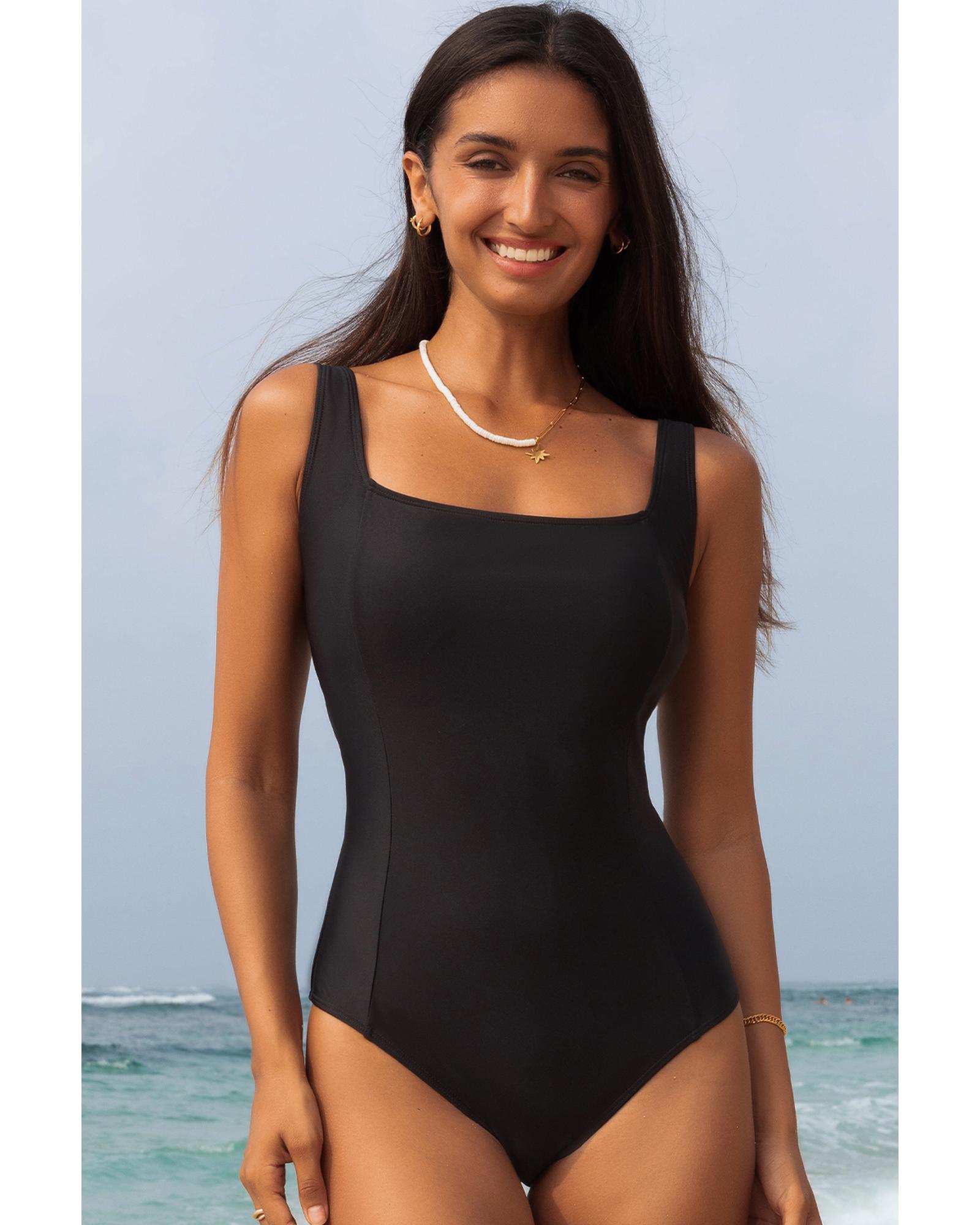 This black solid crisscross backless square neck one-piece swimsuit offers a stylish and modern design. It features a sleek silhouette with eye-catching back detailing, providing both comfort and a flattering fit. Made from high-elasticity materials, it ensures ease of movement and durability.