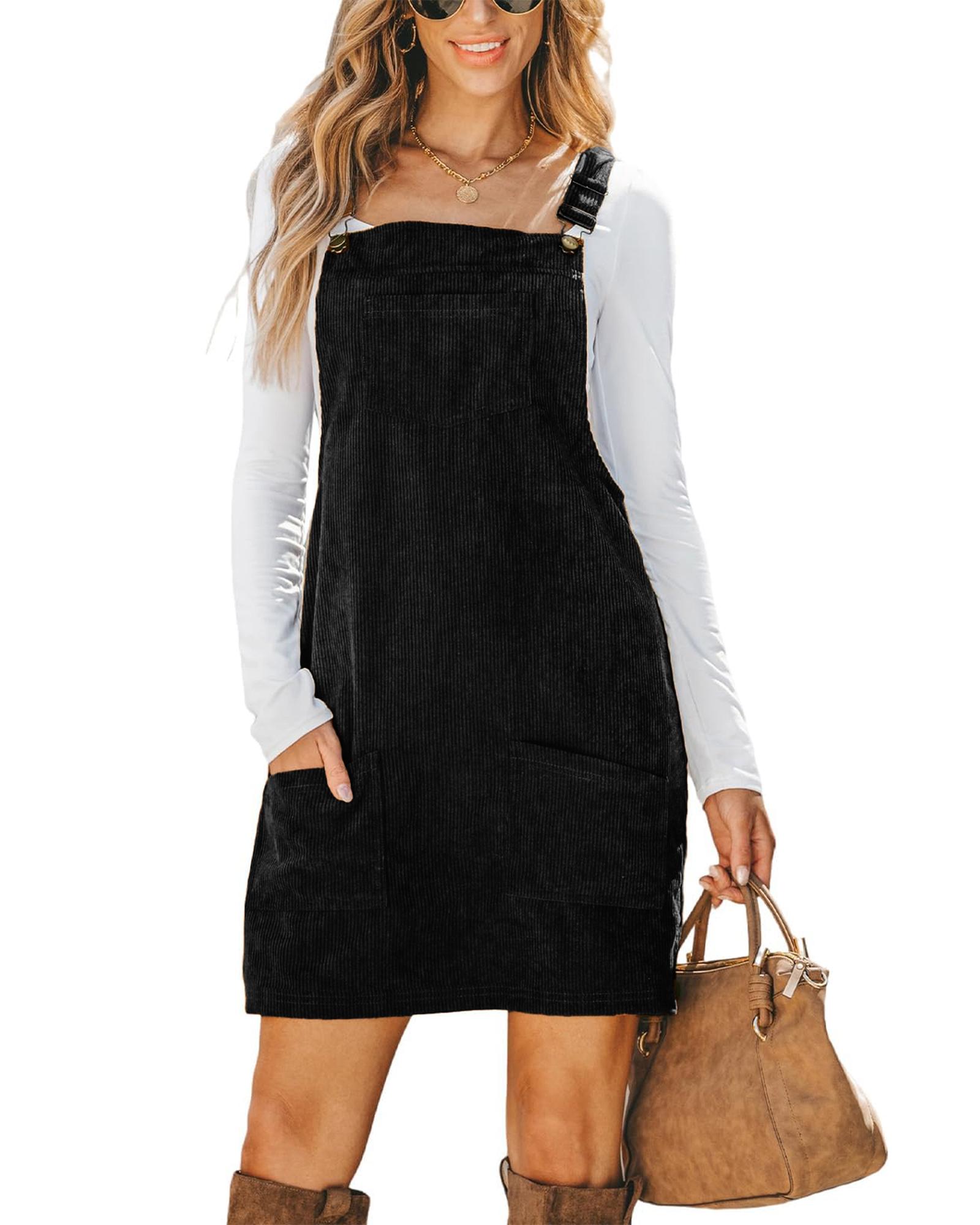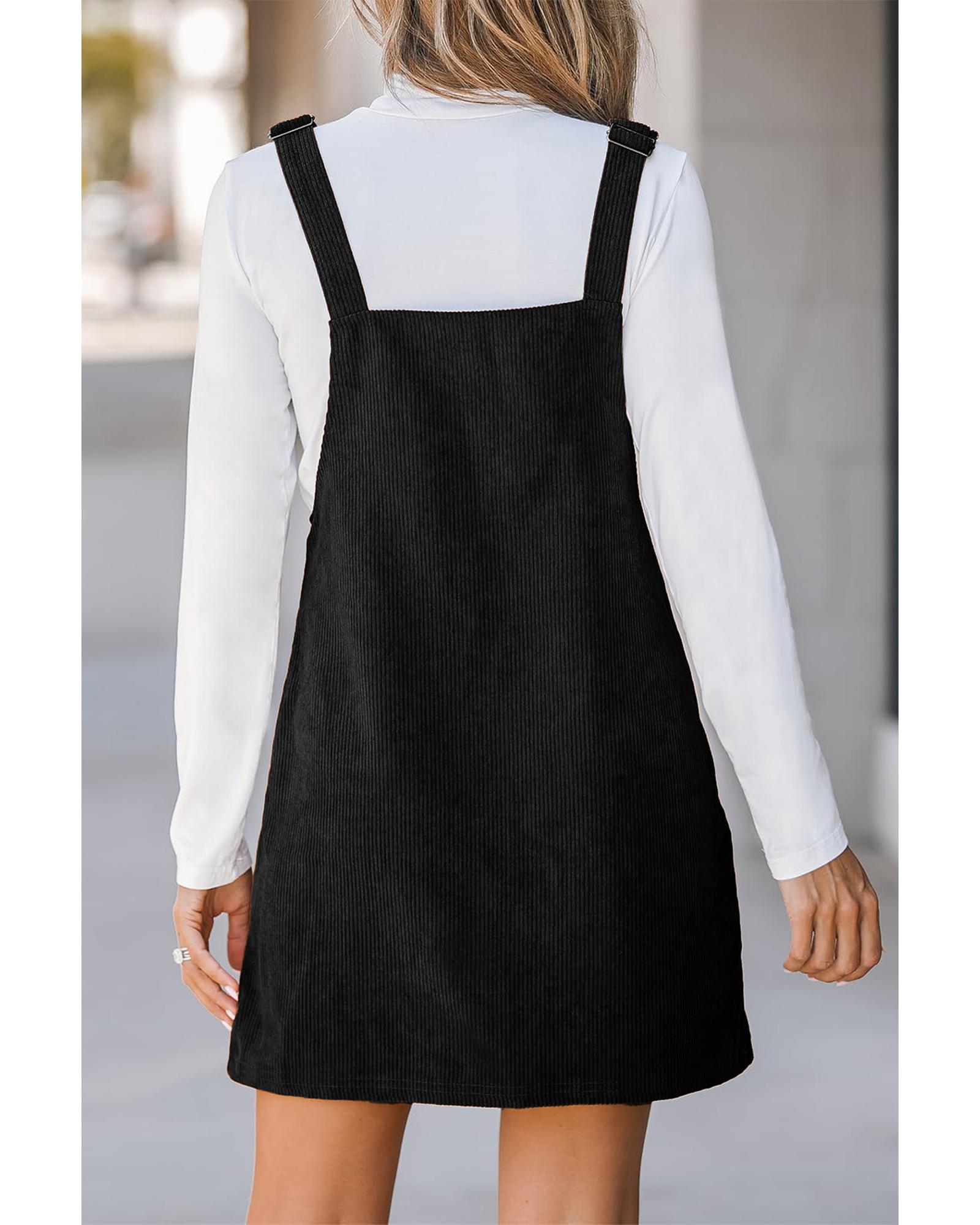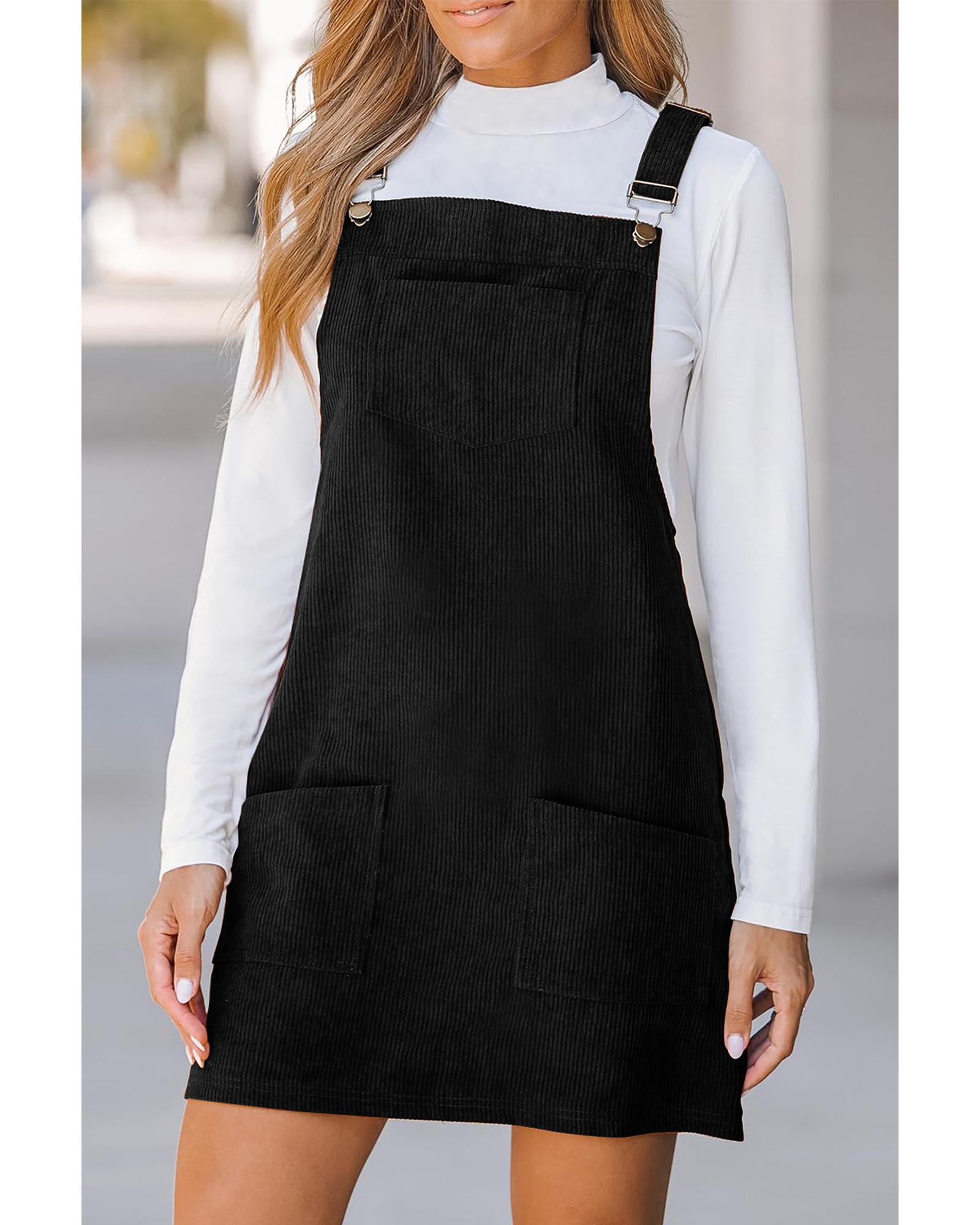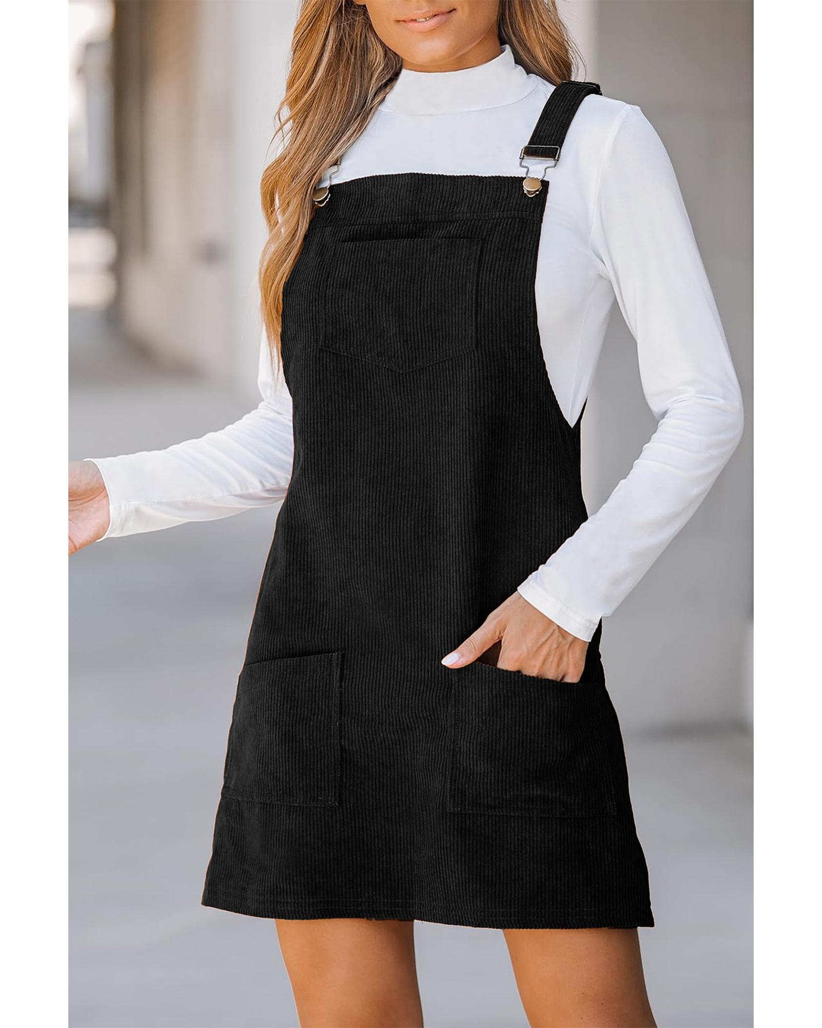 This sleeveless corduroy overall dress features a classic black solid color with front pockets, combining style and practicality. Its timeless design makes it suitable for various occasions, offering both comfort and a fashionable look.