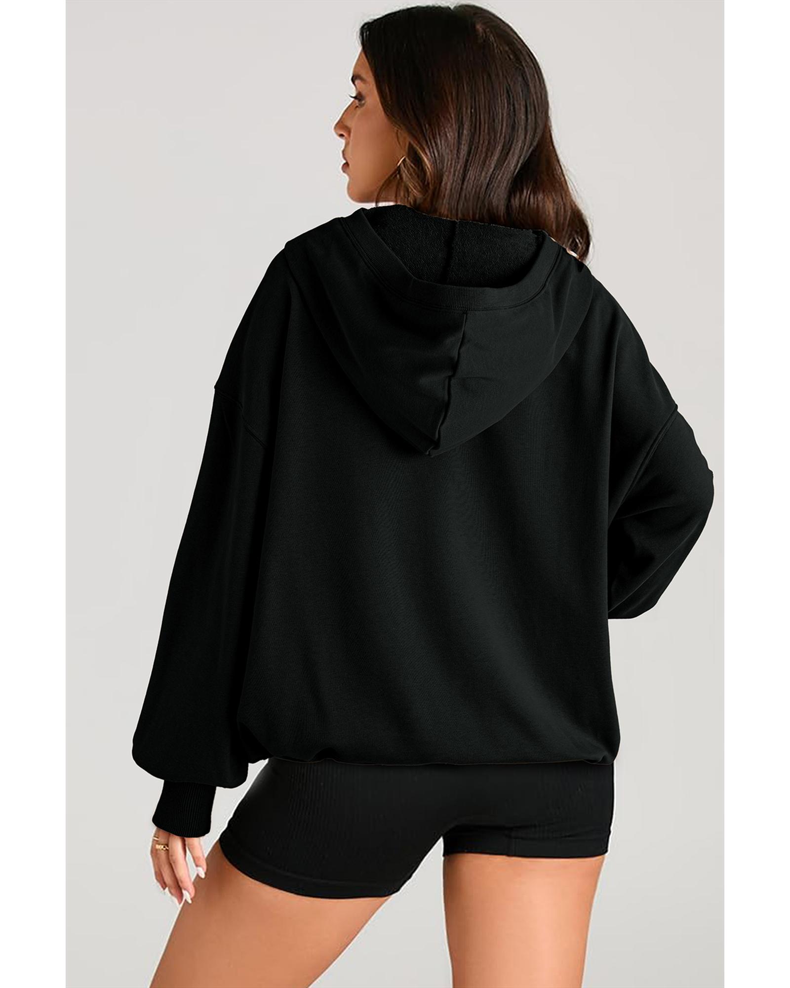 This oversized hoodie features a sleek black solid color with a trendy and relaxed fit. Designed for comfort and style, it includes a kangaroo pocket and a half zipper for easy wear and removal. Perfect for casual occasions, it offers a versatile look suitable for various outfits.
