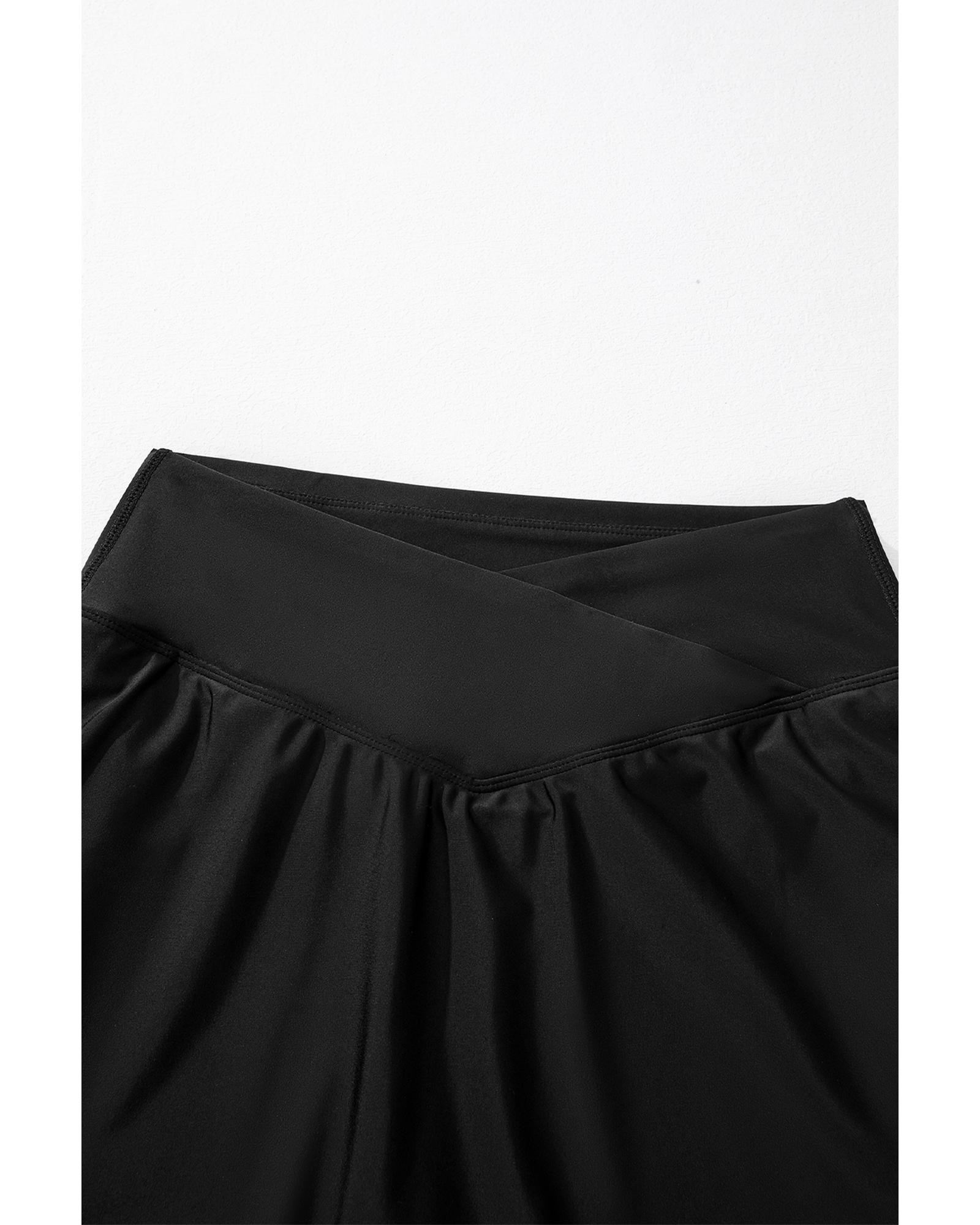 This black solid pocketed crossover high waist swim skort combines a stylish design with practical features, making it suitable for various swim and casual activities. Its high waist silhouette offers comfort and a flattering fit, while the crossover waist adds a unique touch. The skort is made from a high-elasticity fabric for a perfect fit and includes convenient pockets for added practicality.