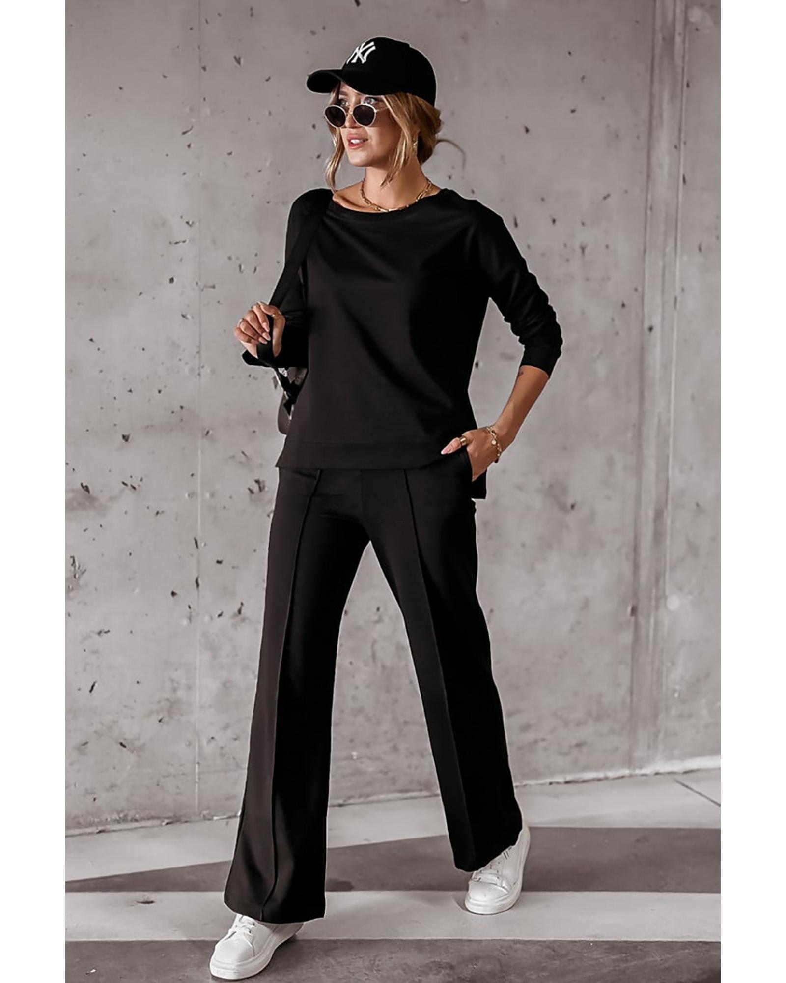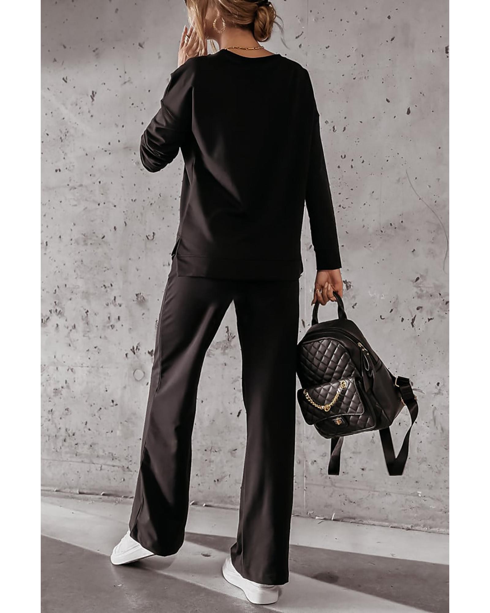 This black solid pullover and seamed casual pants set offers a stylish and comfortable look suitable for various casual occasions. Designed with a trendy fitted silhouette, it combines versatility and ease of styling, making it a great addition to your wardrobe.
