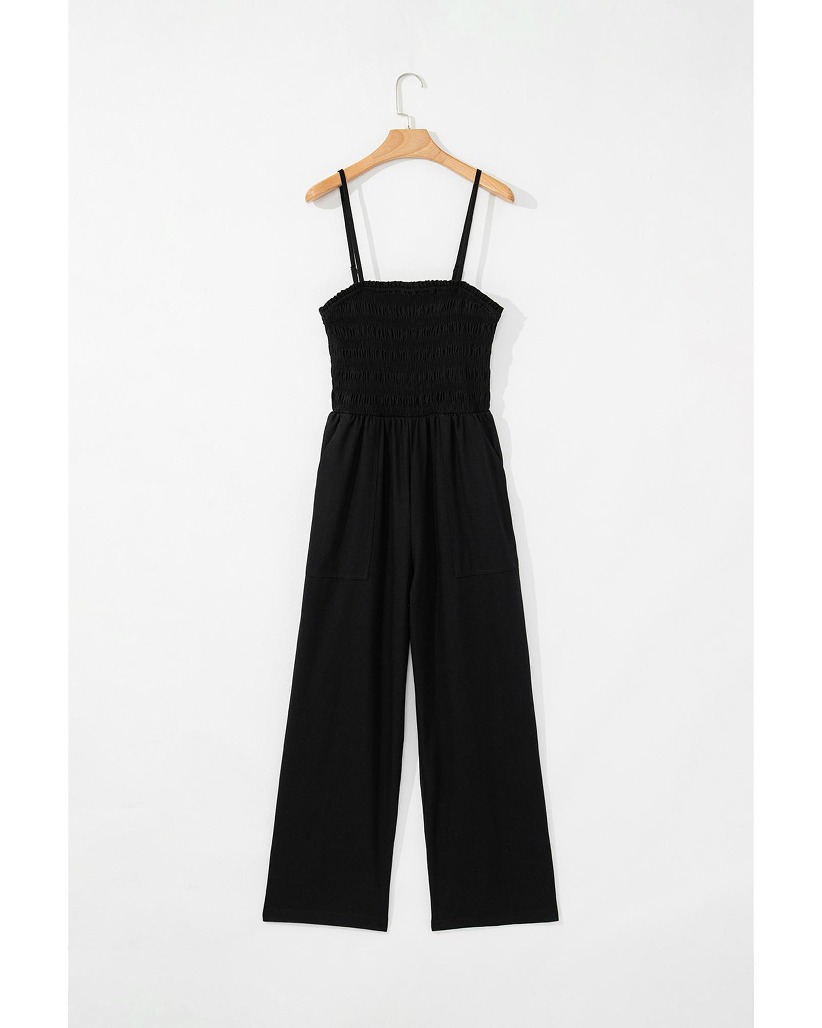 Black Spaghetti Straps Shirred Bodice Pocketed Wide Leg Jumpsuit – L