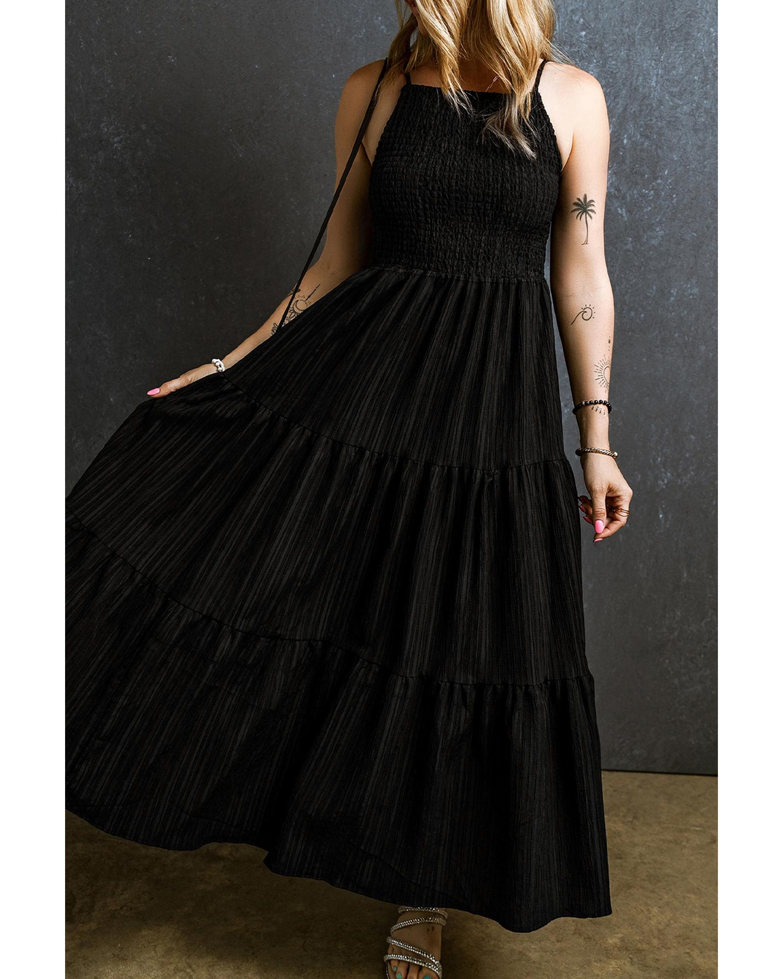 Black Spaghetti Straps Smocked Pleated Tiered Maxi Dress – L