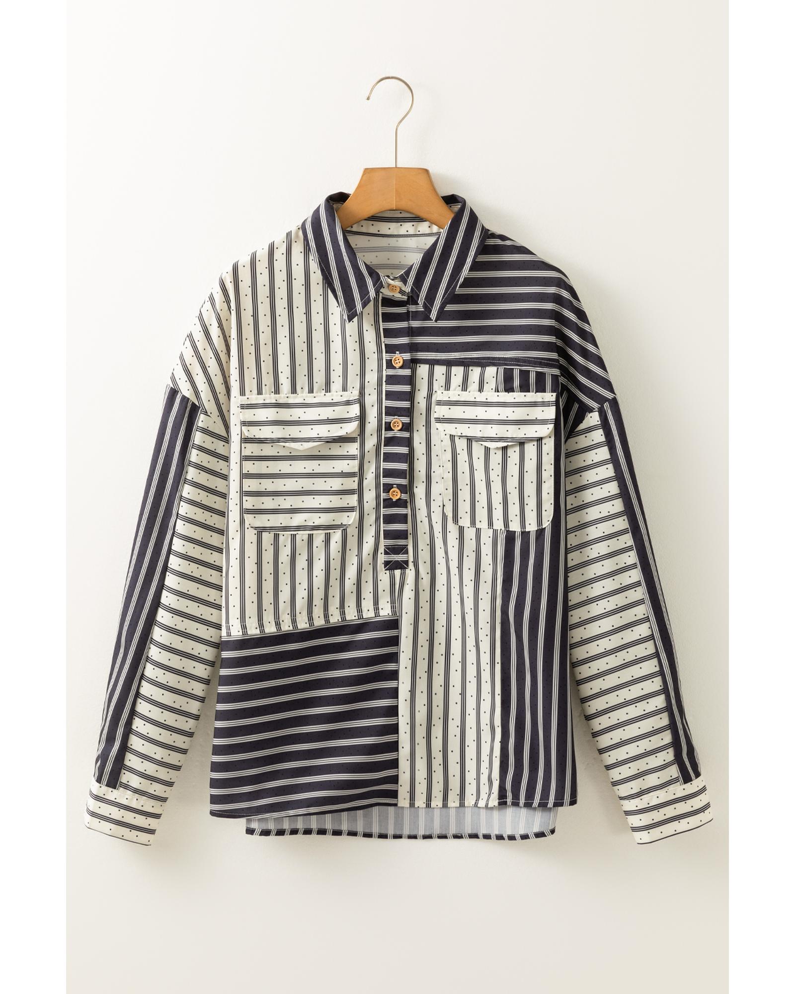 Black Stripe 2-tone Patchwork Half Buttons Chest Pockets Casual Blouse – XL