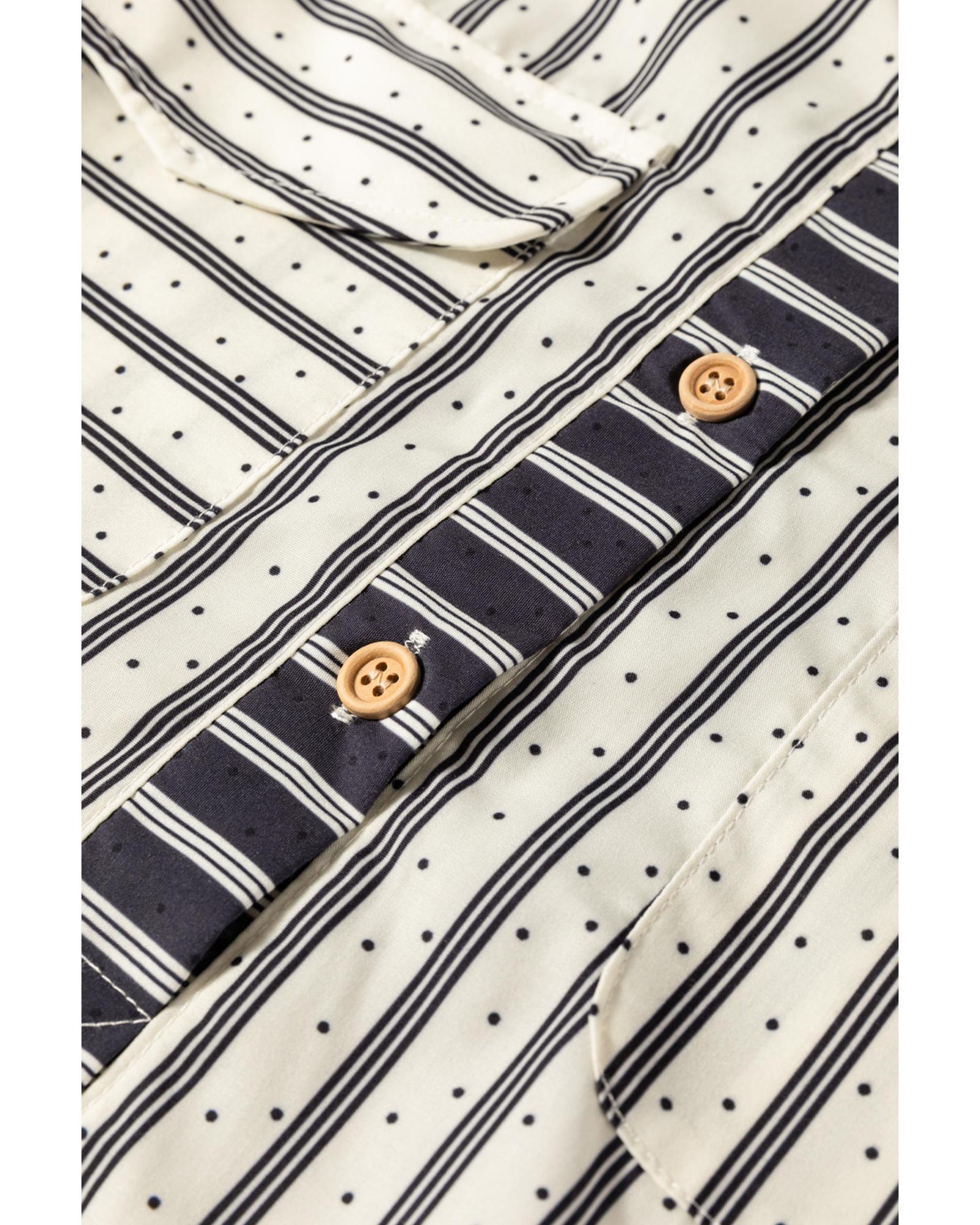 This casual blouse features a stylish black and white two-tone patchwork design with a striped pattern. It is designed for a trendy, fitted look and offers a comfortable, lightweight feel suitable for everyday wear. The blouse includes practical chest pockets, a collared neckline, and half-button placket, making it both fashionable and functional.