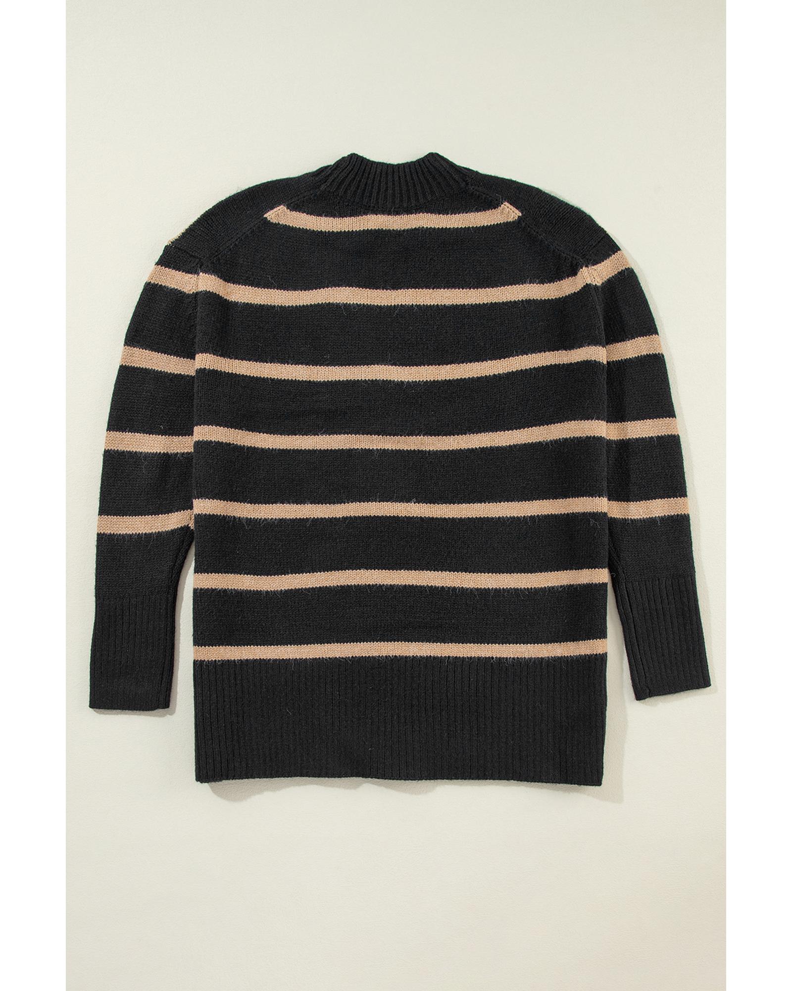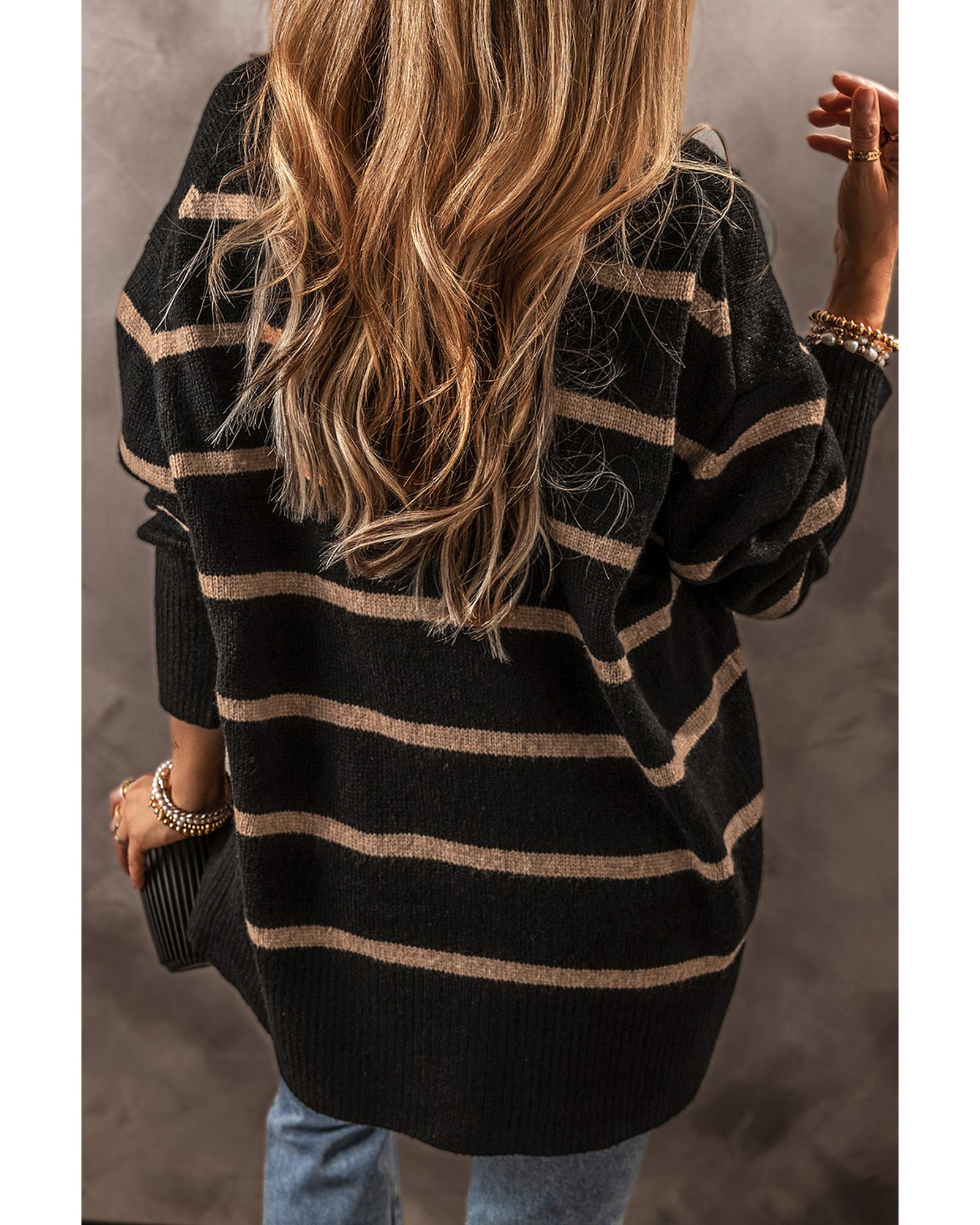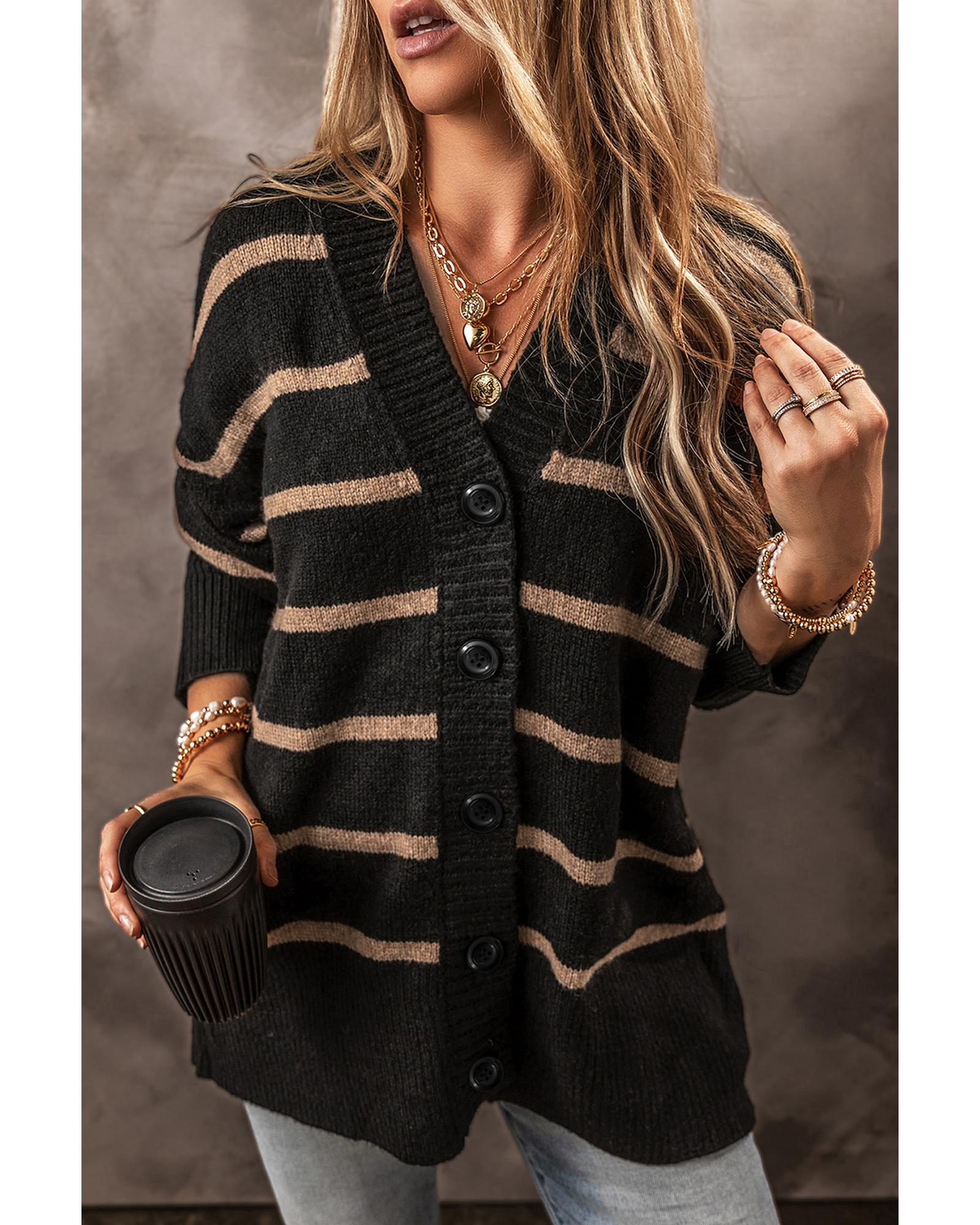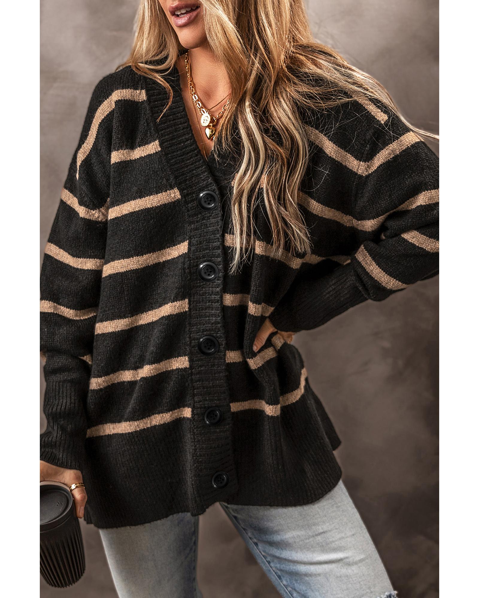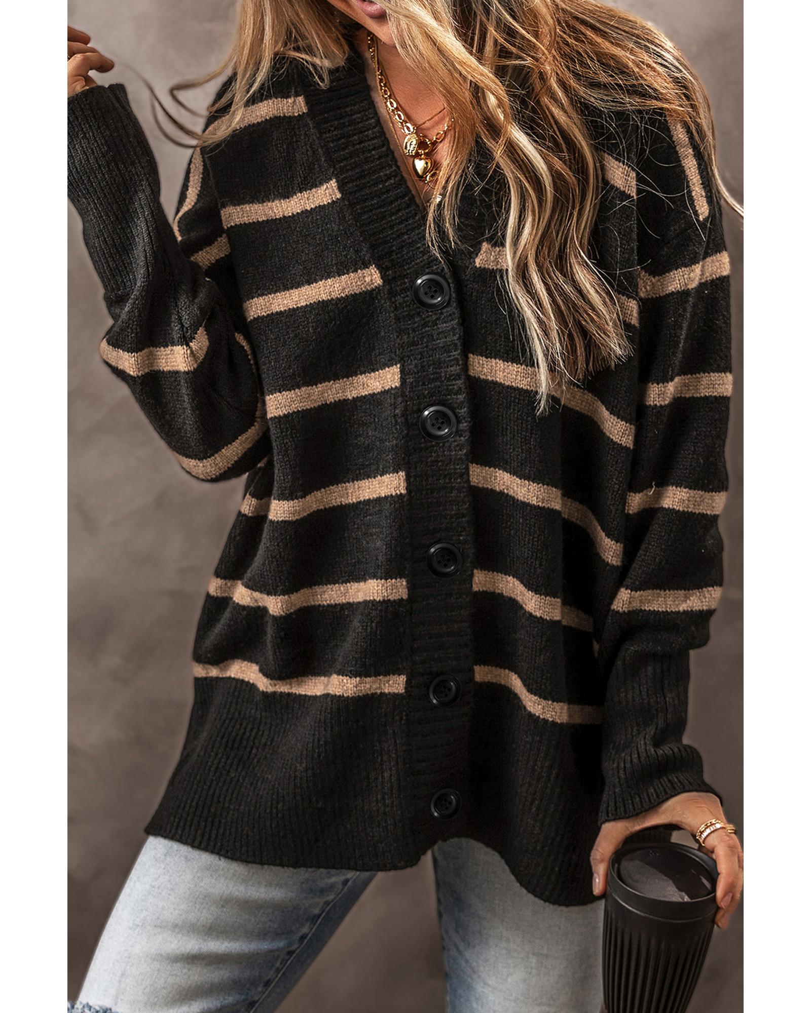 This black stripe buttoned V neck drop shoulder loose cardigan offers a stylish and versatile look with a relaxed fit. Designed with a classic striped pattern and a comfortable silhouette, it is ideal for layering and casual wear.