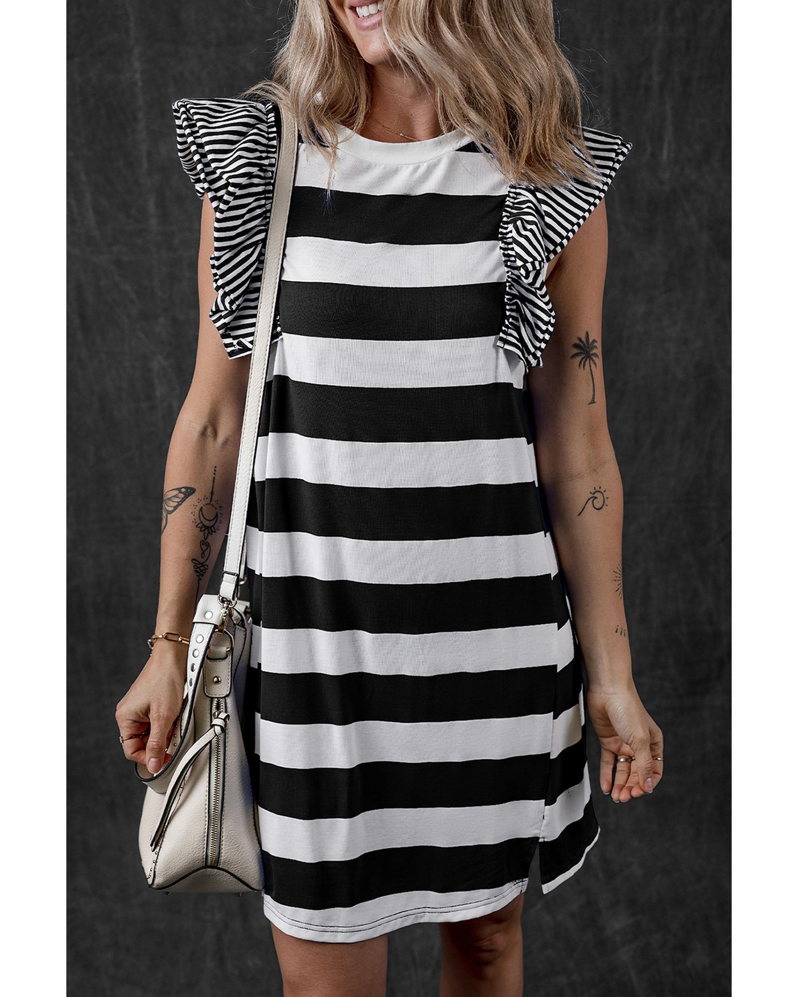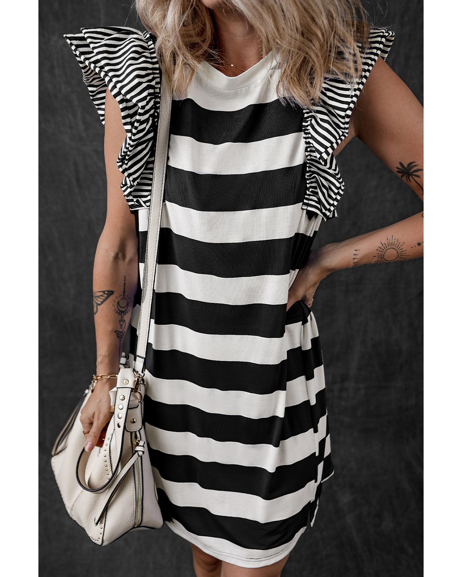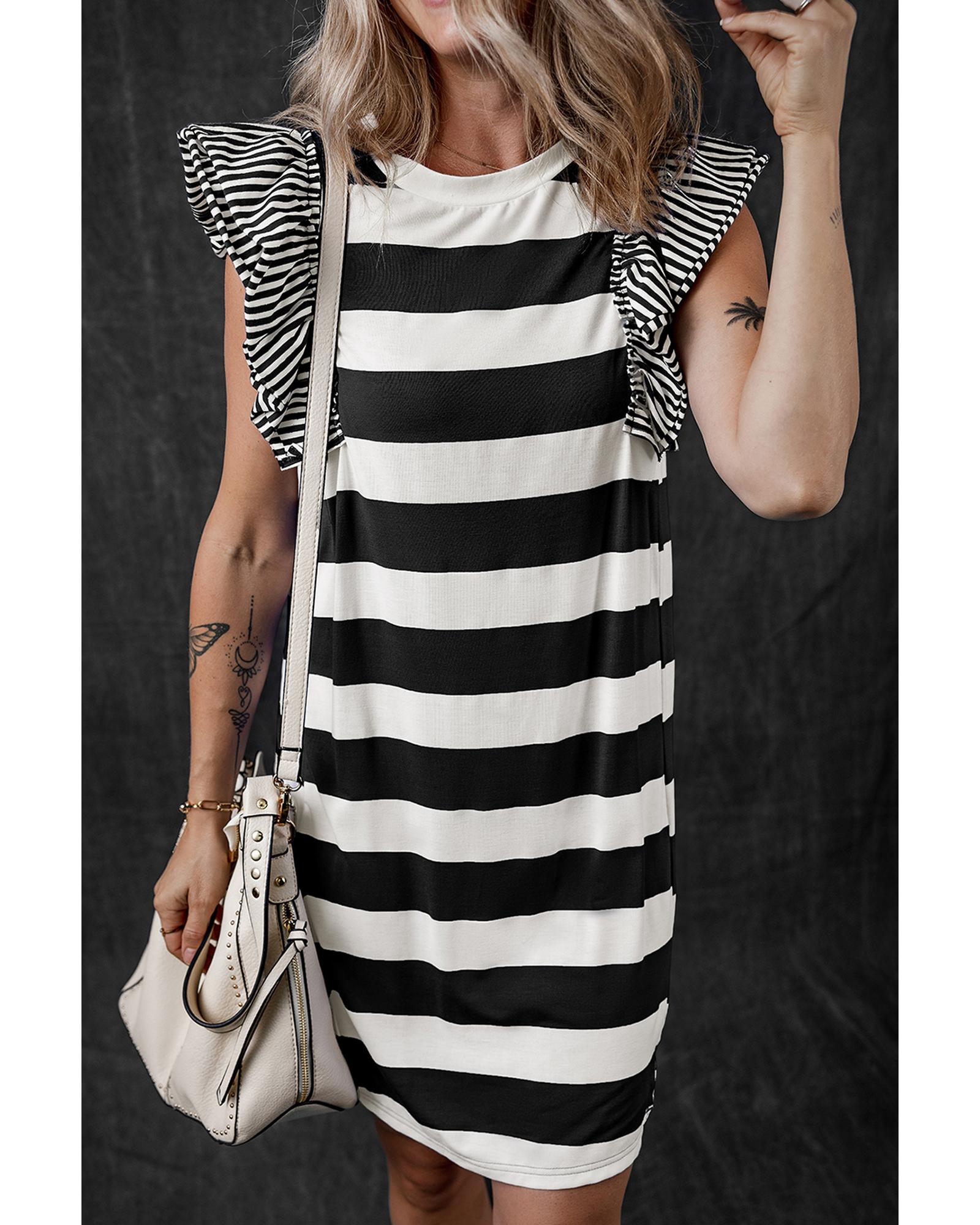 This T-shirt dress features a stylish black stripe design with playful ruffled sleeves and a classic crew neck. Its flirty mini length makes it suitable for various occasions, offering a versatile and feminine look that combines elegance with a trendy fit.
