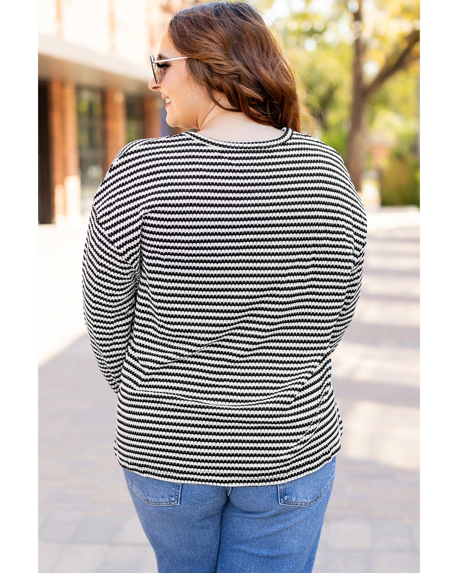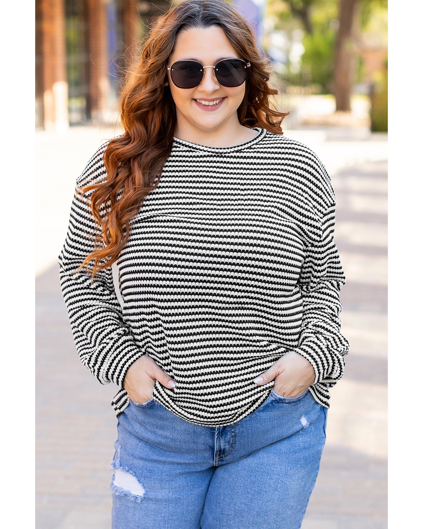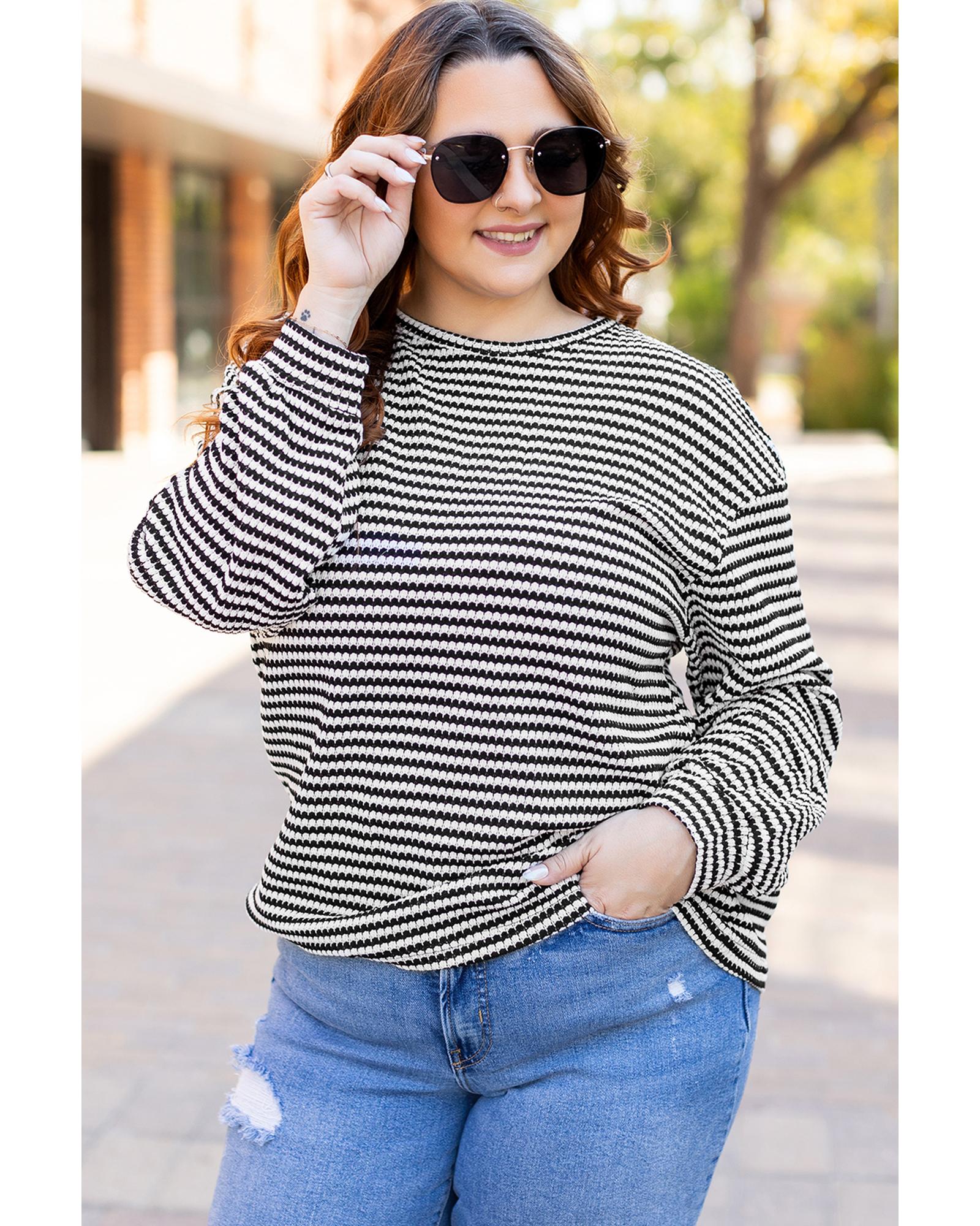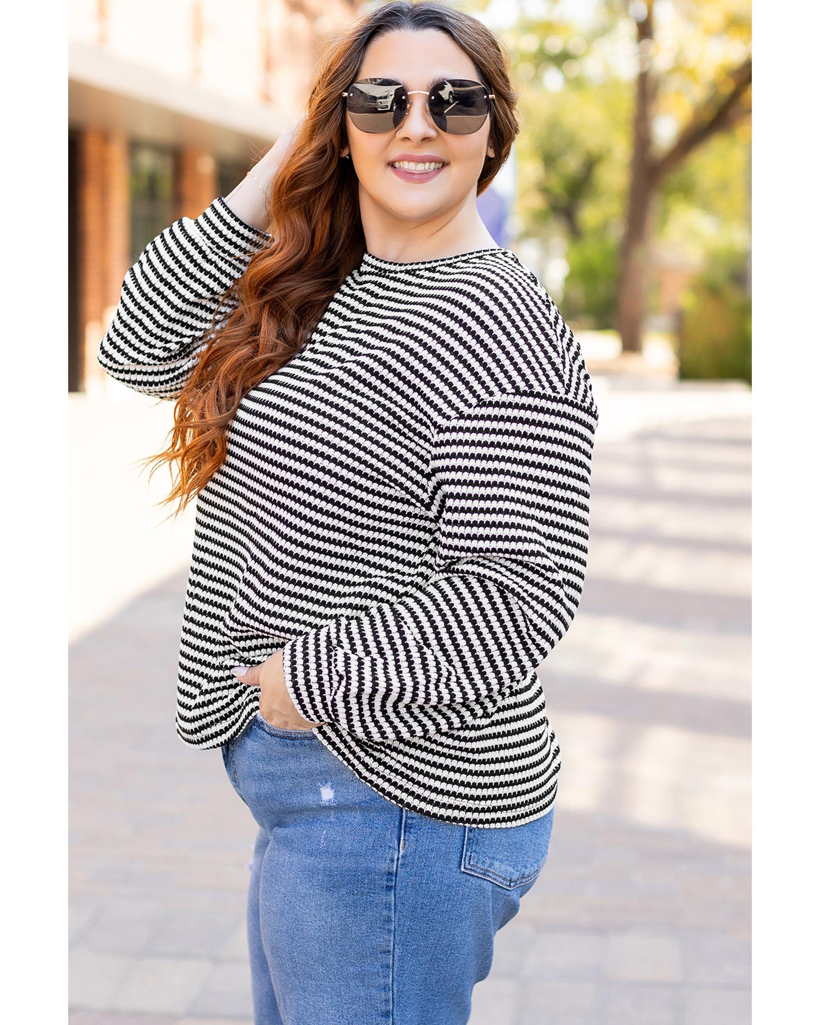 This stylish plus size T-shirt features a classic black stripe design with a relaxed fit, making it a versatile addition to any casual wardrobe. The drop shoulder and puff long sleeves add a fashionable and comfortable touch, suitable for various casual occasions.