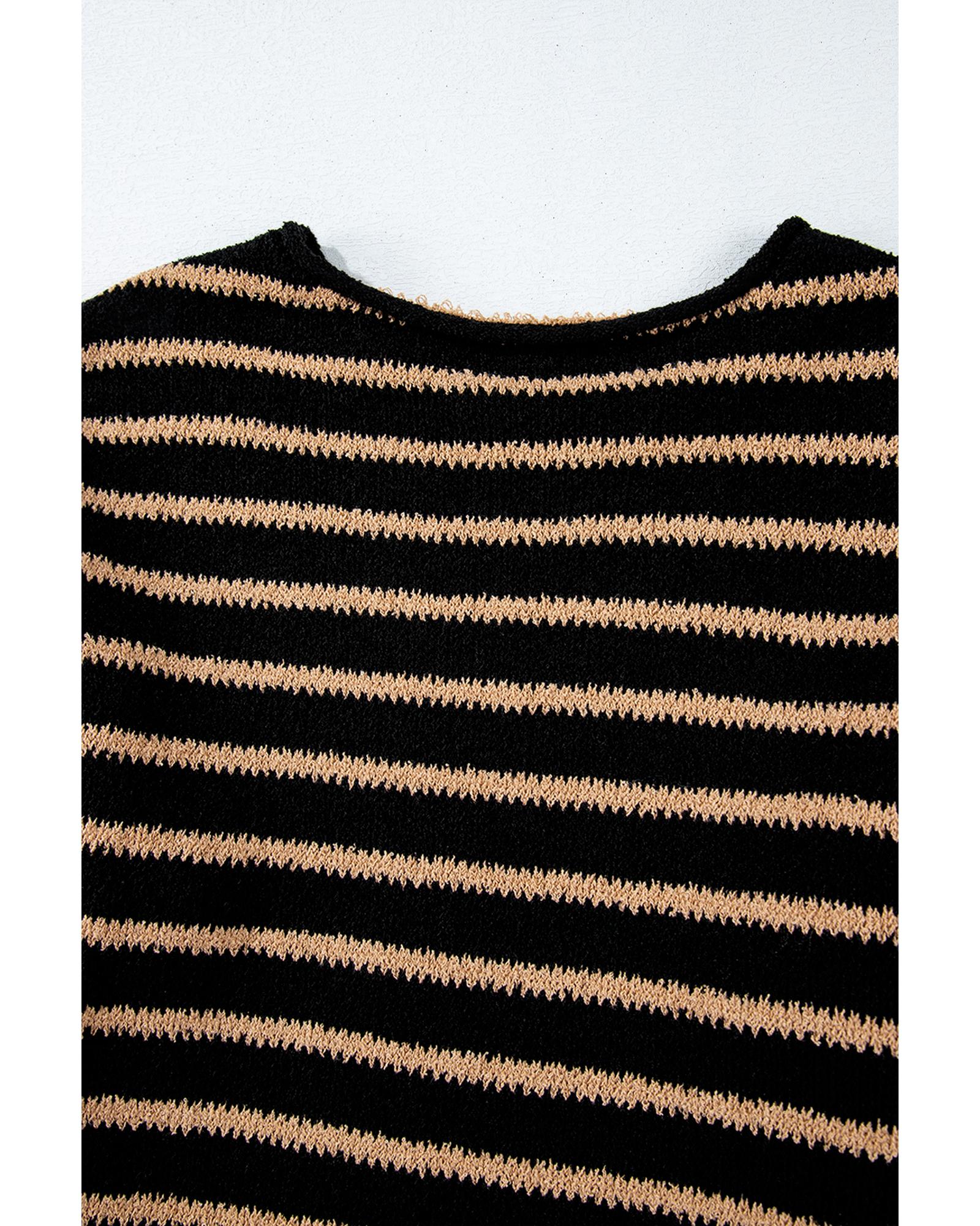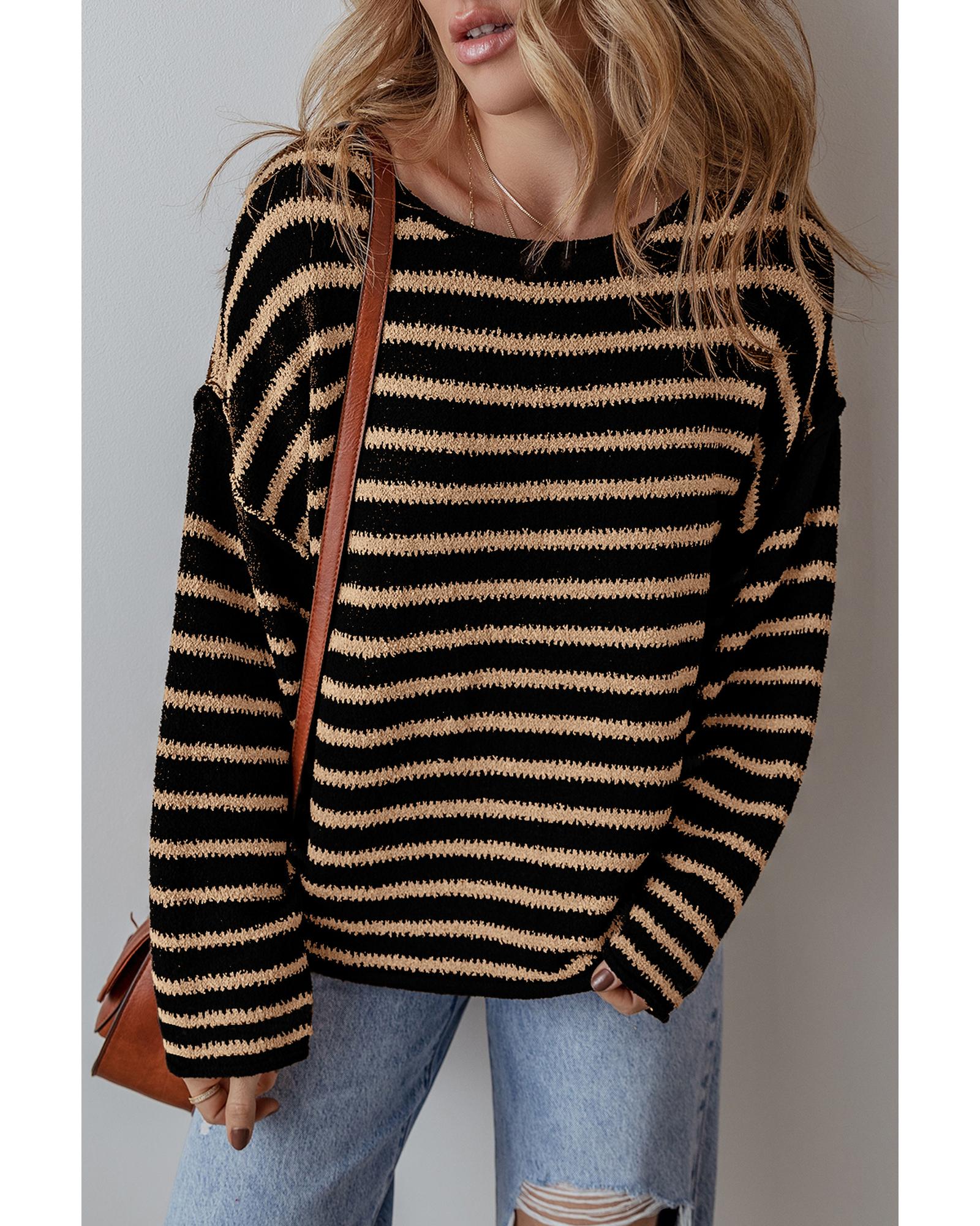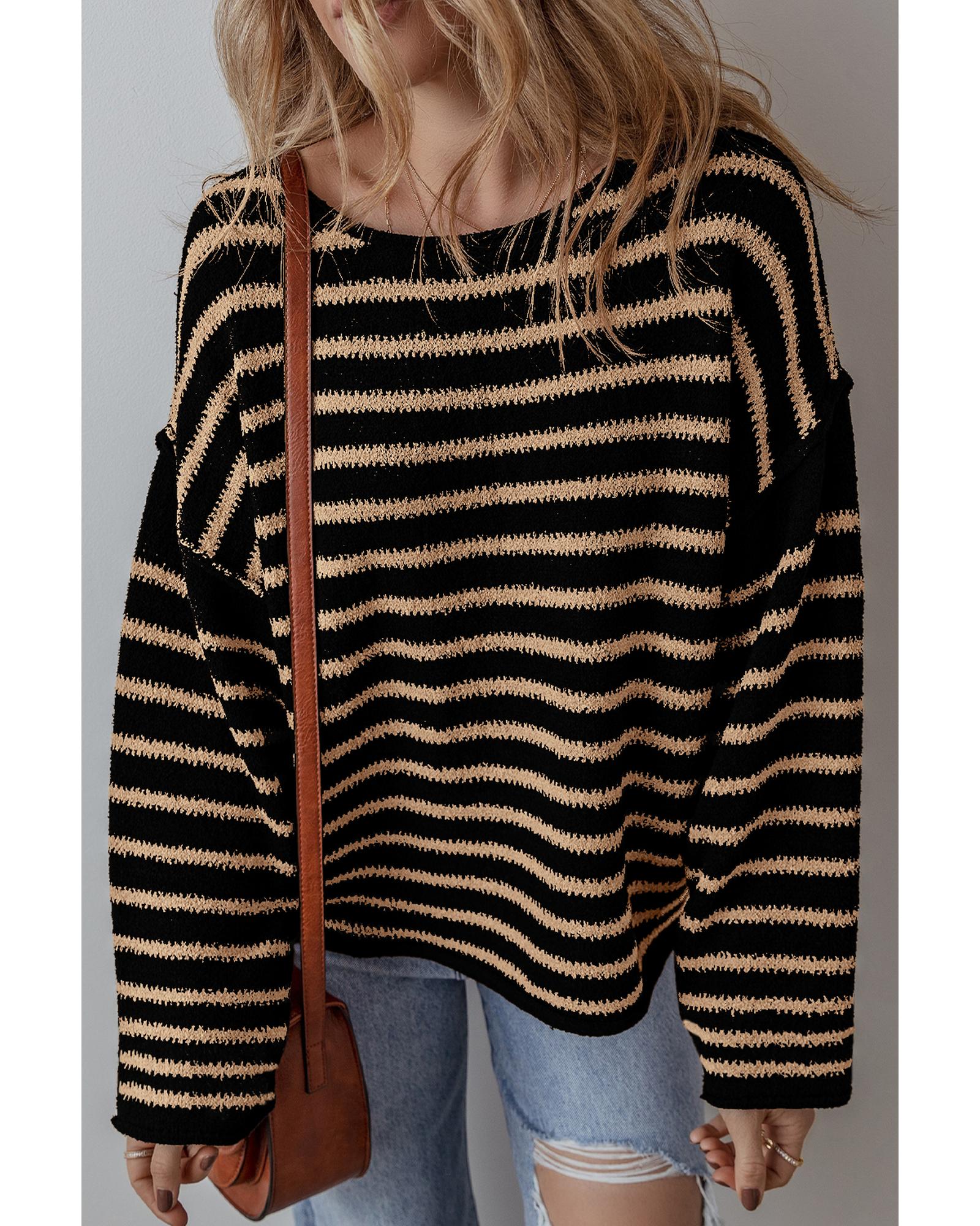 Black Stripe Drop Shoulder Round Neck Loose Sweater – S