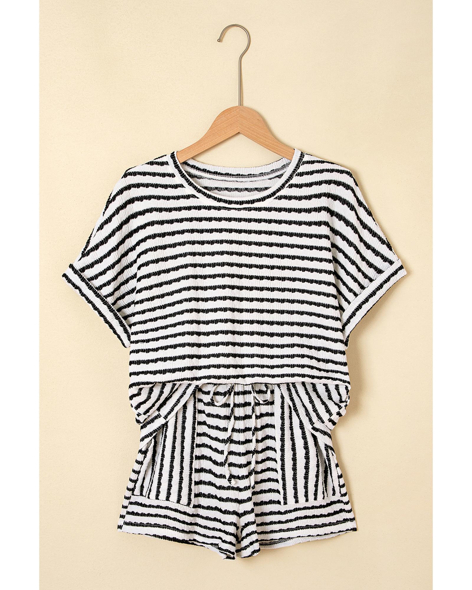 This stylish set features a black stripe knitted short sleeve top paired with drawstring shorts, offering a comfortable and fashionable look. The combination of textured knit fabric and a classic striped pattern makes it suitable for casual wear while maintaining a chic appearance.