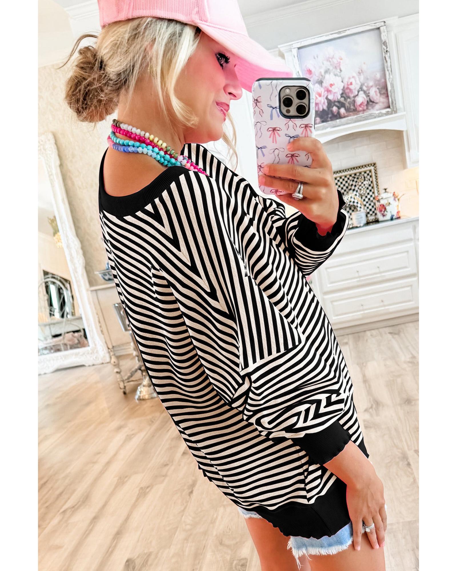 Black Stripe Loose Drop Shoulder Long Sleeve Top – M