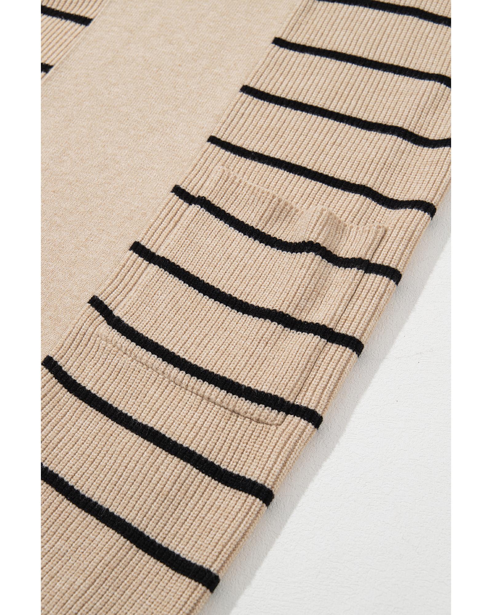 This open cardigan features a stylish black stripe design with a shawl neckline and convenient pockets. Crafted from fine fabrics, it offers a versatile and chic addition to any wardrobe, perfect for layering and creating fashionable looks. The high elasticity ensures a comfortable fit for various body types.