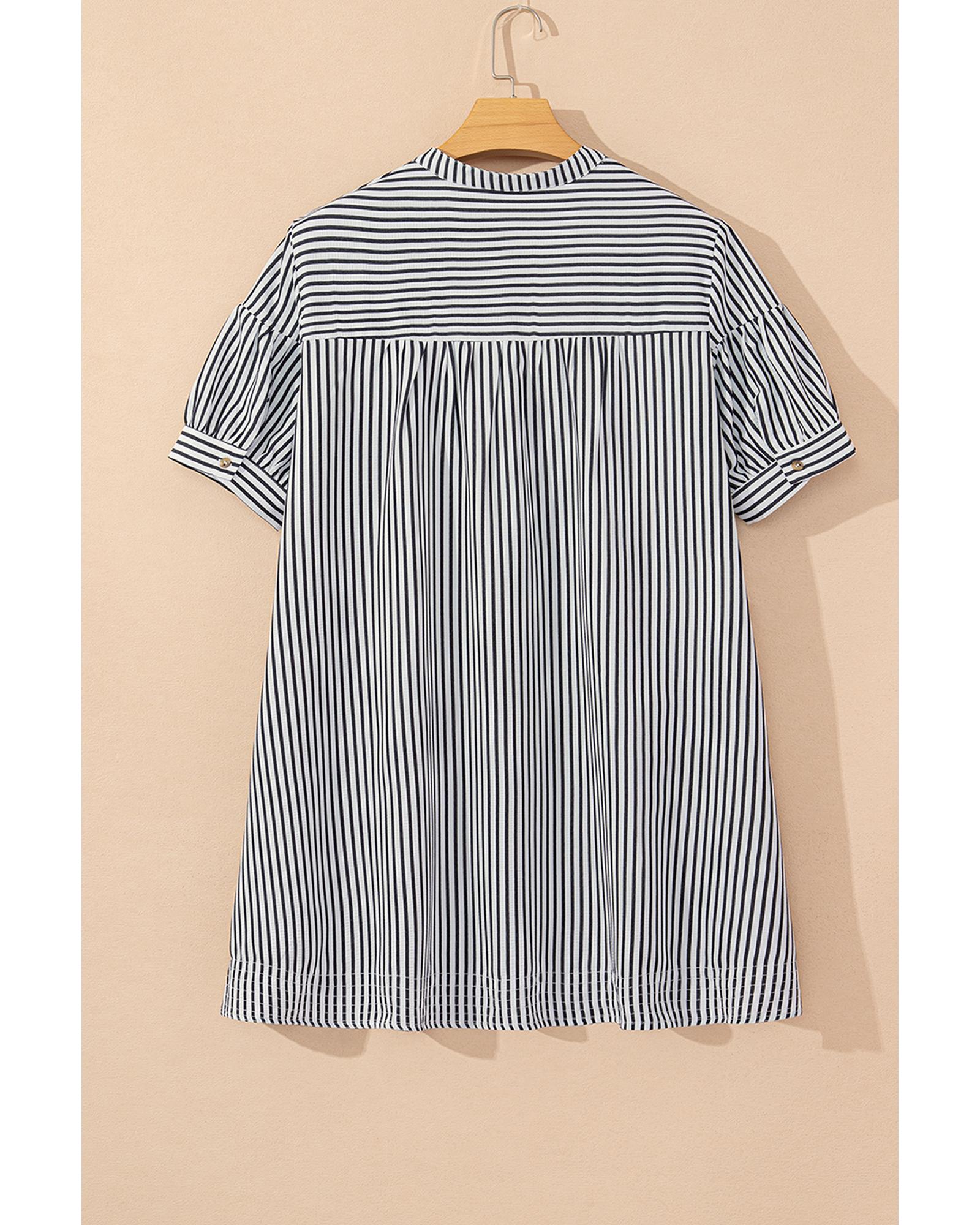 This plus size mini dress features a classic striped pattern and a stylish design suitable for various occasions. It combines comfort and practicality with its buttoned front, V-neck, short sleeves, and functional pockets, making it a versatile addition to your wardrobe.