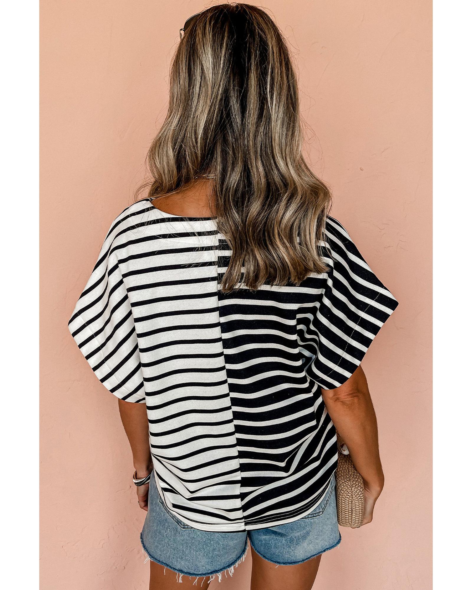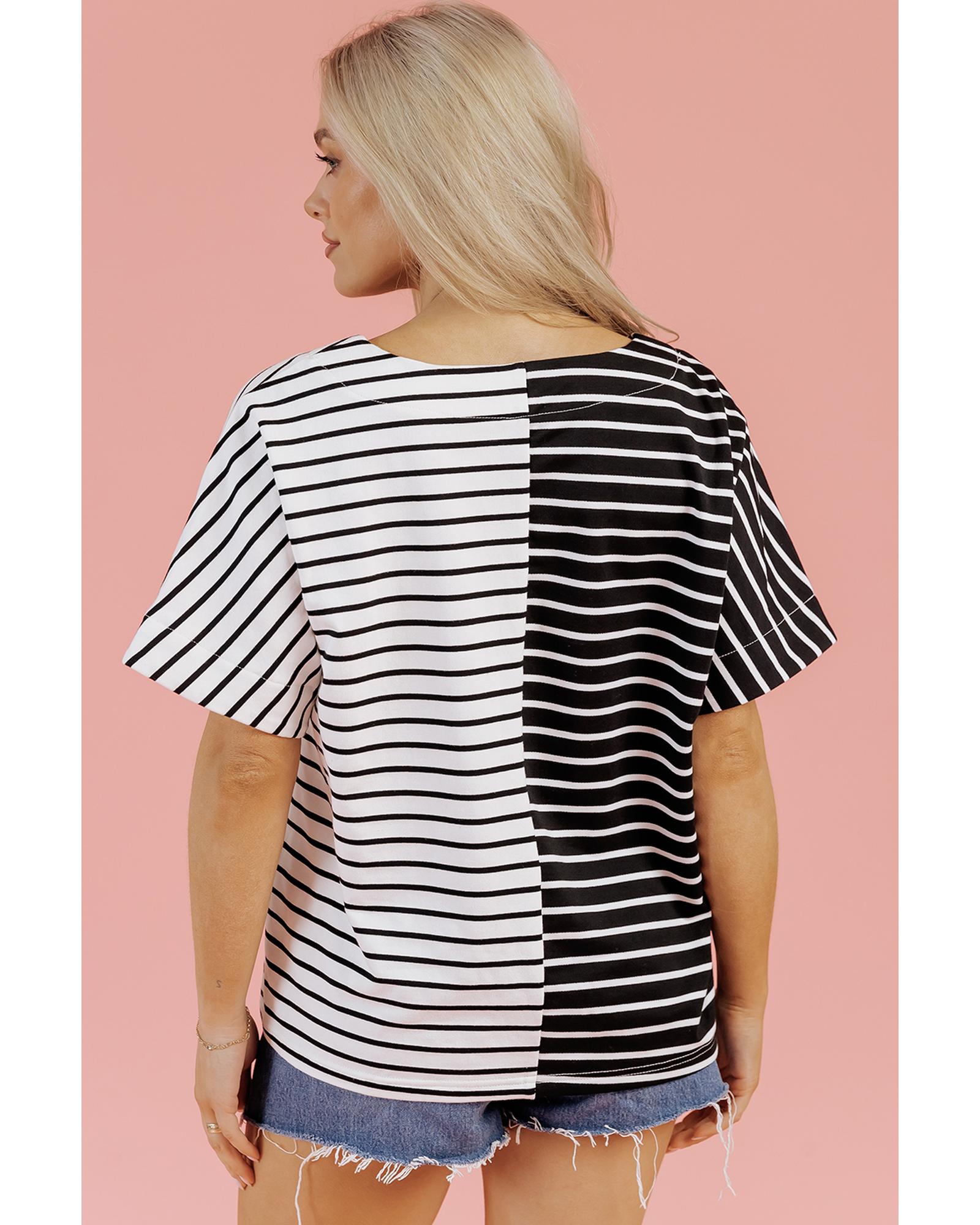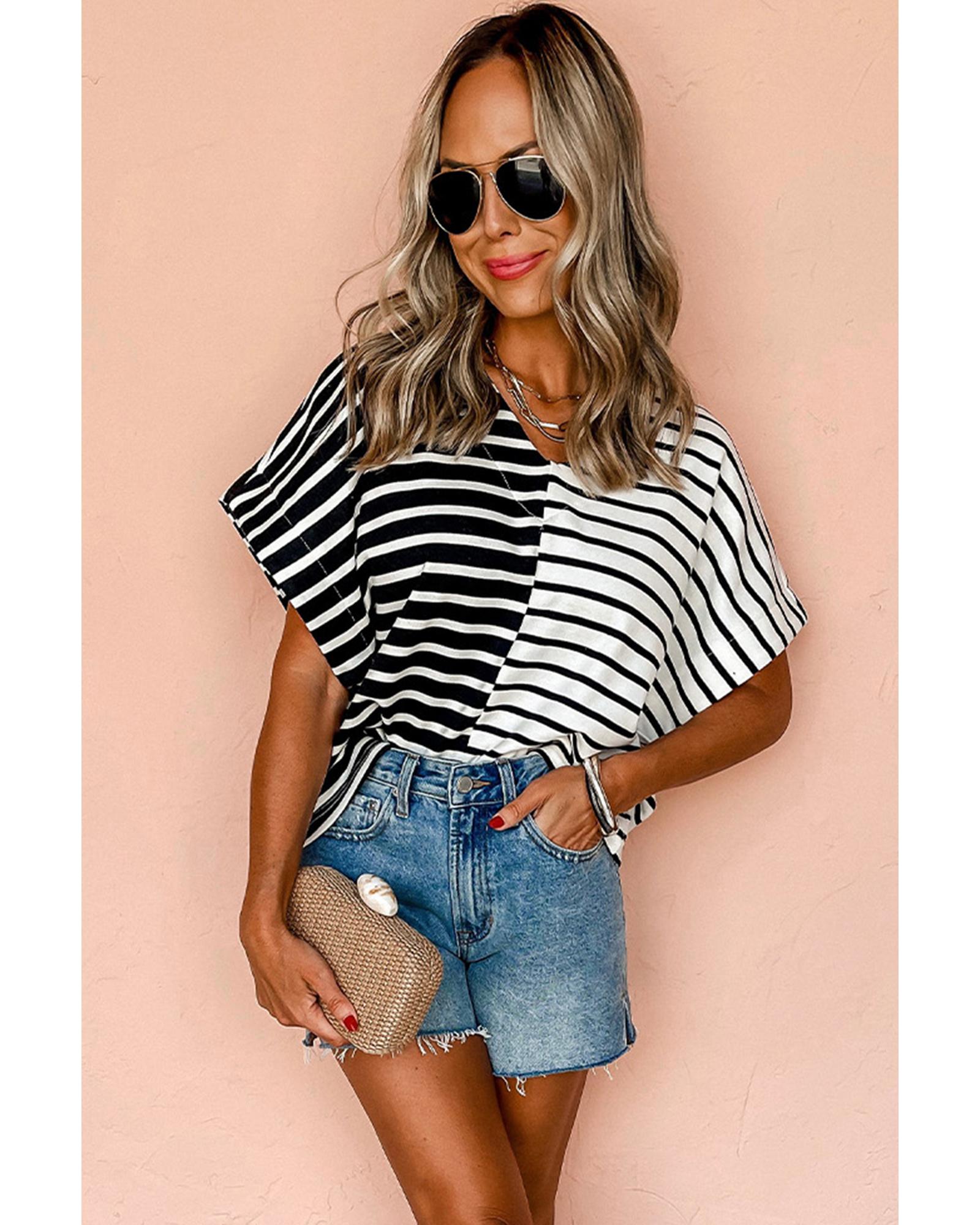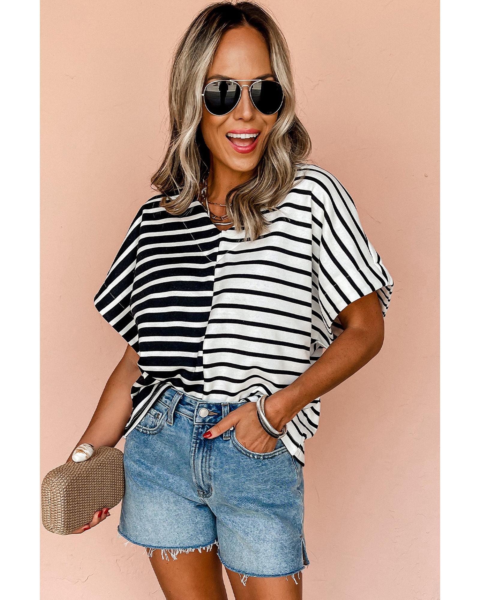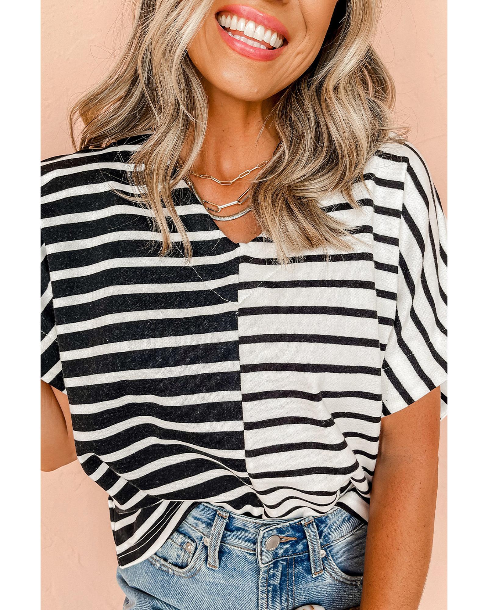 This Black Stripe Two Tone Colorblock V Neck T Shirt offers a stylish and versatile look suitable for various casual or daily occasions. Its eye-catching design features a classic striped pattern combined with a modern two-tone colorblock style, complemented by a chic V neckline for a refined appearance.