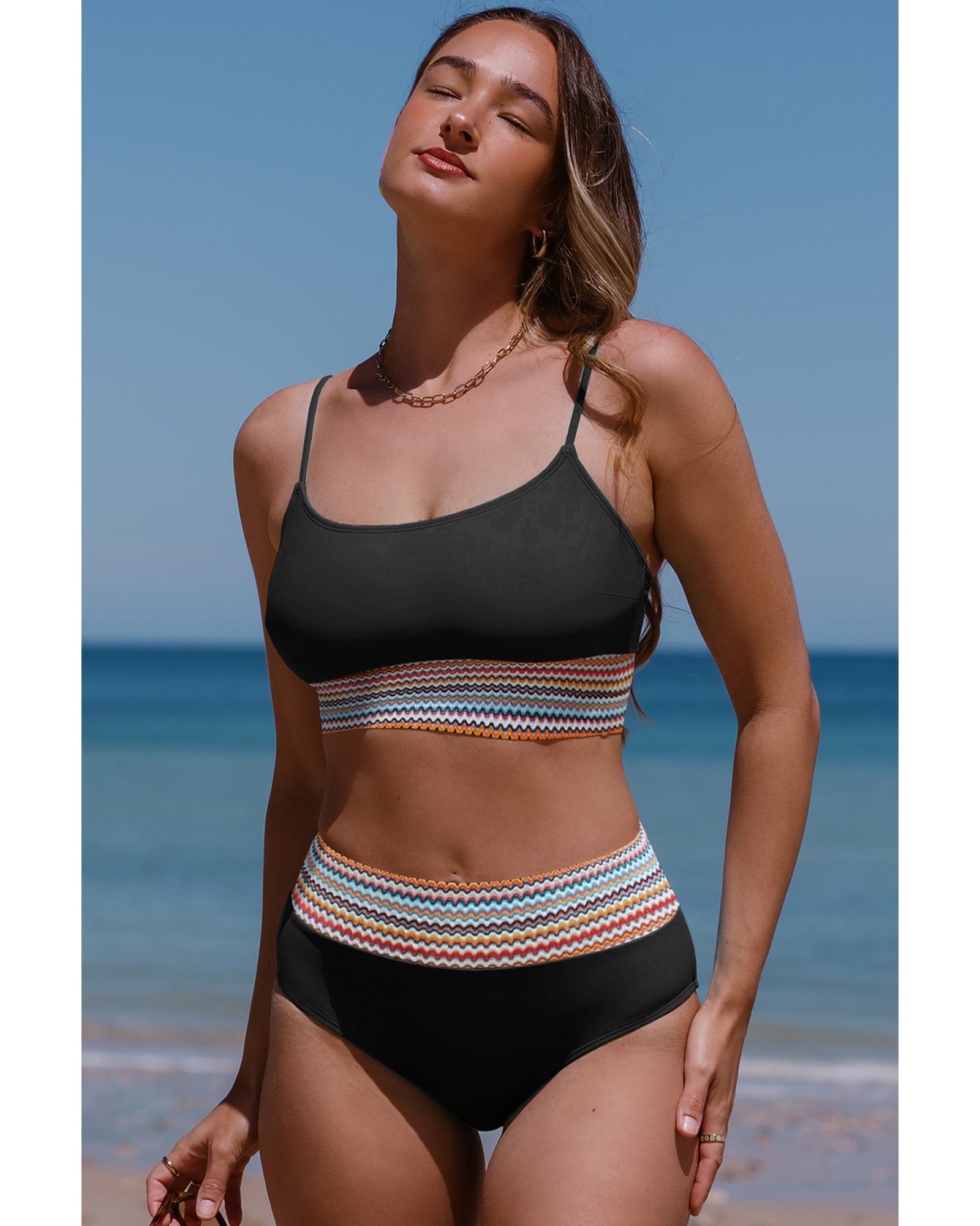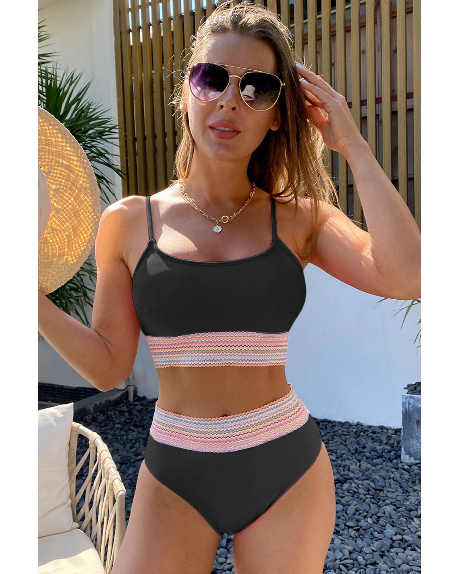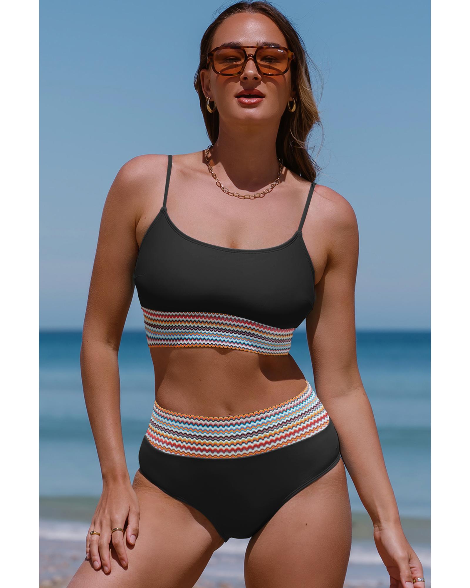 Black Striped Patchwork Spaghetti Strap High Waist Bikini Swimsuit – S