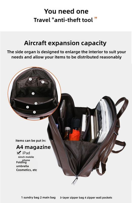 This stylish women’s backpack combines functionality and elegance, making it suitable for school, work, travel, or casual outings. Crafted from high-quality PU leather with a polyester lining, it offers durability and wear resistance. The spacious design includes multiple compartments to organize A4 magazines, an iPad, mobile phones, umbrellas, and cosmetics. An anti-theft back zipper pocket provides added security for valuable items. The bag can be carried as a backpack, single-shoulder bag, or hand-held bag, offering versatile carrying options.