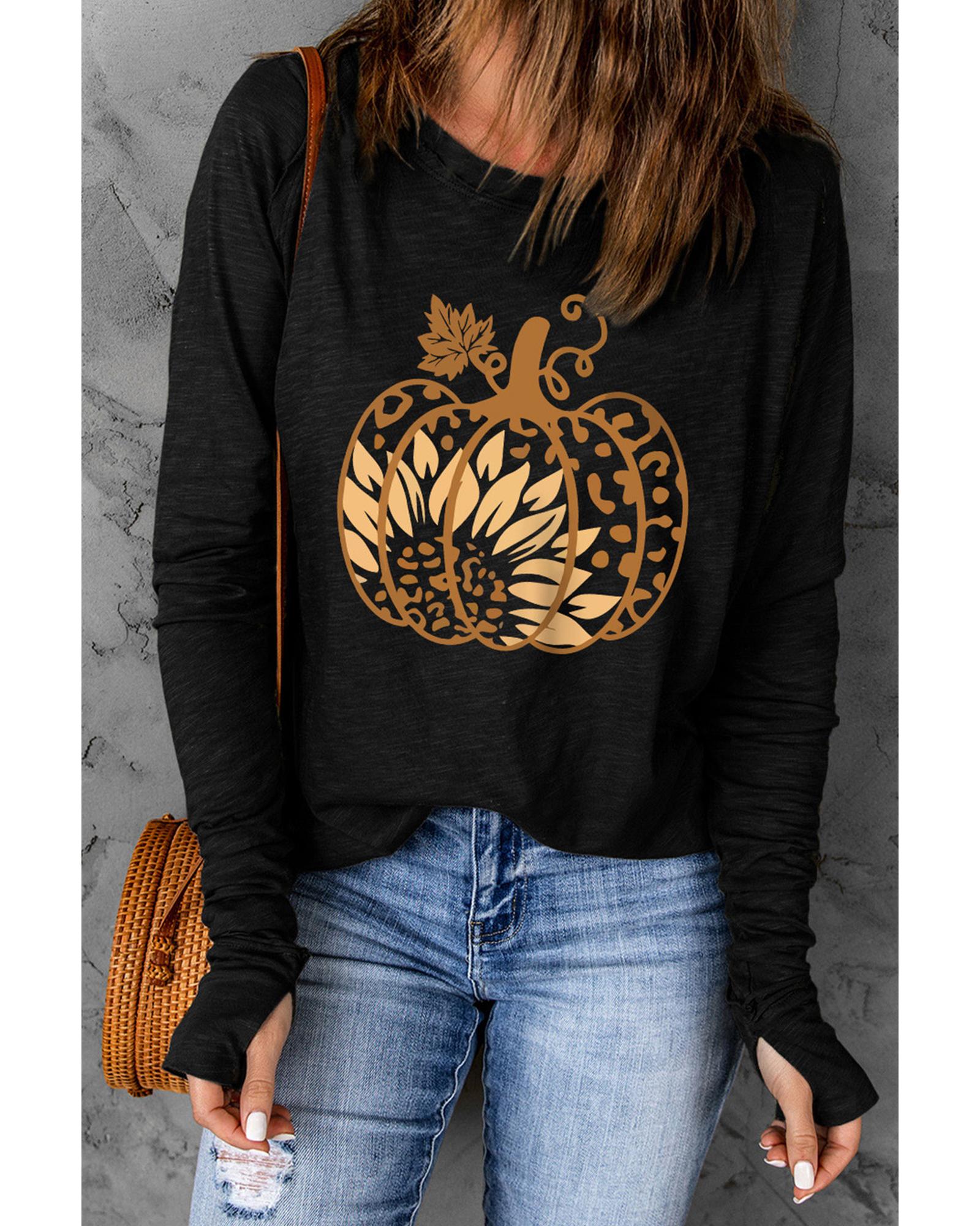 This top features a trendy fitted design with a black sunflower pumpkin graphic and thumbhole sleeves, making it a stylish choice for various occasions. Its versatile style and comfortable fit make it suitable for everyday wear or special events.