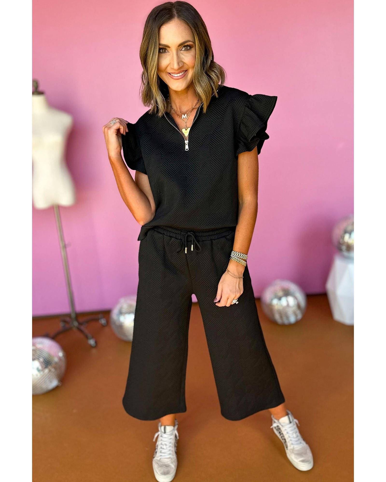 This stylish set features a textured black top with flutter sleeves paired with wide-leg pants, creating a trendy and feminine look suitable for various occasions. Designed with a fitted silhouette, it offers both comfort and elegance, making it a versatile addition to your wardrobe.