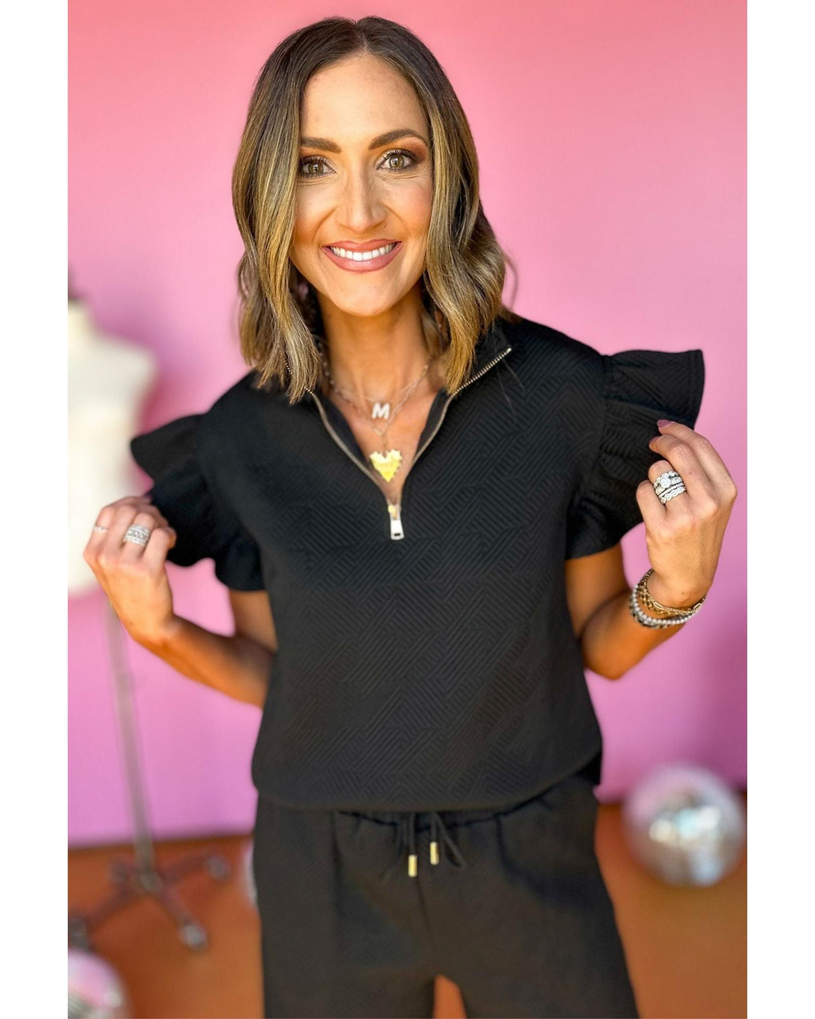 This stylish set features a textured black flutter sleeve top paired with wide-leg pants, creating a trendy and feminine look suitable for various occasions. Designed with a fitted silhouette, it offers both comfort and a fashionable appearance. The versatile style can be easily dressed up or down to suit your needs.