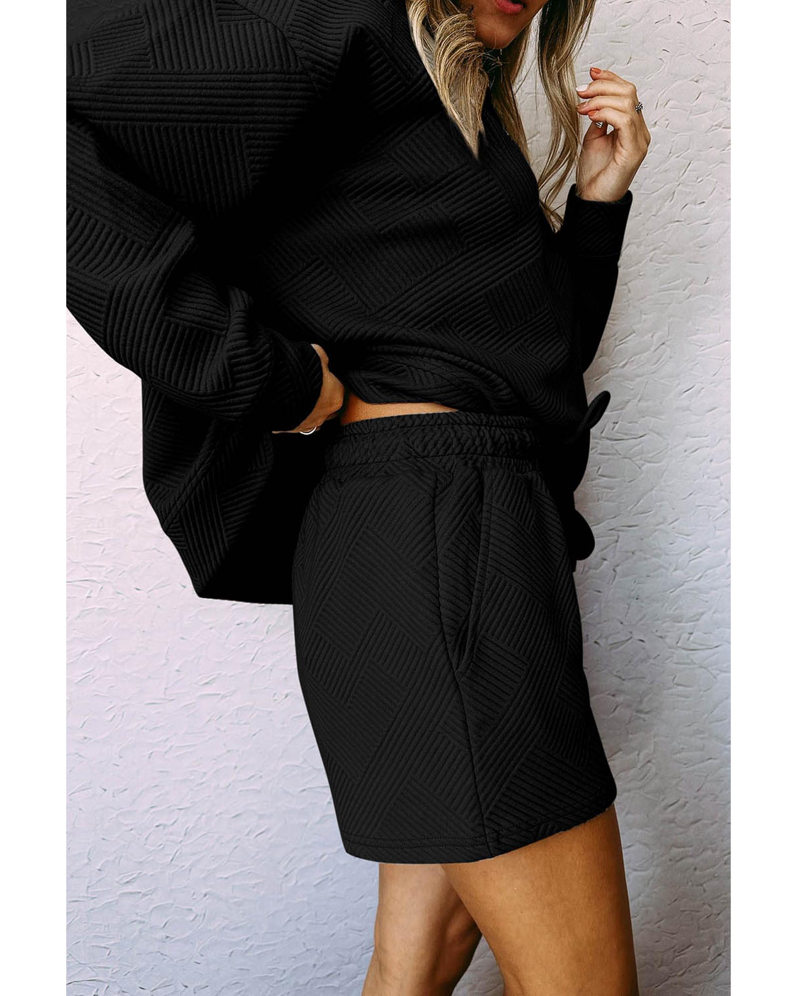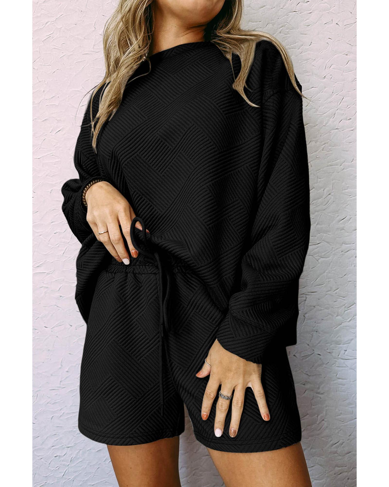 Black Textured Long Sleeve Top and Drawstring Shorts Set – L