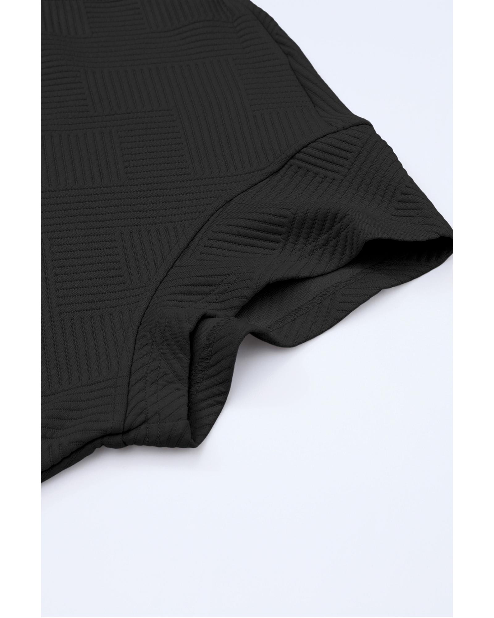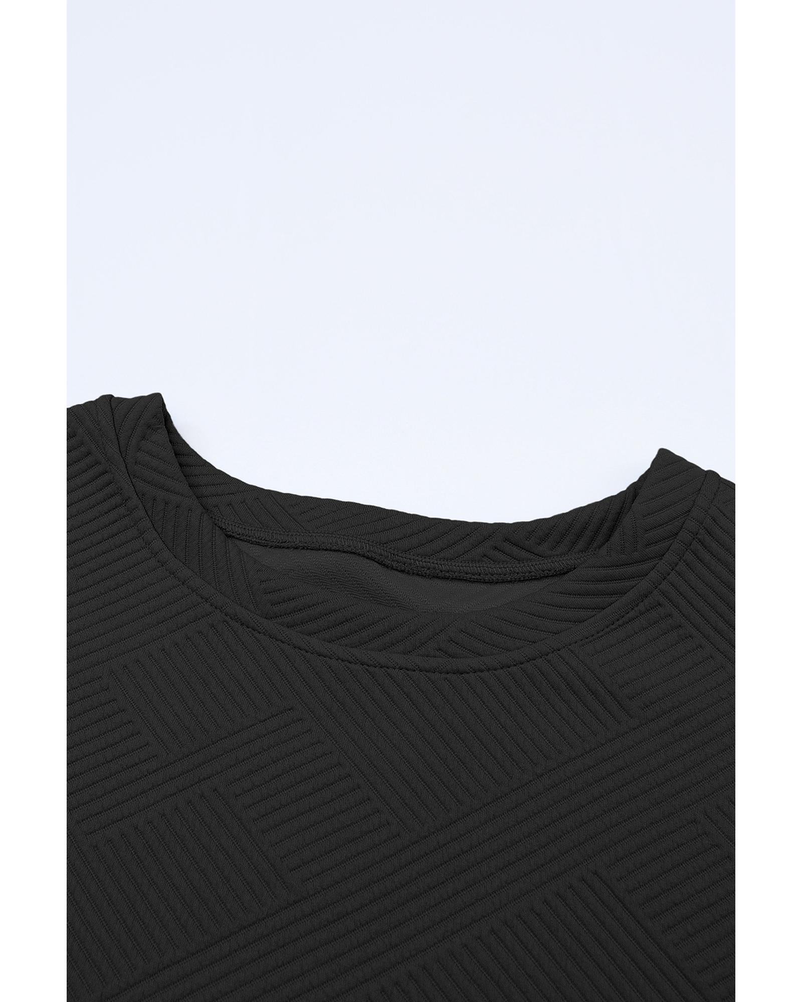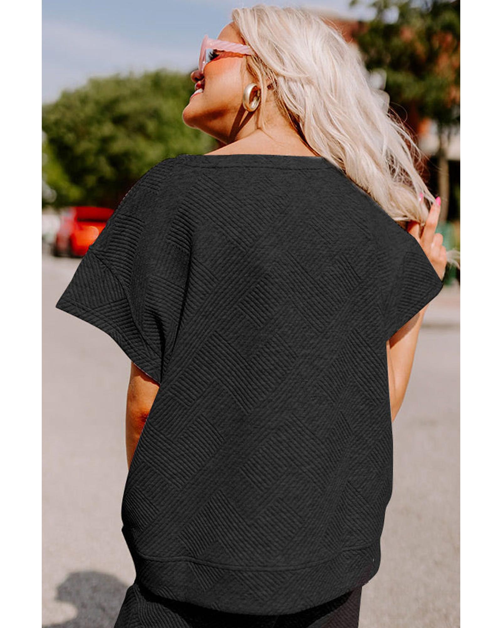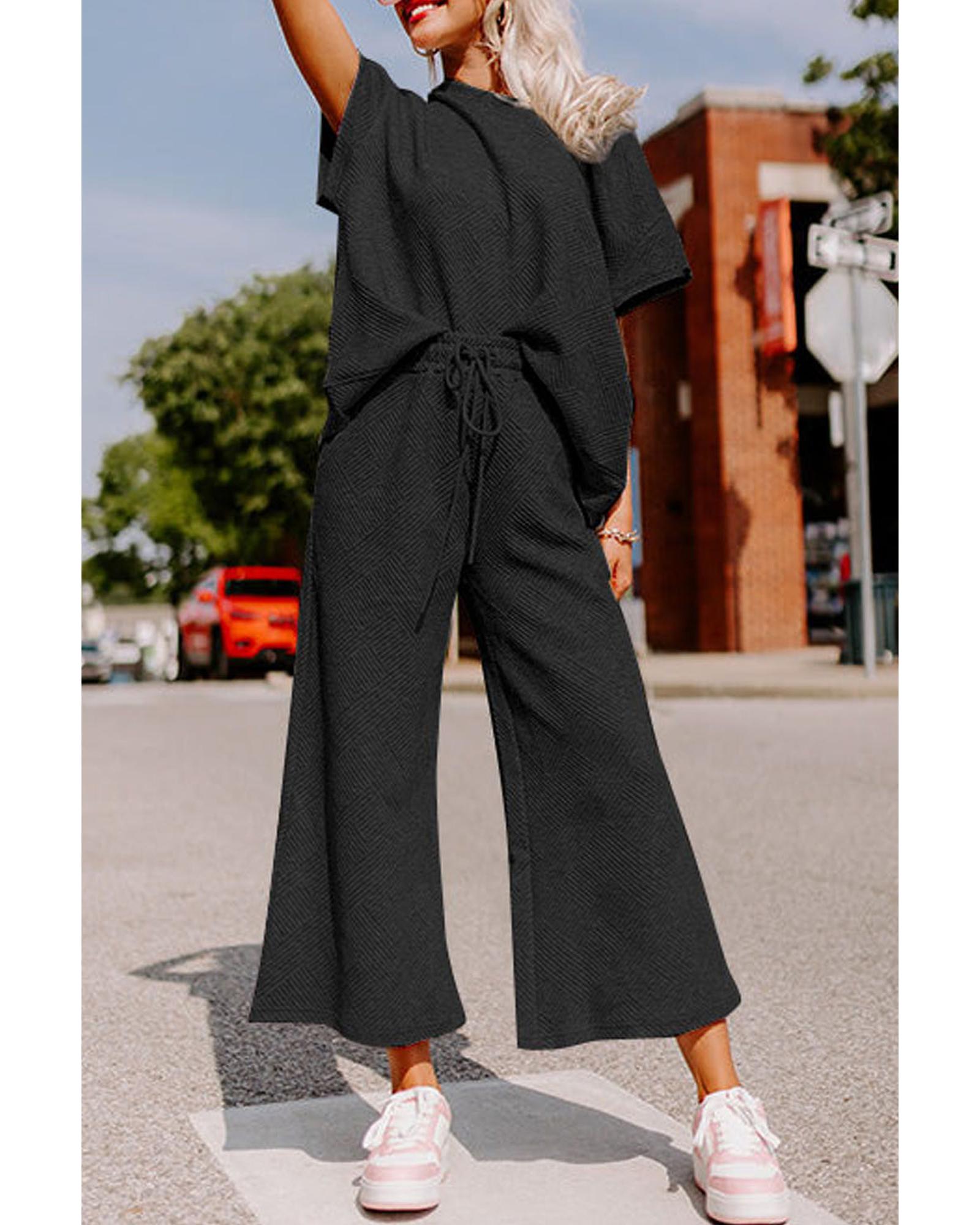 This black textured loose fit T-shirt and drawstring pants set offers a comfortable and stylish casual look. Designed with a trendy fitted style, it provides a relaxed fit for all-day comfort. The textured fabric adds a fashionable touch, while the drawstring waist allows for a customizable fit. Perfect for lounging, running errands, or casual outings, this set combines comfort and style effortlessly.