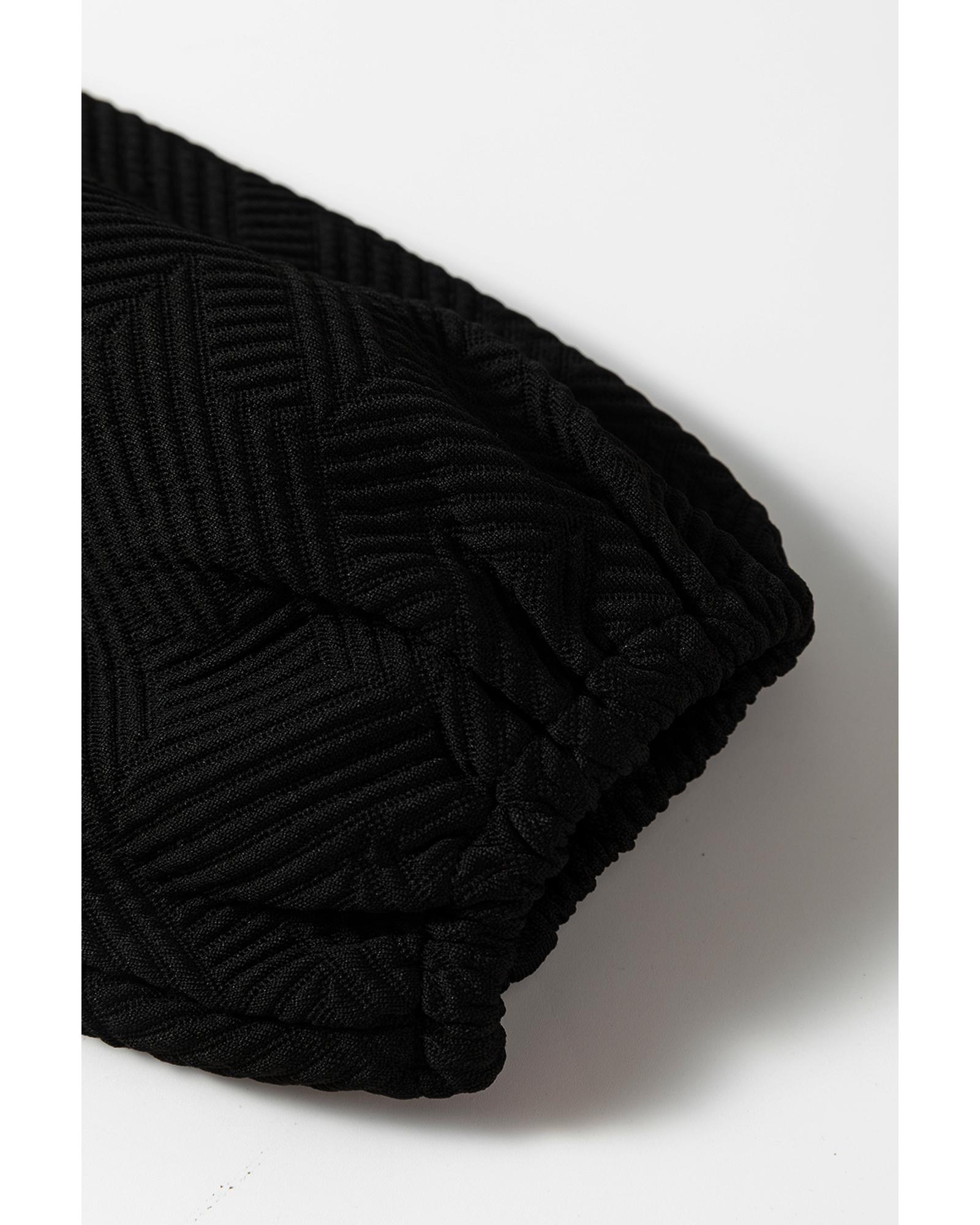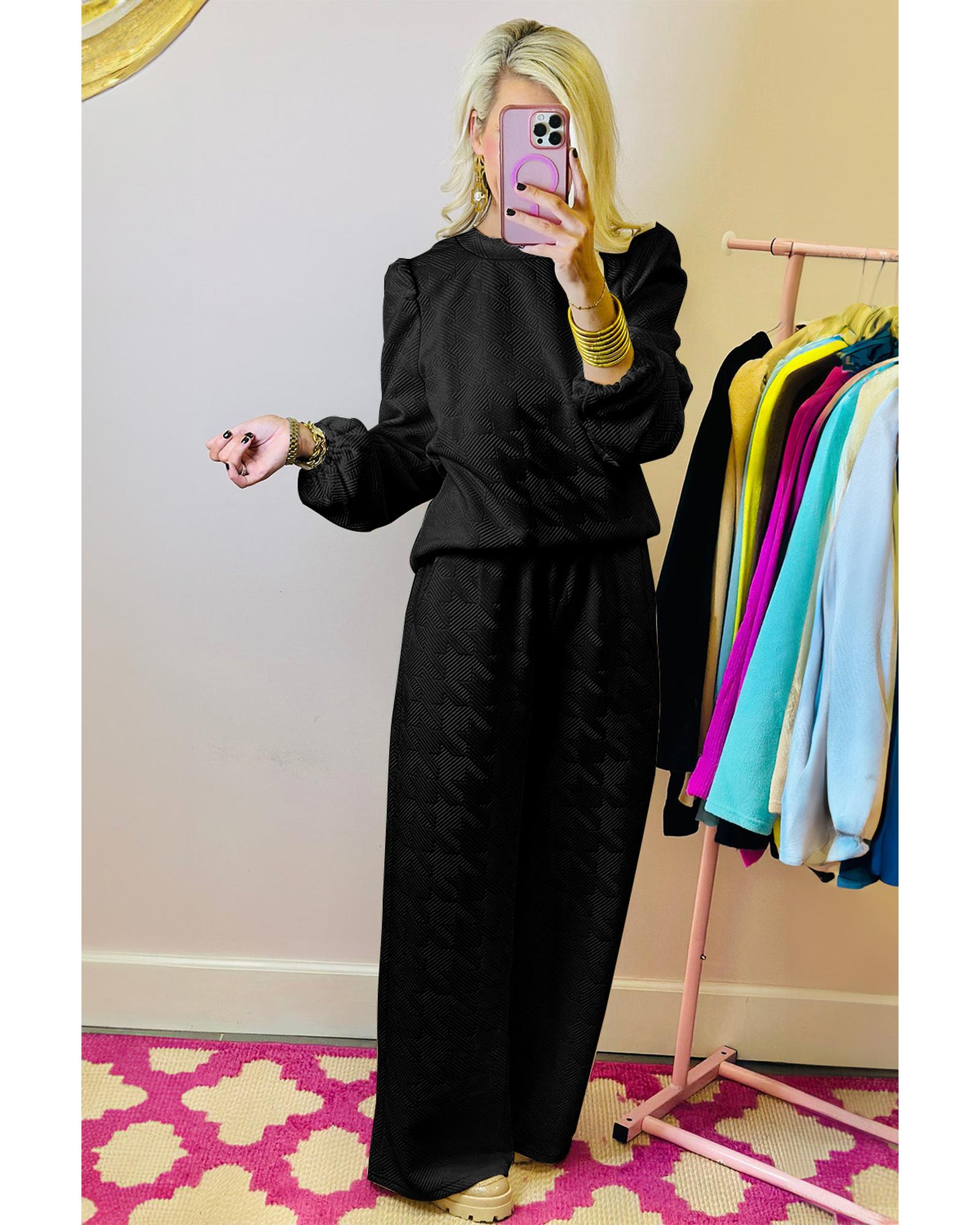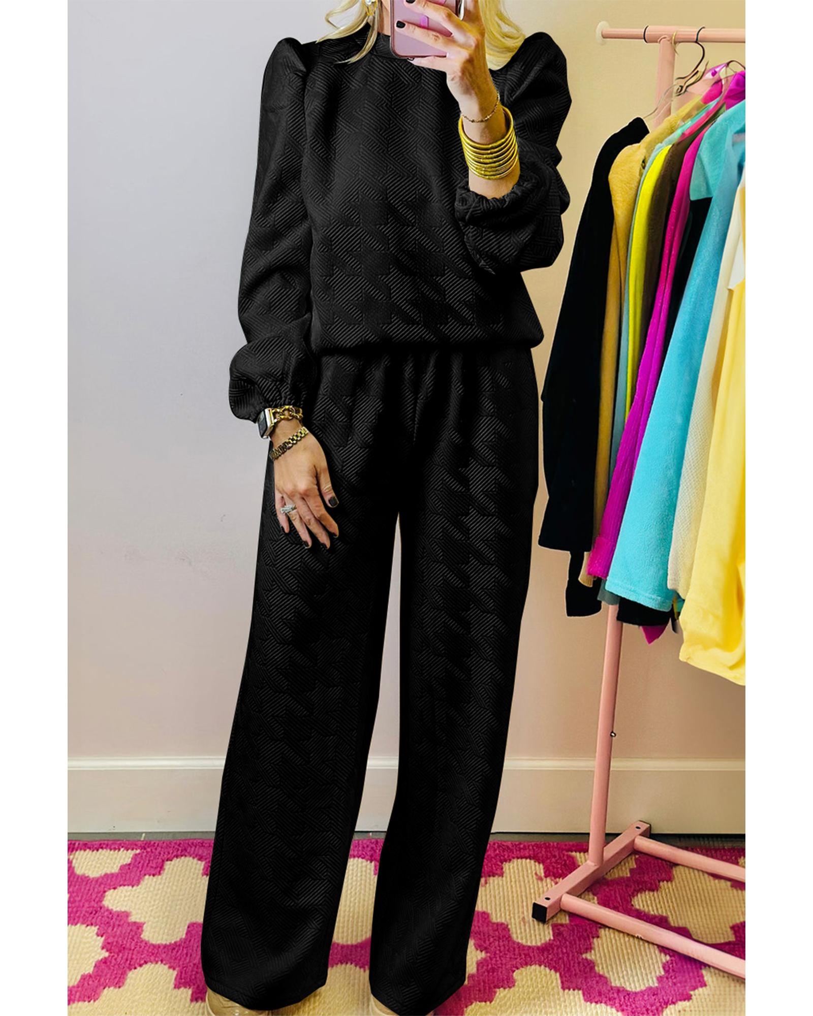 This black textured puff sleeve top and pants set offers a stylish and comfortable outfit option. Designed with a trendy fitted silhouette, it features puff sleeves that add volume and a coordinated look with matching pants. The set provides medium elasticity for a comfortable fit and a neutral design suitable for various occasions.