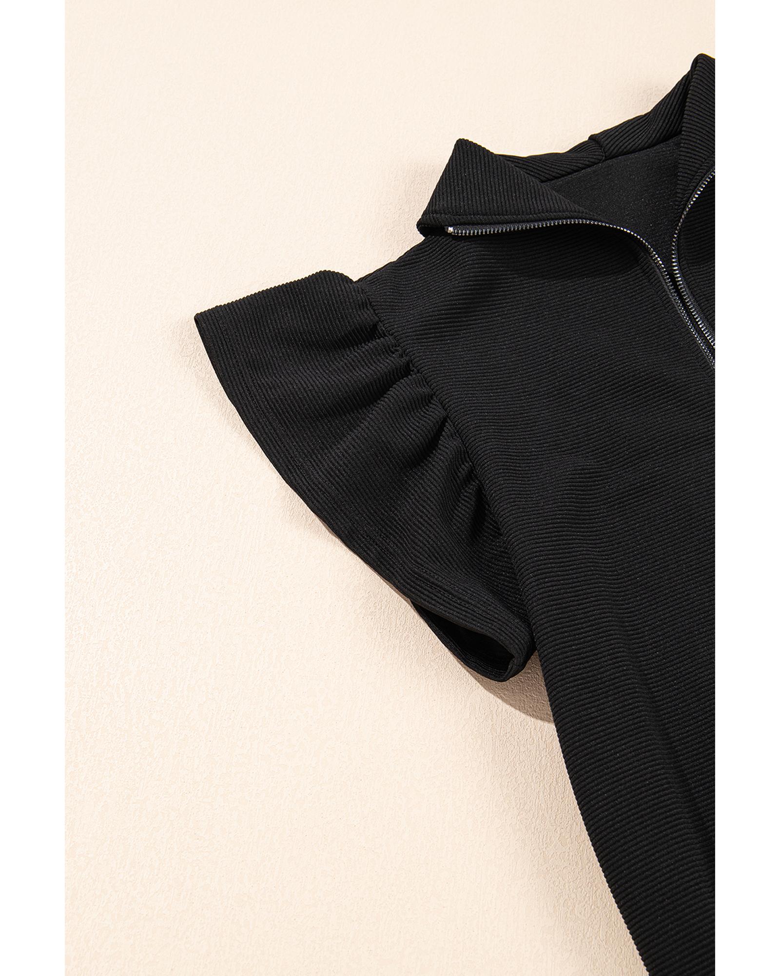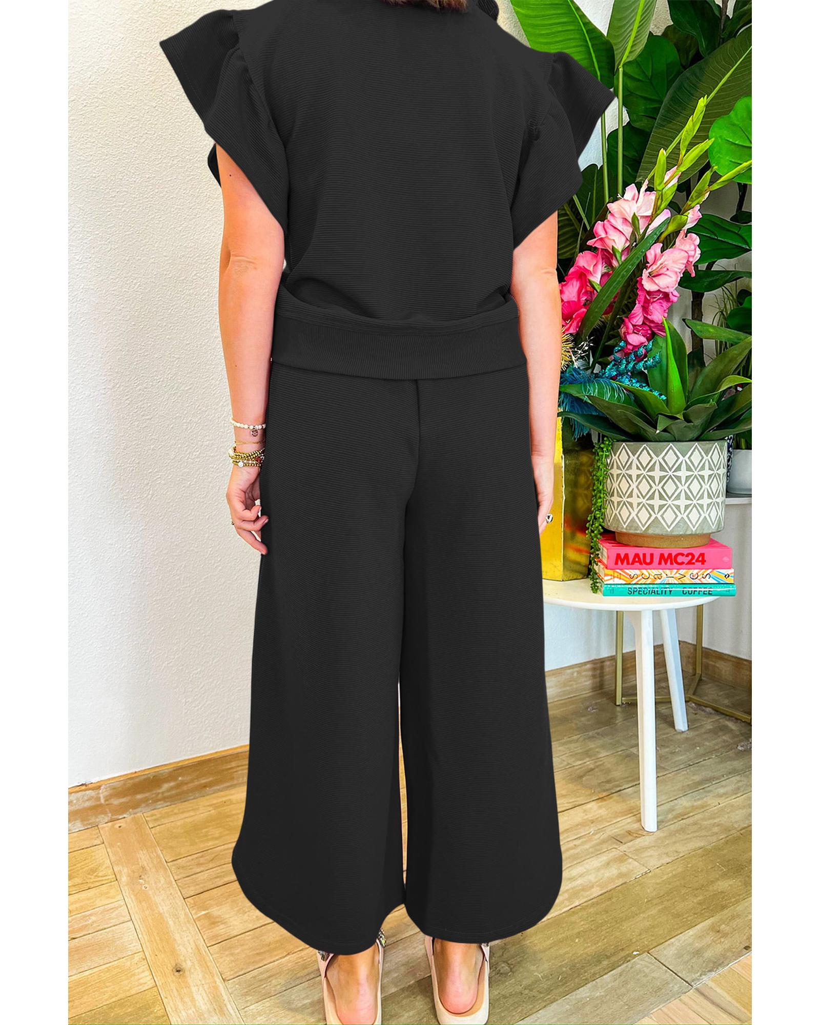 Black Textured Ruffled Sleeve Zipped Top and Wide Leg Pants Set – M