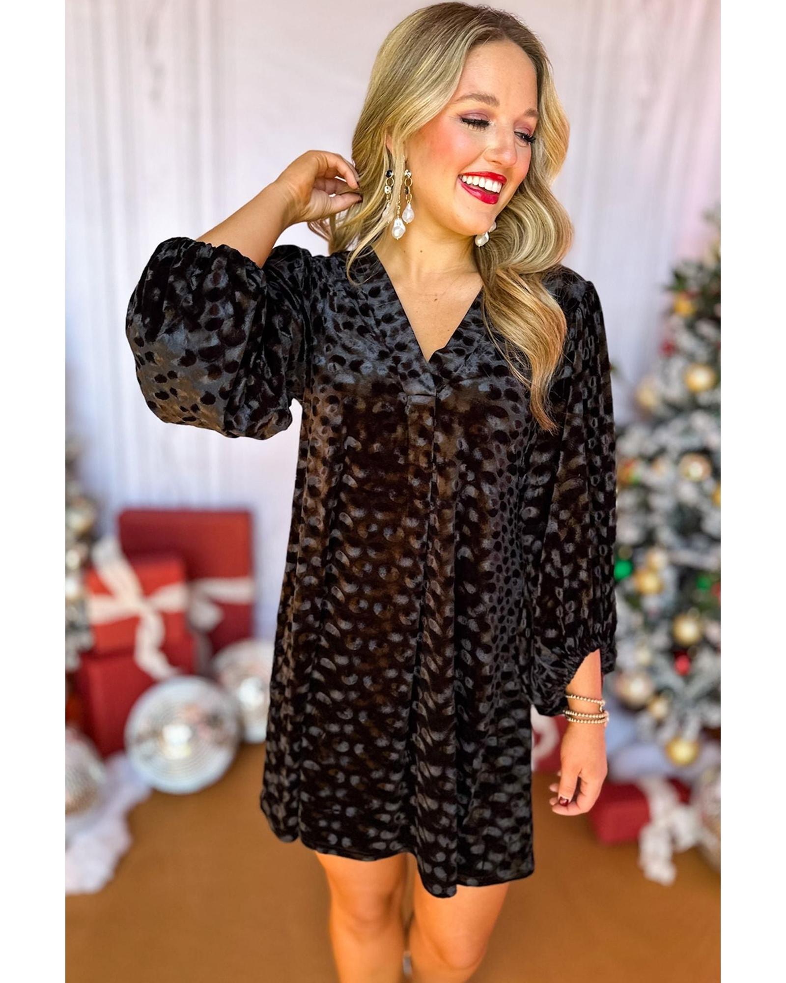This black textured velvet mini dress features a stylish V neckline and balloon sleeves, offering a luxurious and elegant look. Designed with a trendy fitted silhouette, it is ideal for special occasions and evening events.