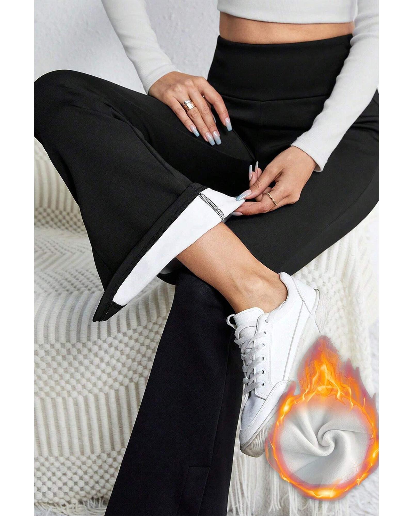These black thermal-lined split flare leg pants are designed for a trendy fitted look, combining style and warmth. They feature a high waist for easy wear and a flare leg with a slit, making them both fashionable and comfortable. Crafted with high elasticity, these pants are suitable for various body types and provide a cozy fit.