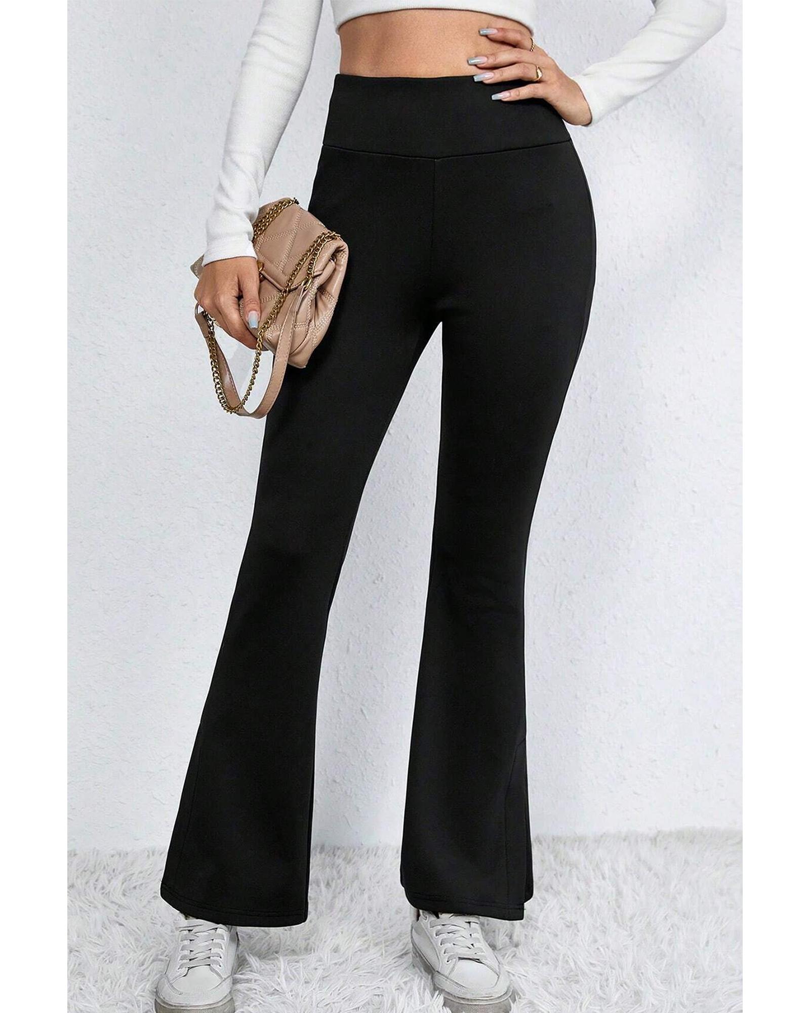 These black thermal-lined split flare leg pants are designed for a trendy, fitted look with a high waist for easy wear. They are crafted to keep you warm and comfortable, making them ideal for colder weather.