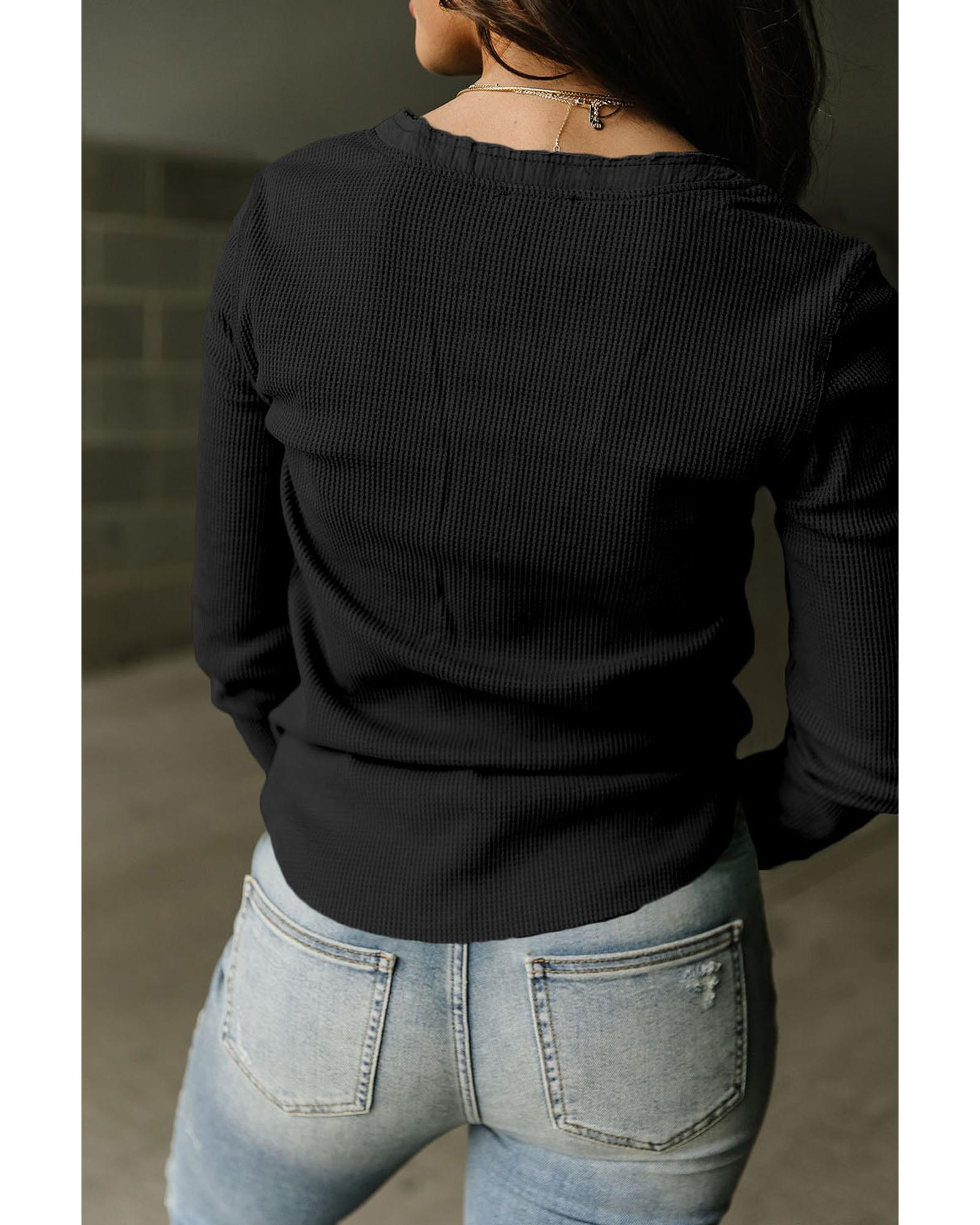 Black Trimmed Neckline Waffle Knit Henley Top – S