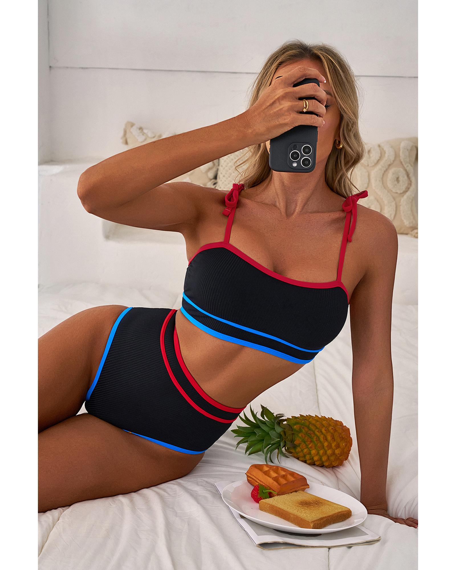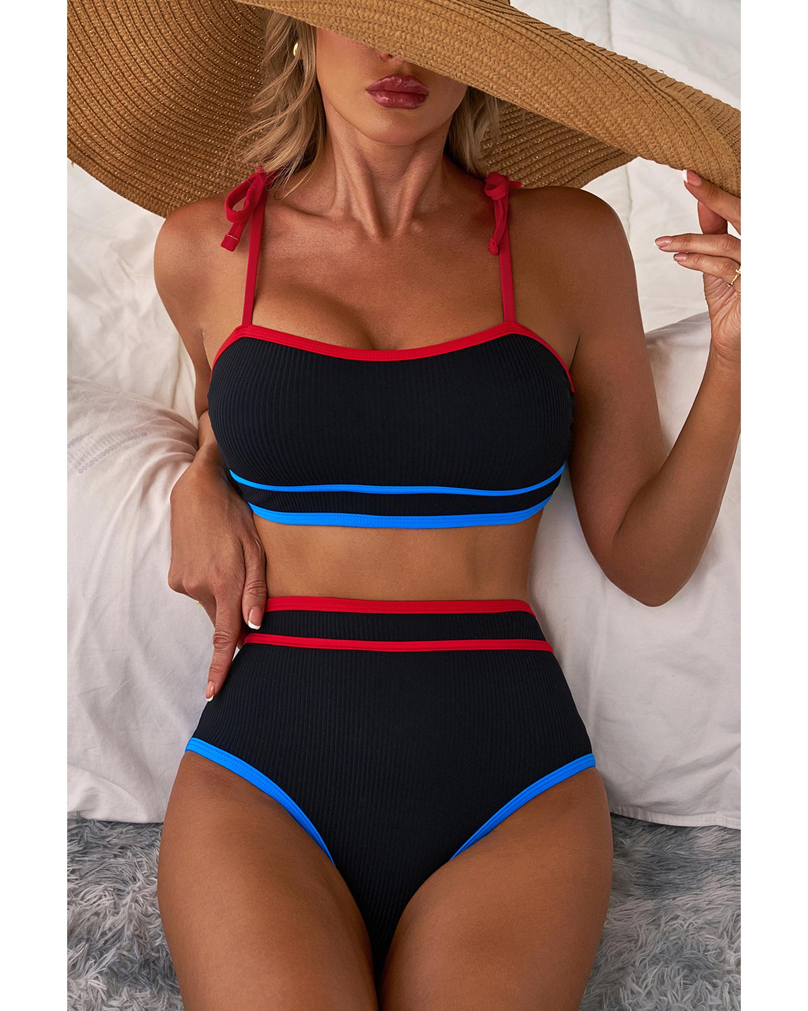 This high waist bikini set features a stylish design with triple color trims and unique knot straps, offering a flattering fit and a fashionable look. Made from a comfortable and stretchy ribbed fabric, it is suitable for various beach or poolside occasions.