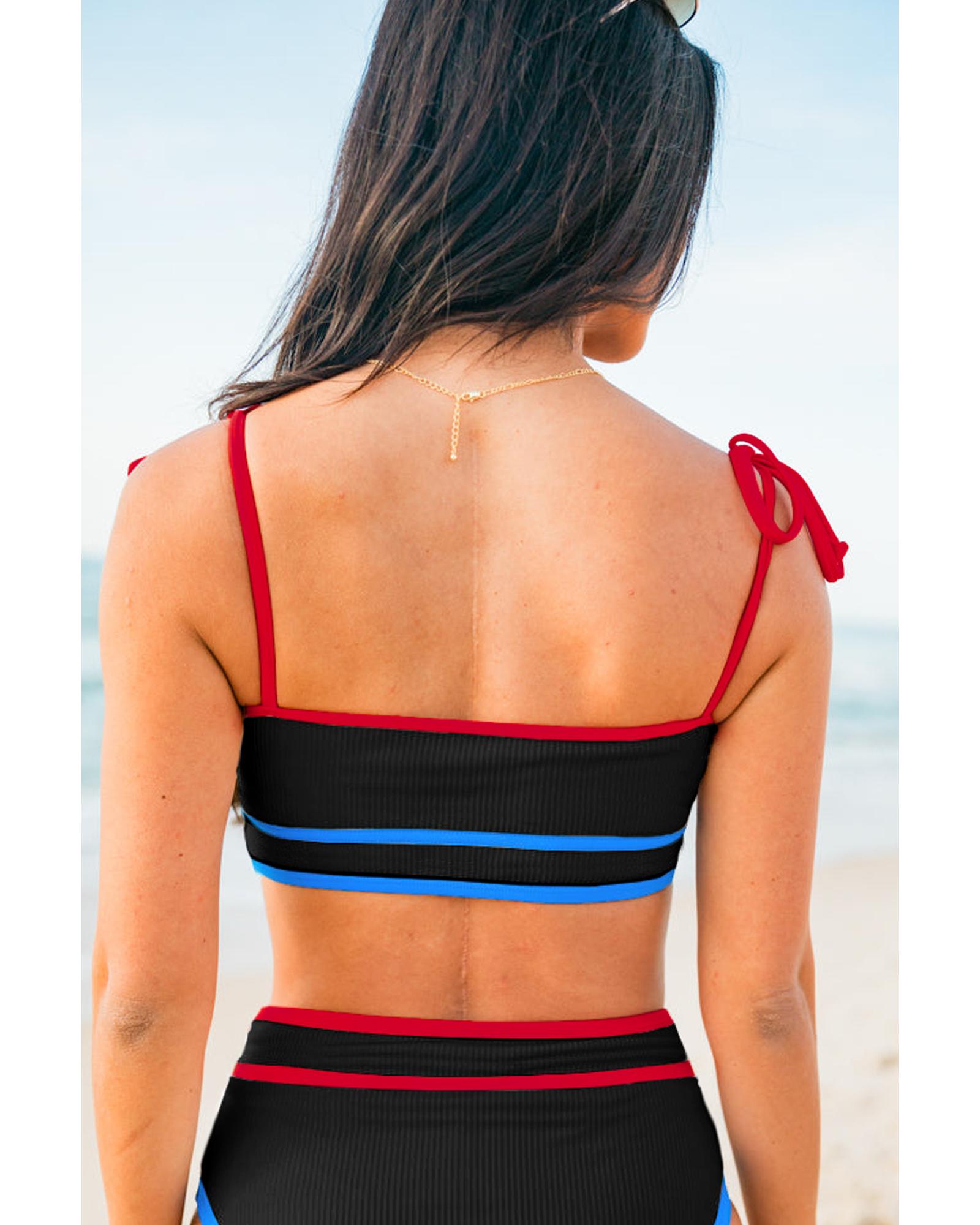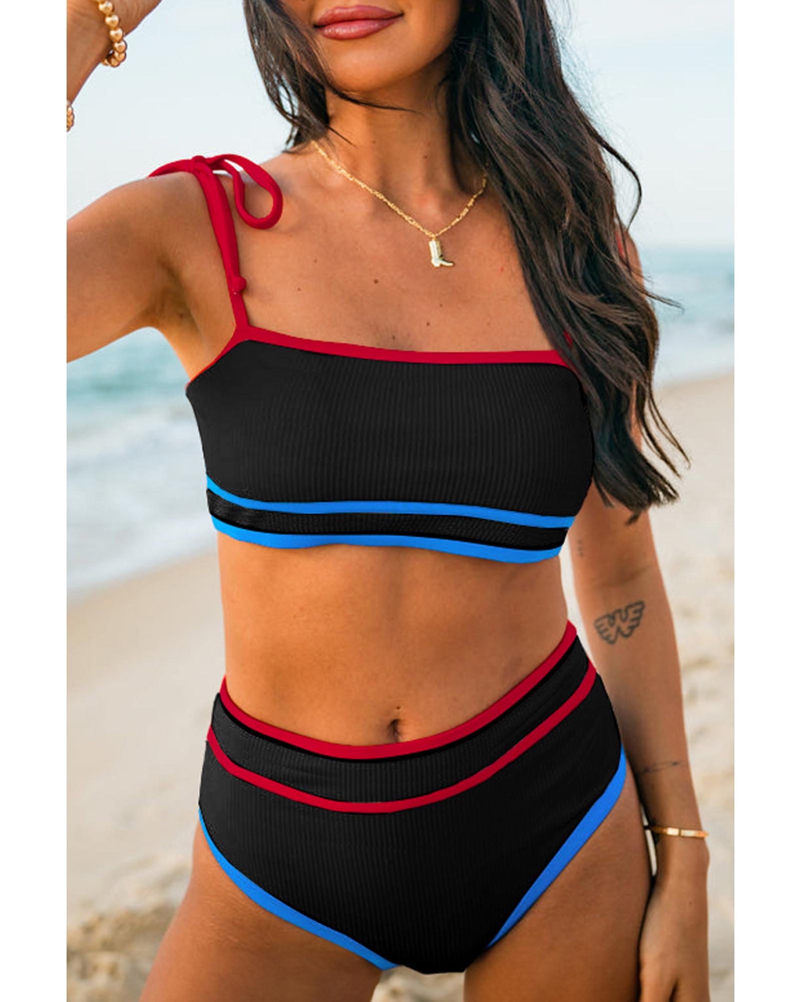 This high waist bikini set features a stylish design with triple color trims and unique knot straps, offering a flattering and comfortable fit for your swimwear collection. The ribbed texture adds a trendy touch, making it suitable for various beach or poolside occasions.