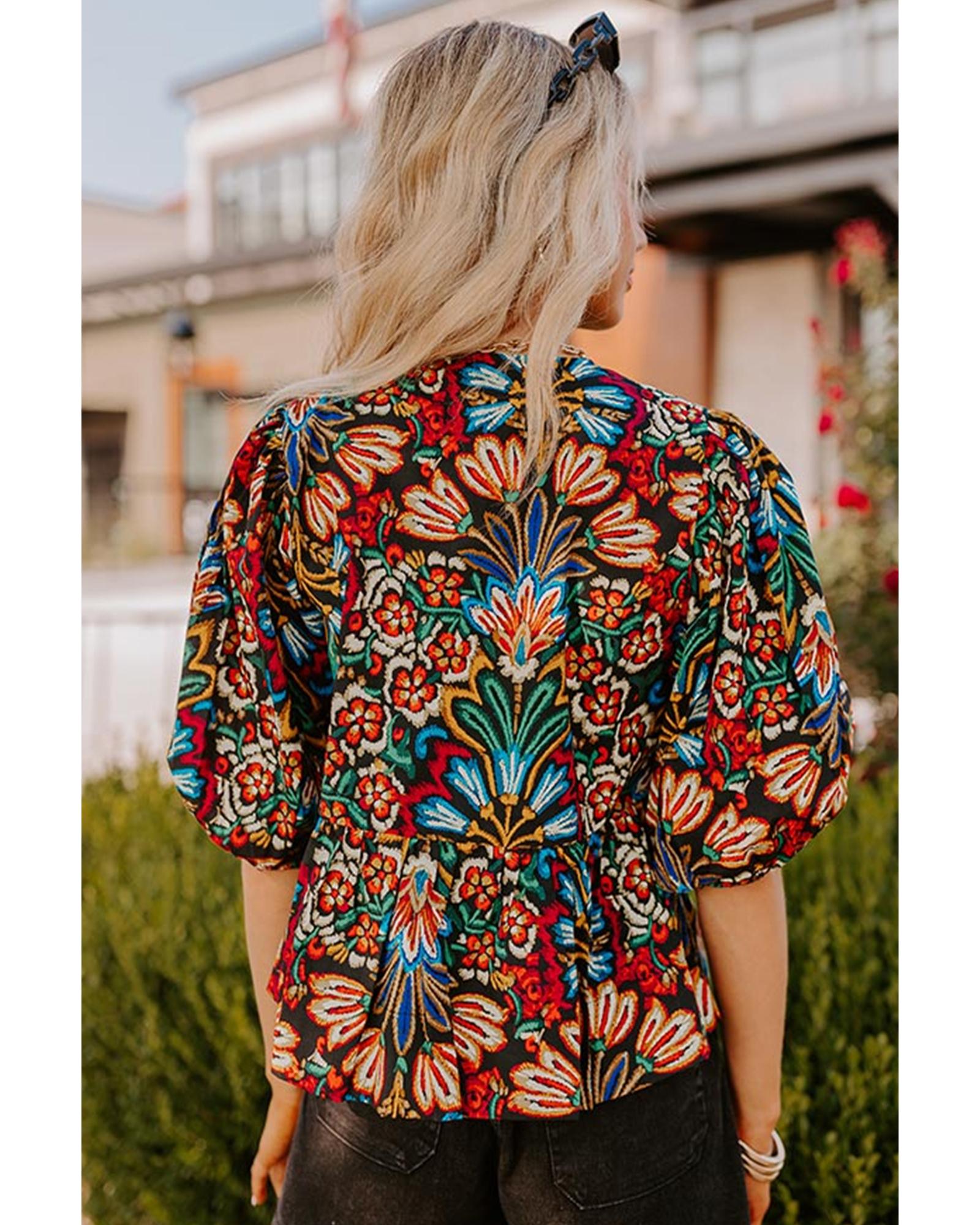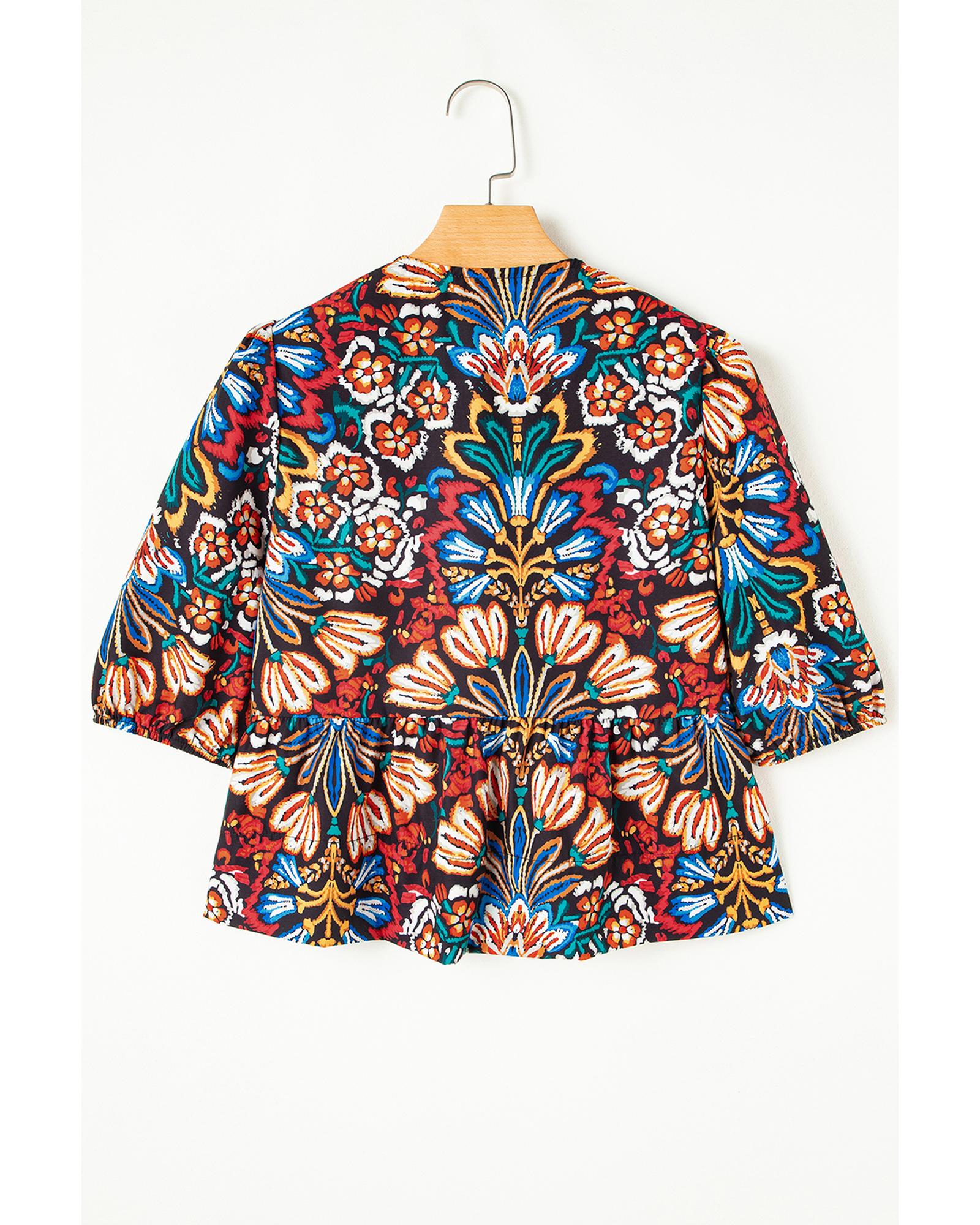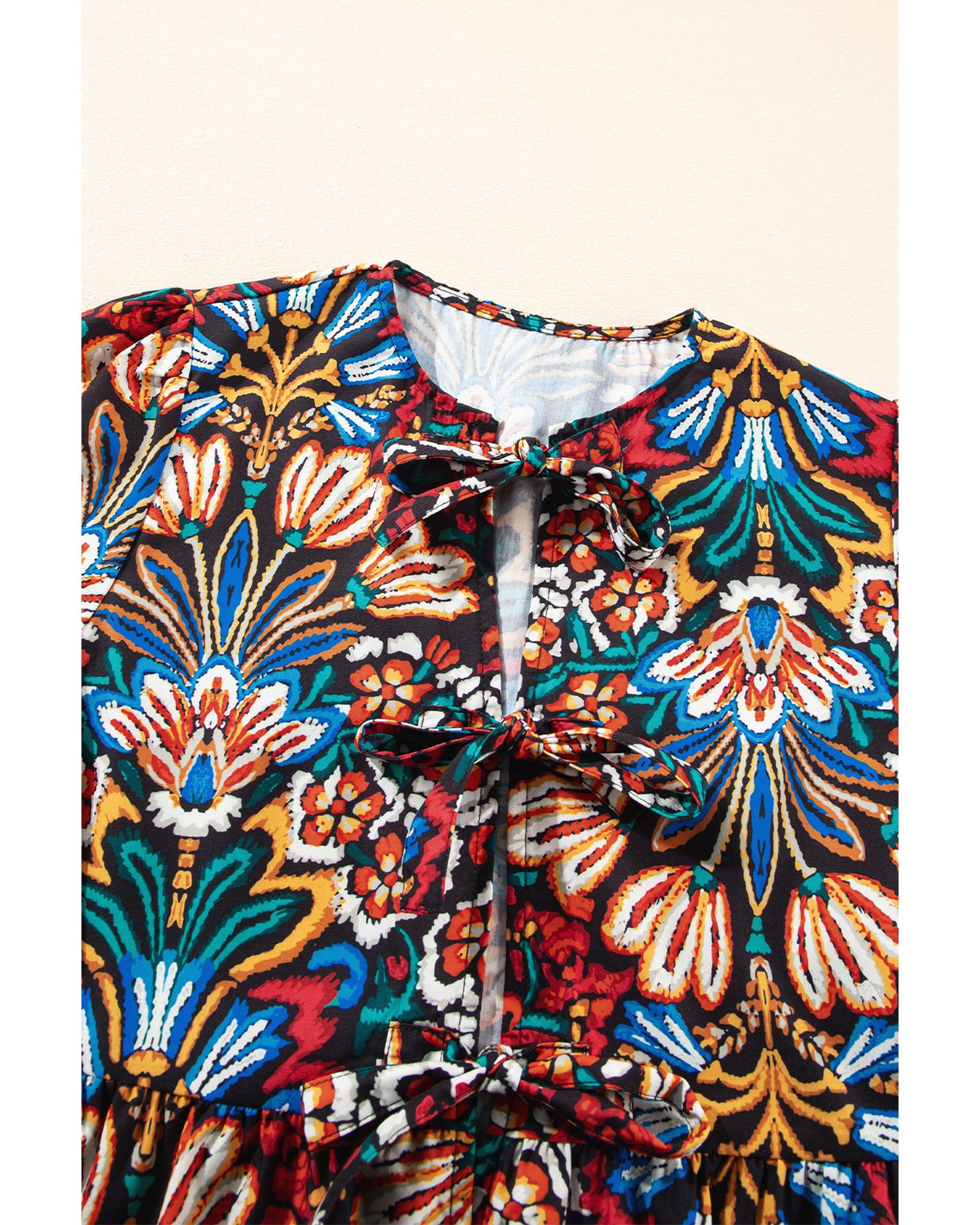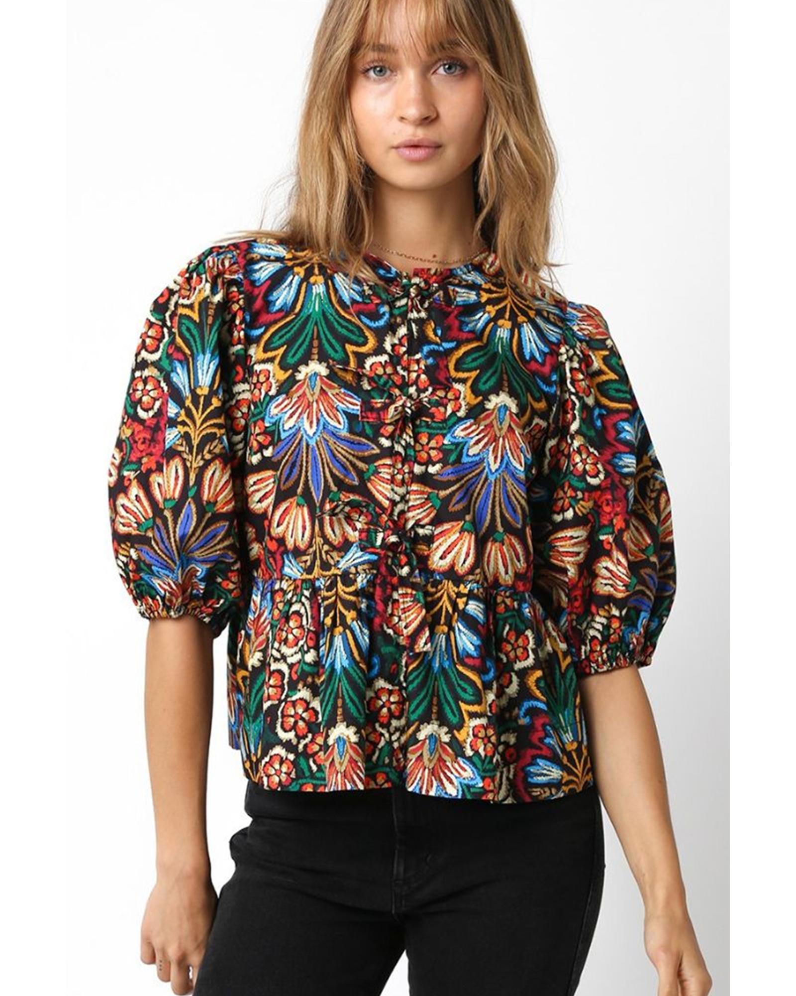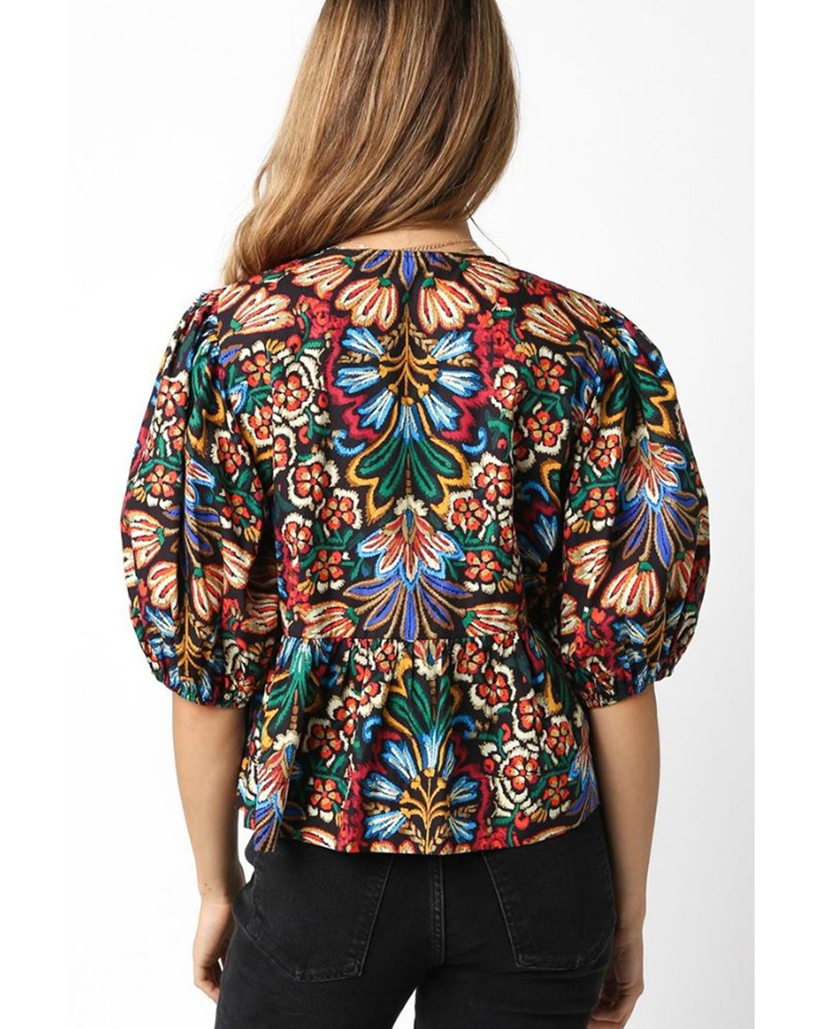 This tropical print blouse features a playful and trendy design with bubble sleeves and a knot front detail. Its vibrant pattern and flattering silhouette make it a versatile addition to any wardrobe, suitable for pairing with various bottoms for a stylish look.