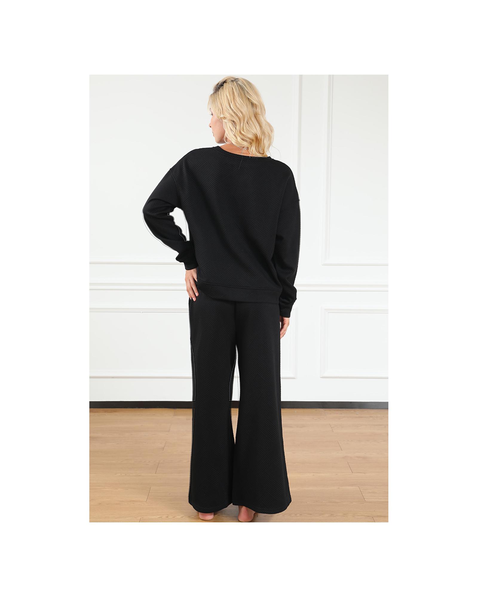 This black ultra loose textured outfit offers a comfortable and stylish casual look. Designed with a trendy oversized fit, it is perfect for relaxed wear at home or casual outings. The set includes a long-sleeved top and wide-leg pants with drawstrings, crafted from a soft, textured fabric for added style and comfort.