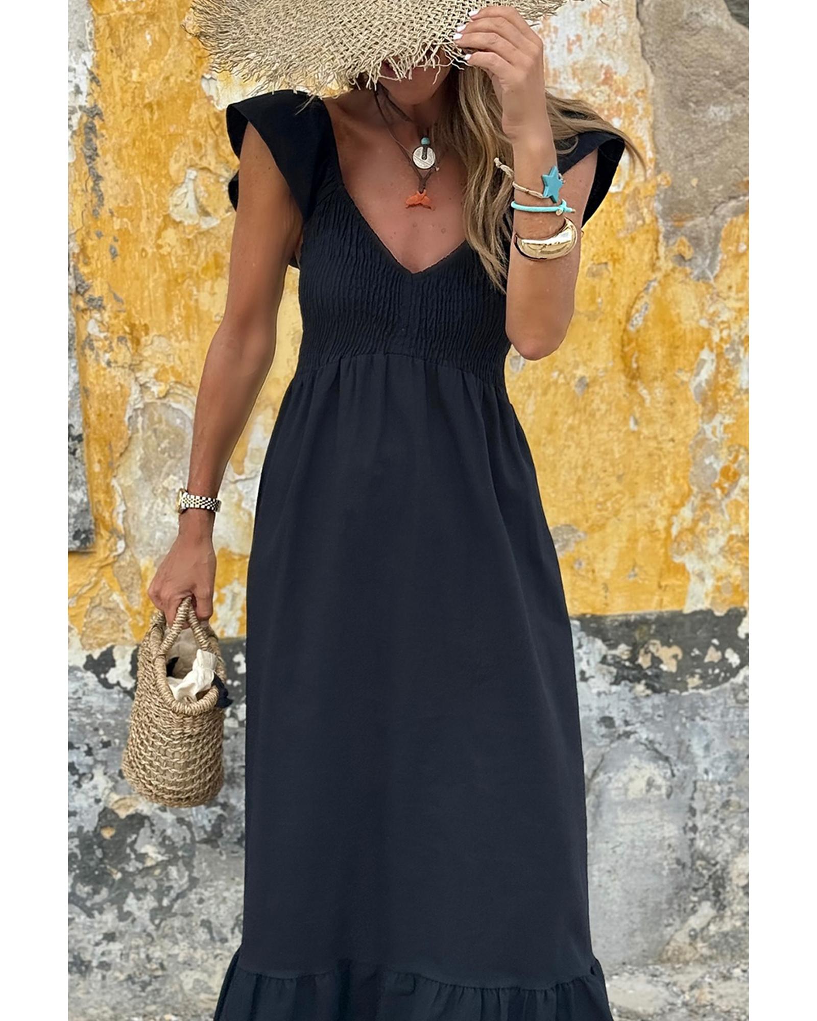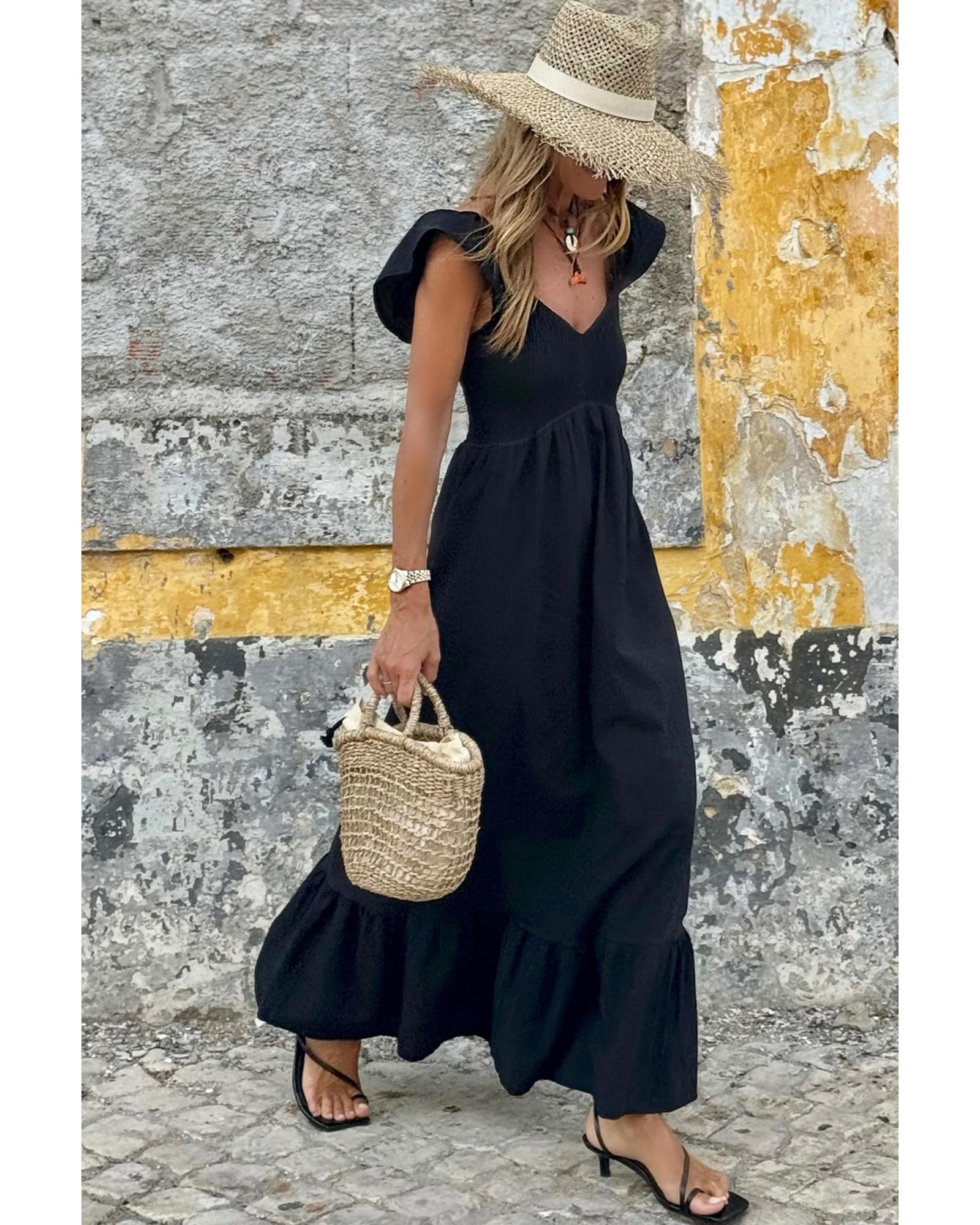 This black V-neck maxi dress features a stylish and feminine design with flutter sleeves, a smocked bodice, and a high waist. The ruffle details add a charming touch, making it suitable for various occasions. Crafted from 100% cotton, it offers comfort and breathability.