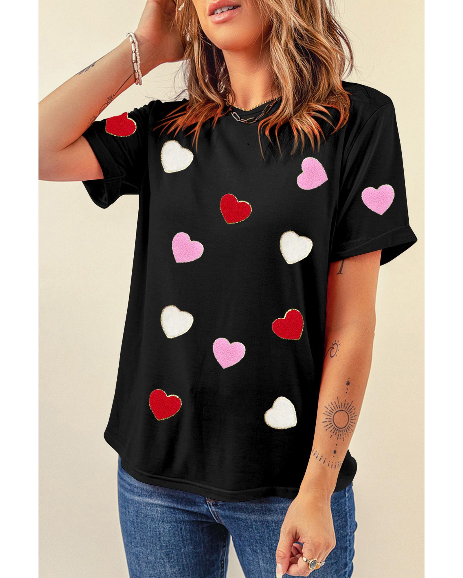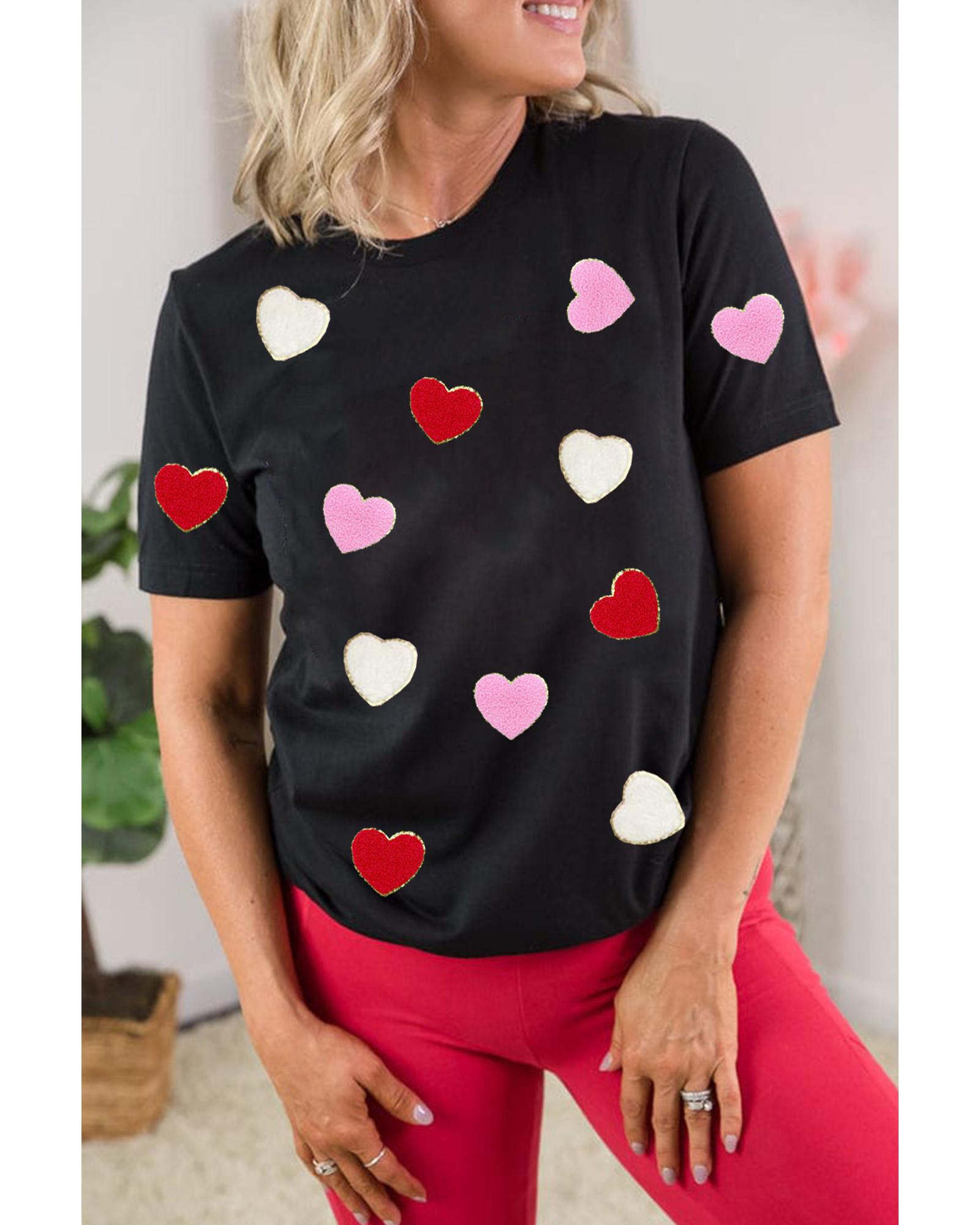 Black Valentines Chenille Heart Patched Pattern Crewneck Tee – 2XL