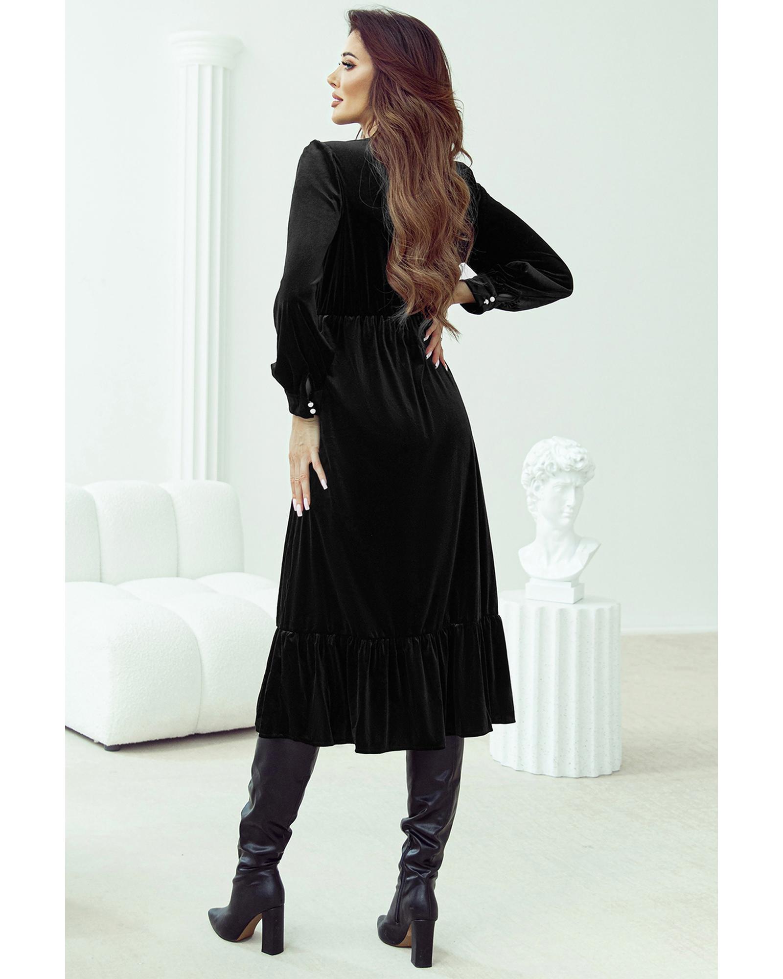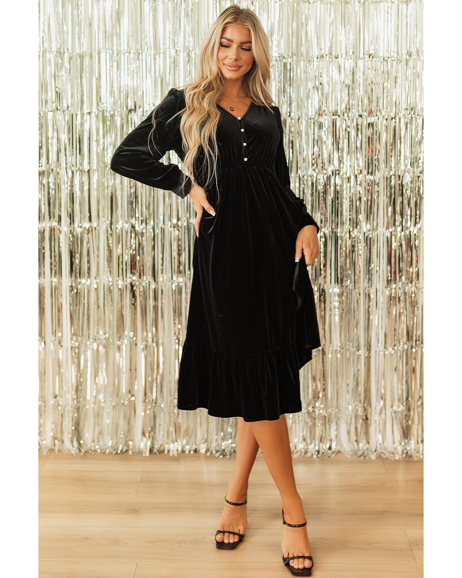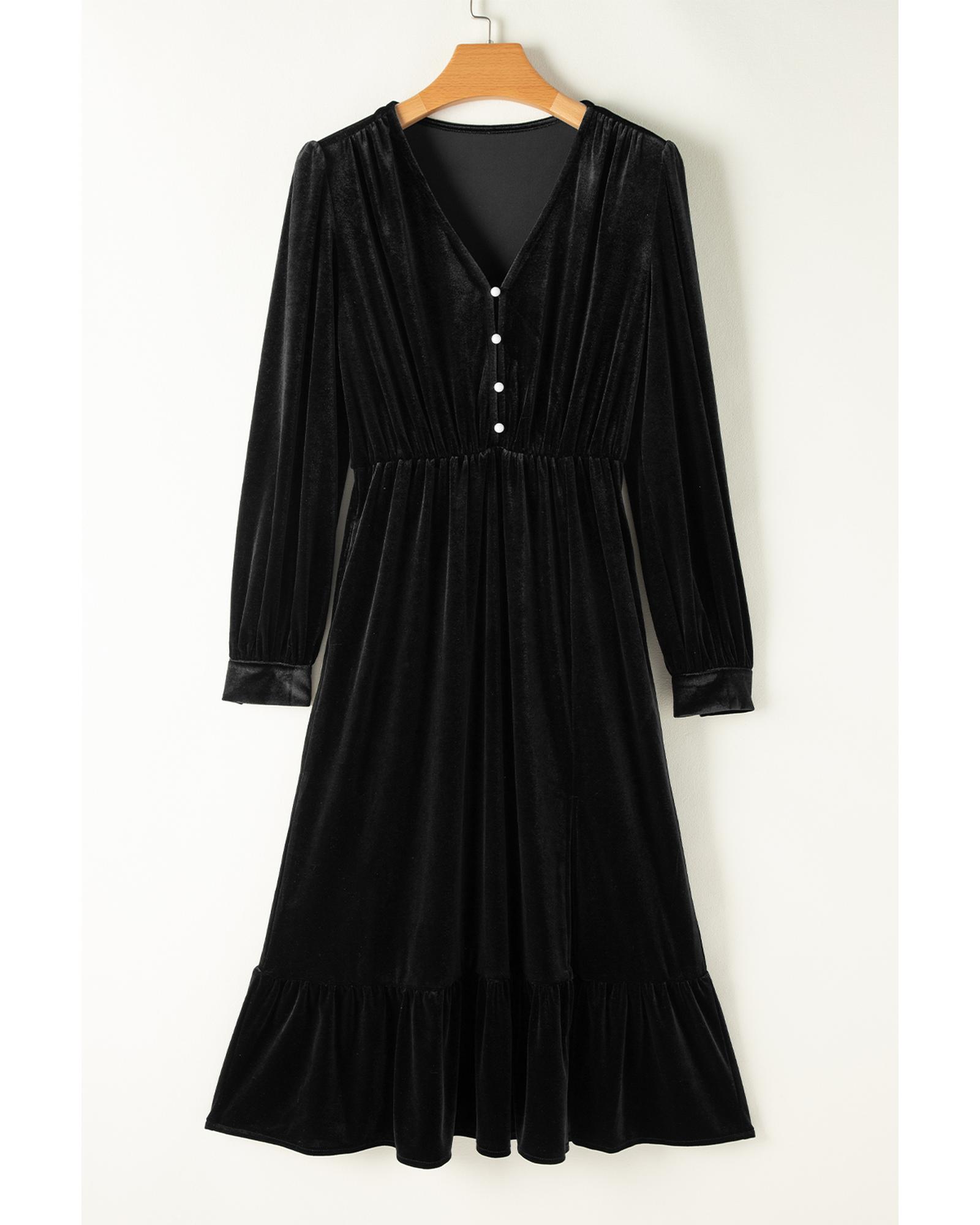 This elegant midi dress features a luxurious velvet fabric with a sophisticated design. It combines a trendy fitted silhouette with stylish details, making it suitable for formal and semi-formal occasions. The dress offers a feminine look with its puff sleeves, buttoned V neckline, and a delicate ruffled hemline with a flattering split.
