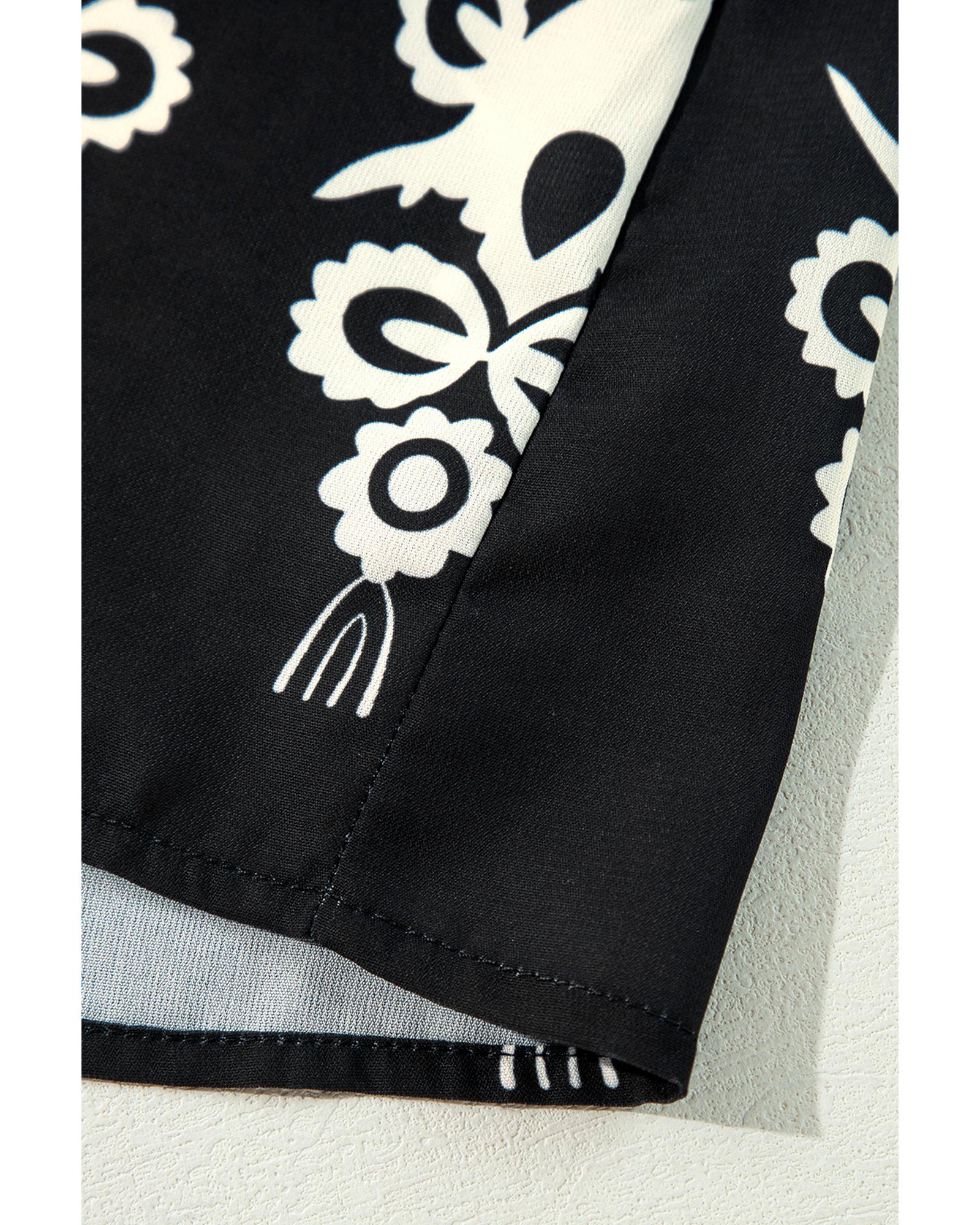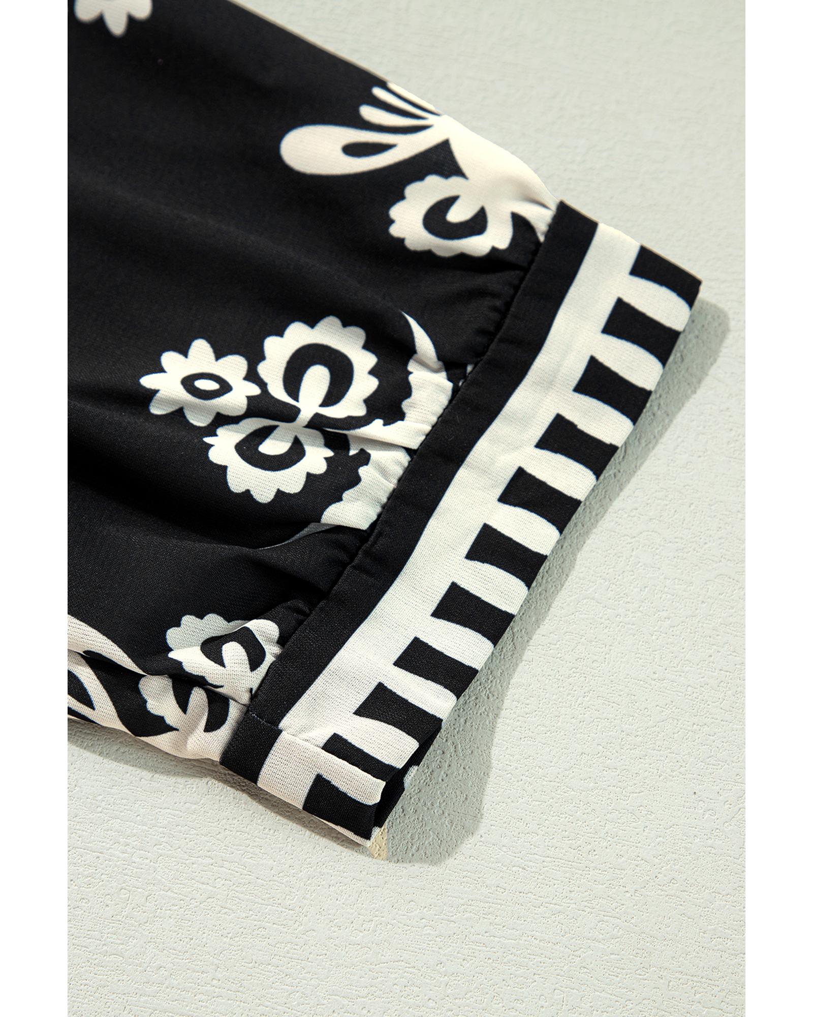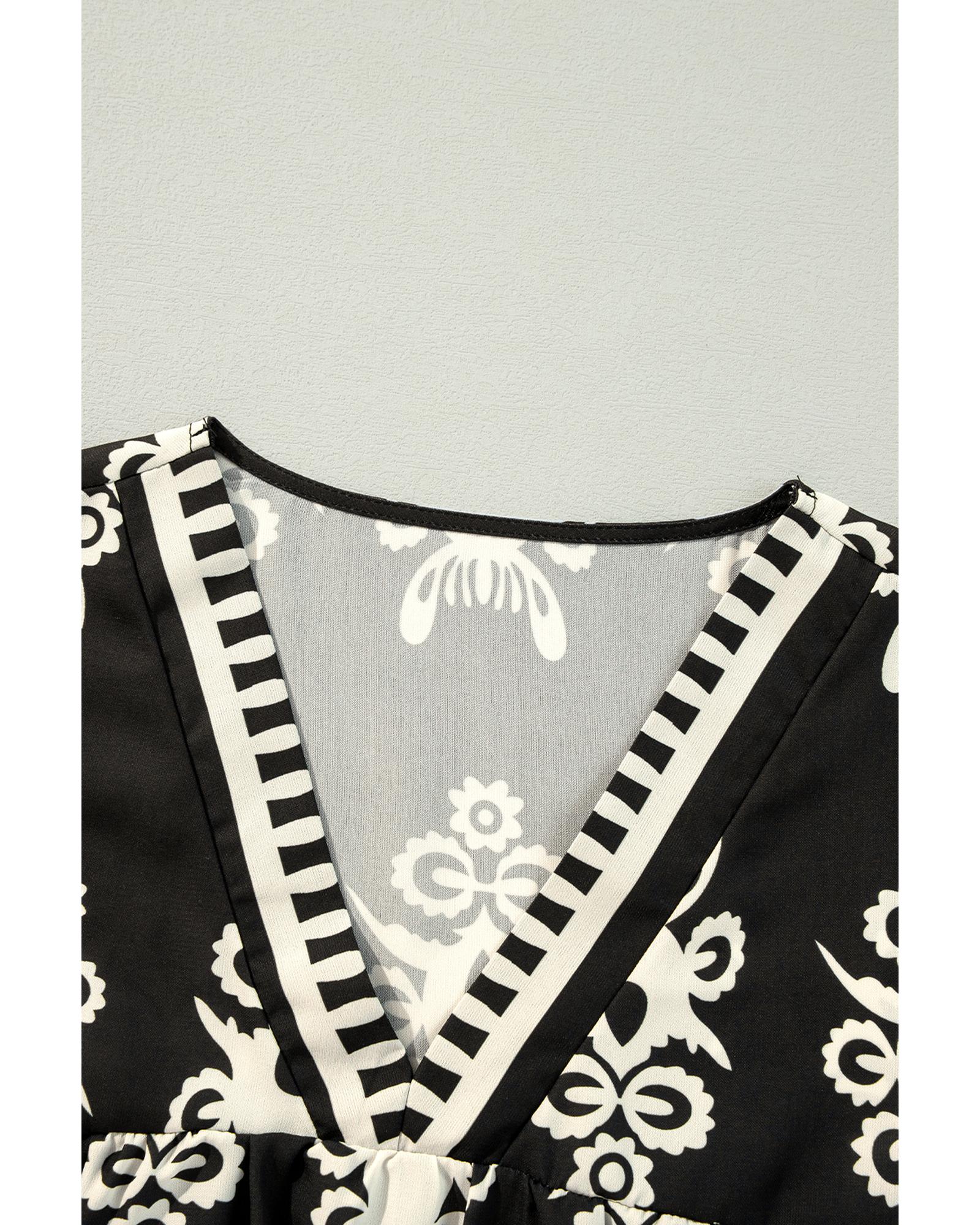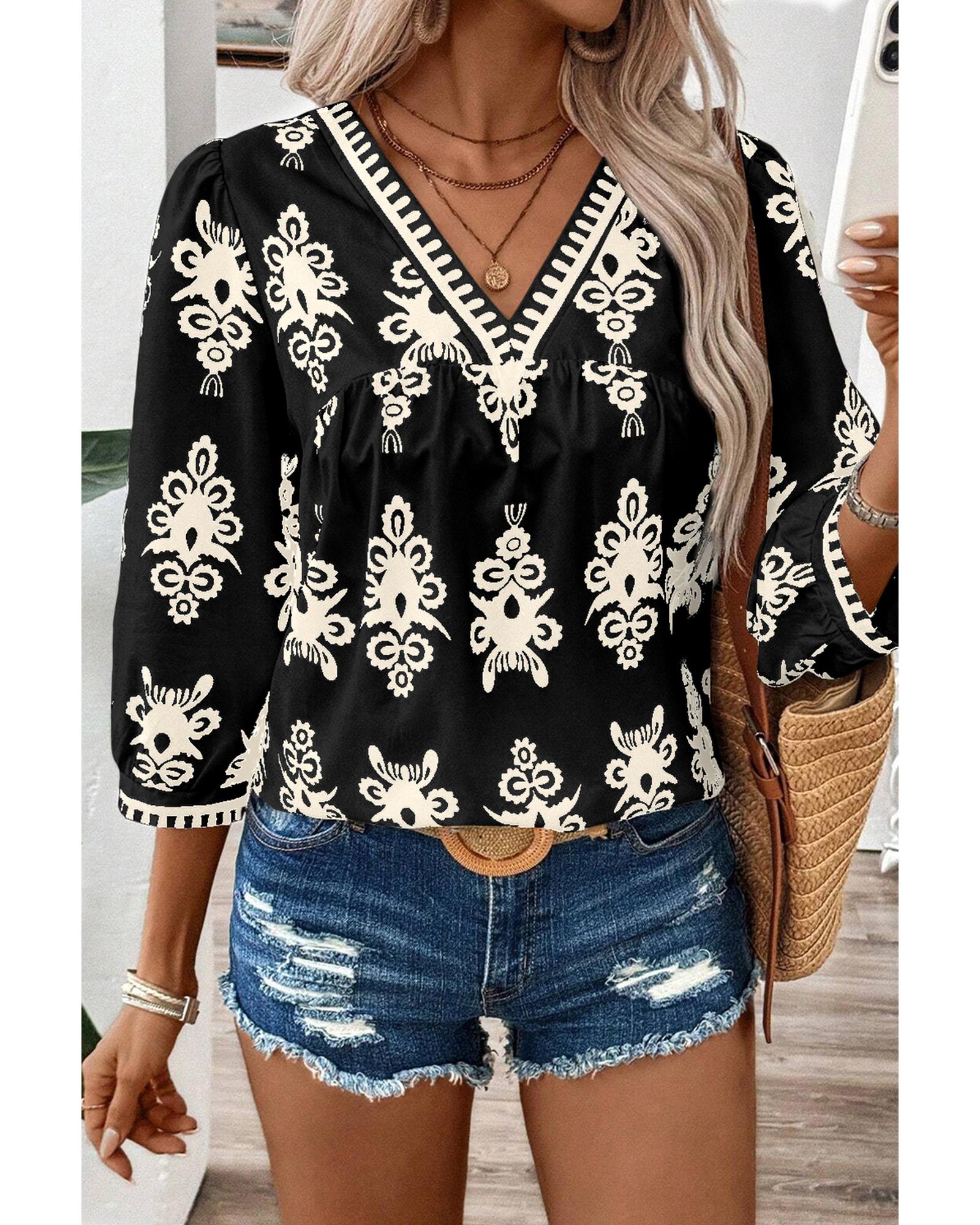 This black vintage geometric printed blouse features a stylish design with a V-neck and 3/4 sleeves. Its unique geometric pattern adds a touch of sophistication and charm, making it a versatile addition to your wardrobe. The blouse pairs well with jeans, leggings, or shorts for various casual or semi-formal looks.